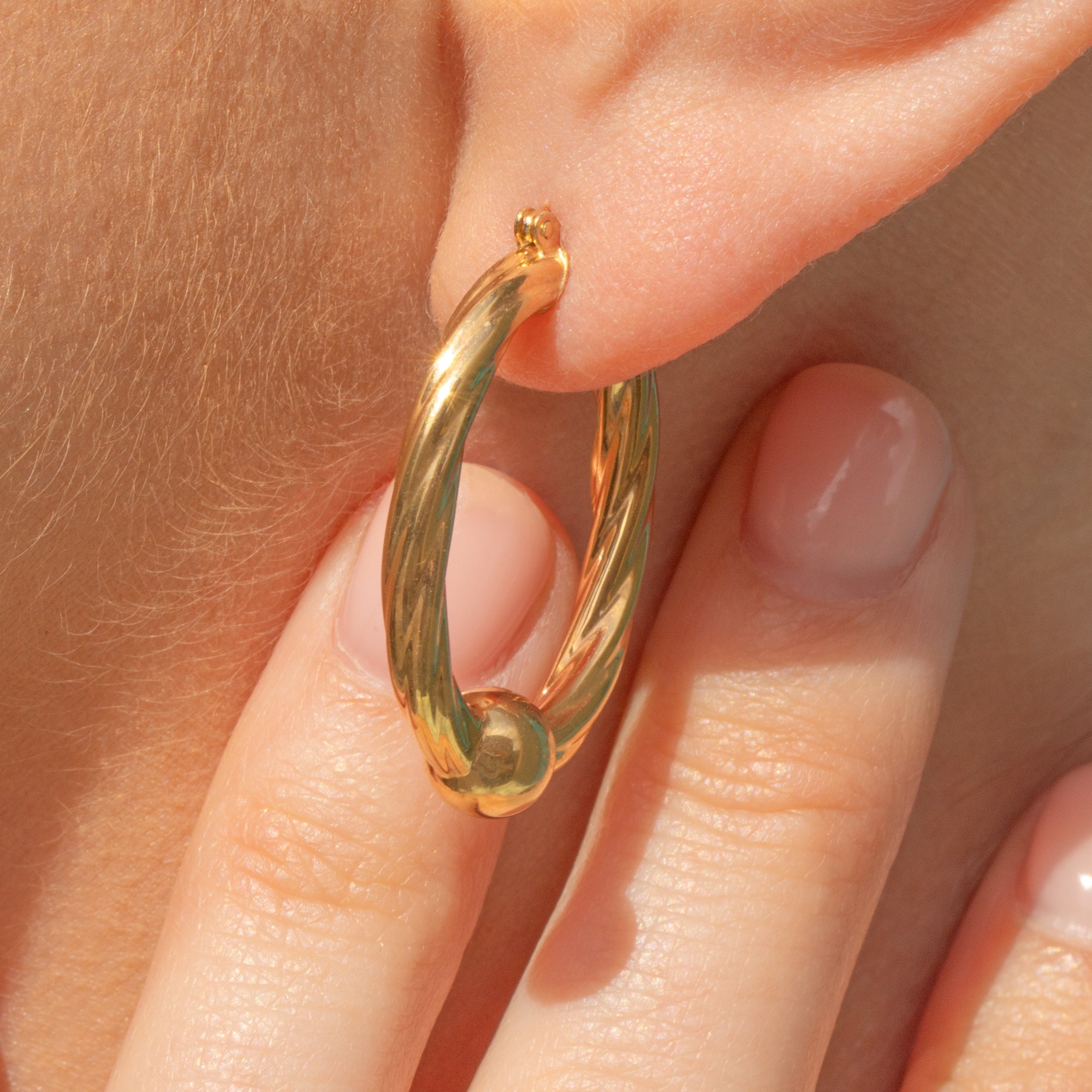 A feast for the eyes, these 9ct Gold twisted hoop earrings epitomise elegance! Crafted entirely from buttery 9ct Gold, they flaunt a lightly dappled texture, complimented by the silky smoothness of their Gold ribbon rippling around your earlobes.
