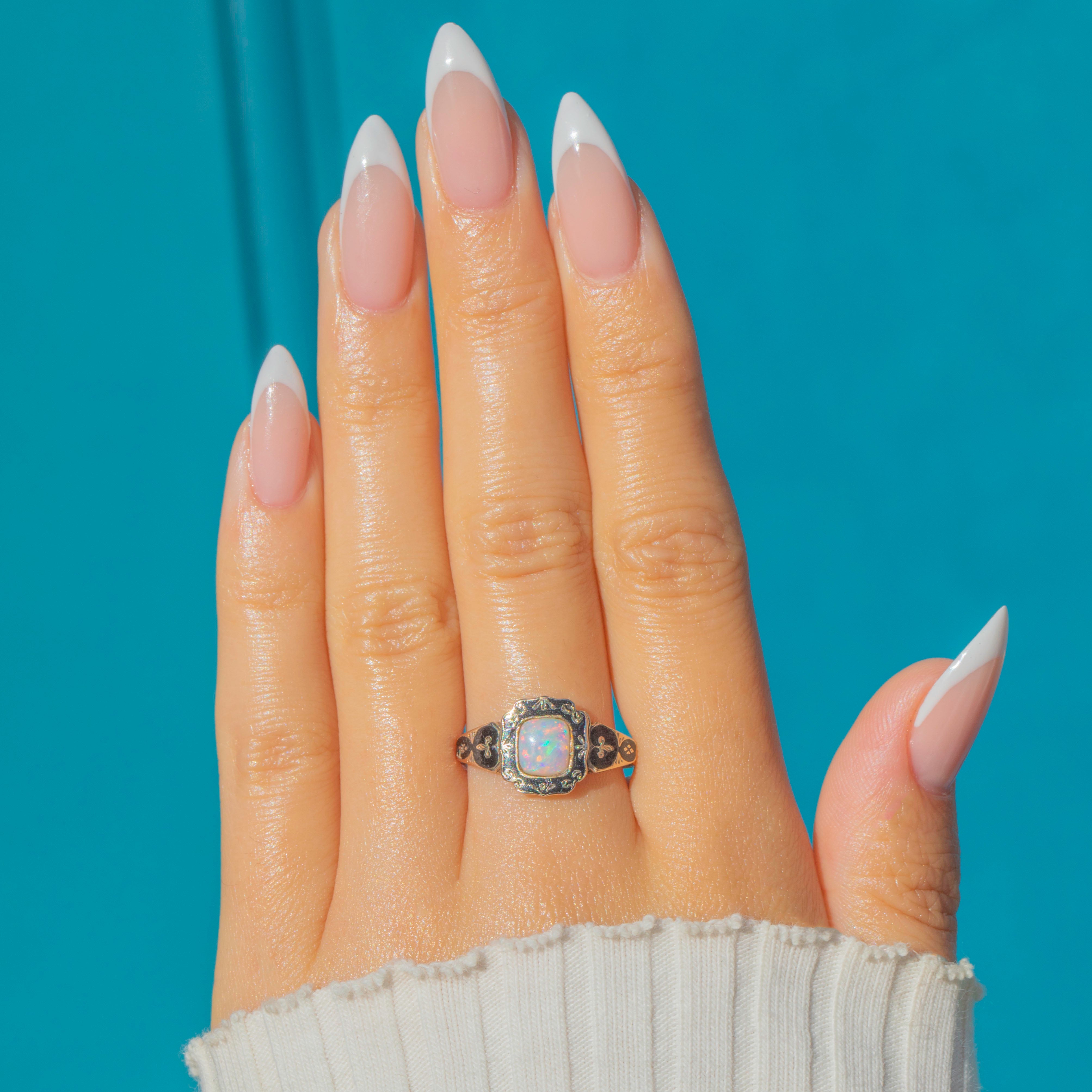 Originally intended for mourning (likely with a hair or glass panel), the ring has been sympathetically updated with an Opal, creating a wearable jewel that still speaks to its history.