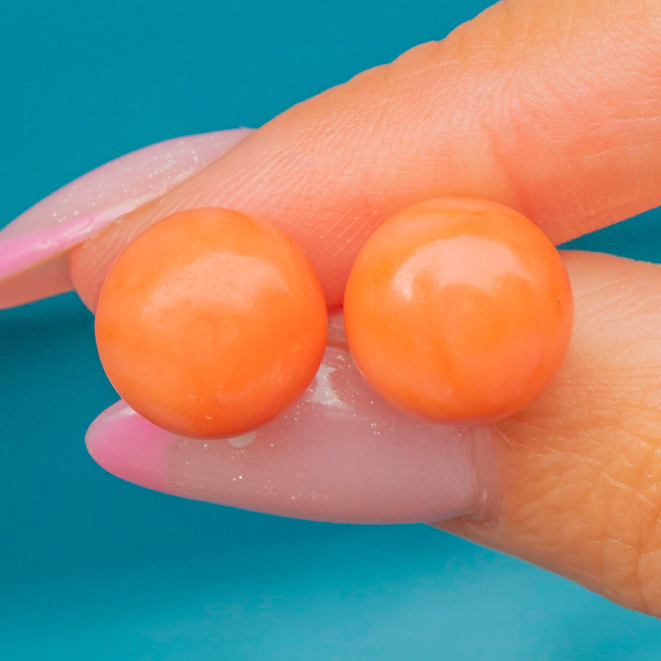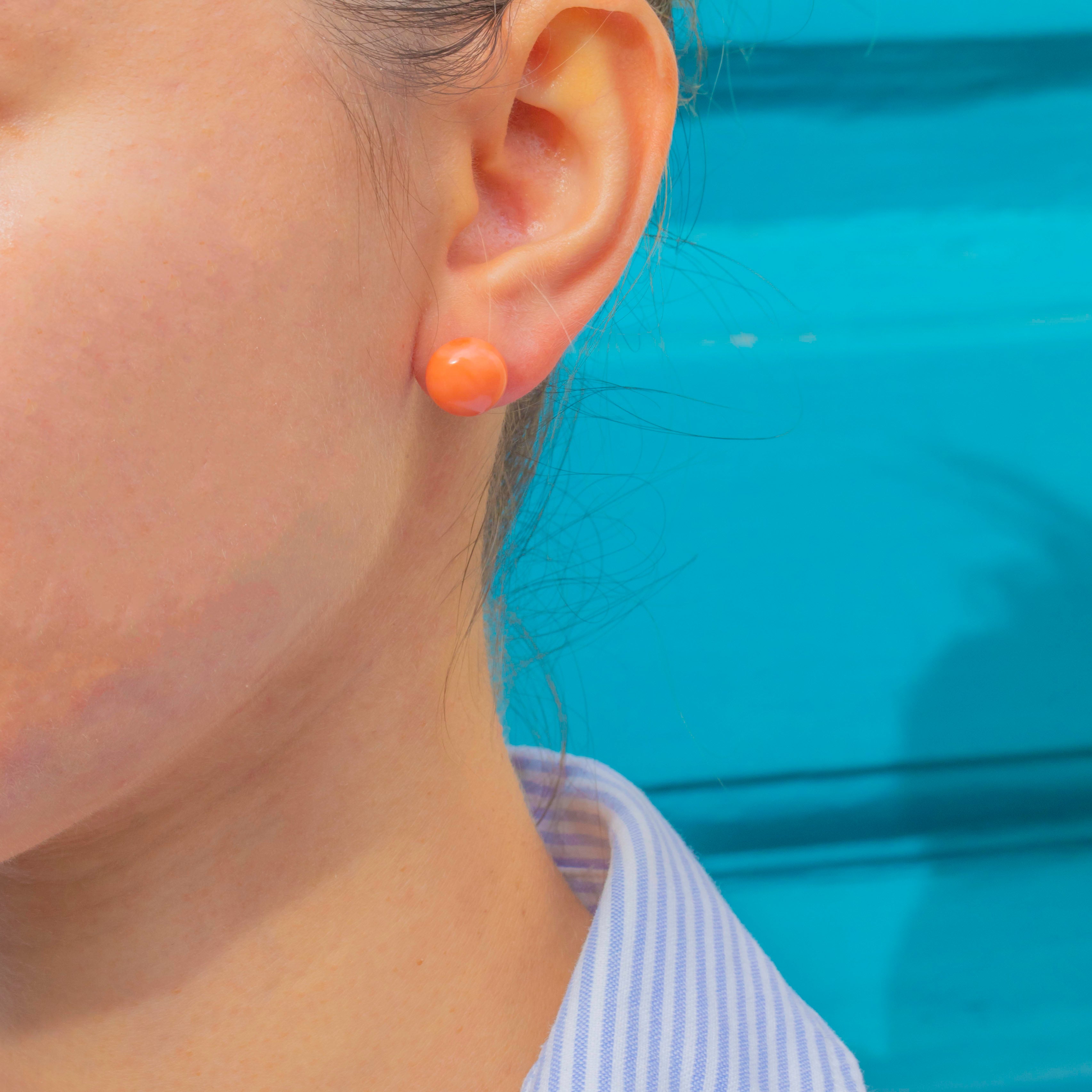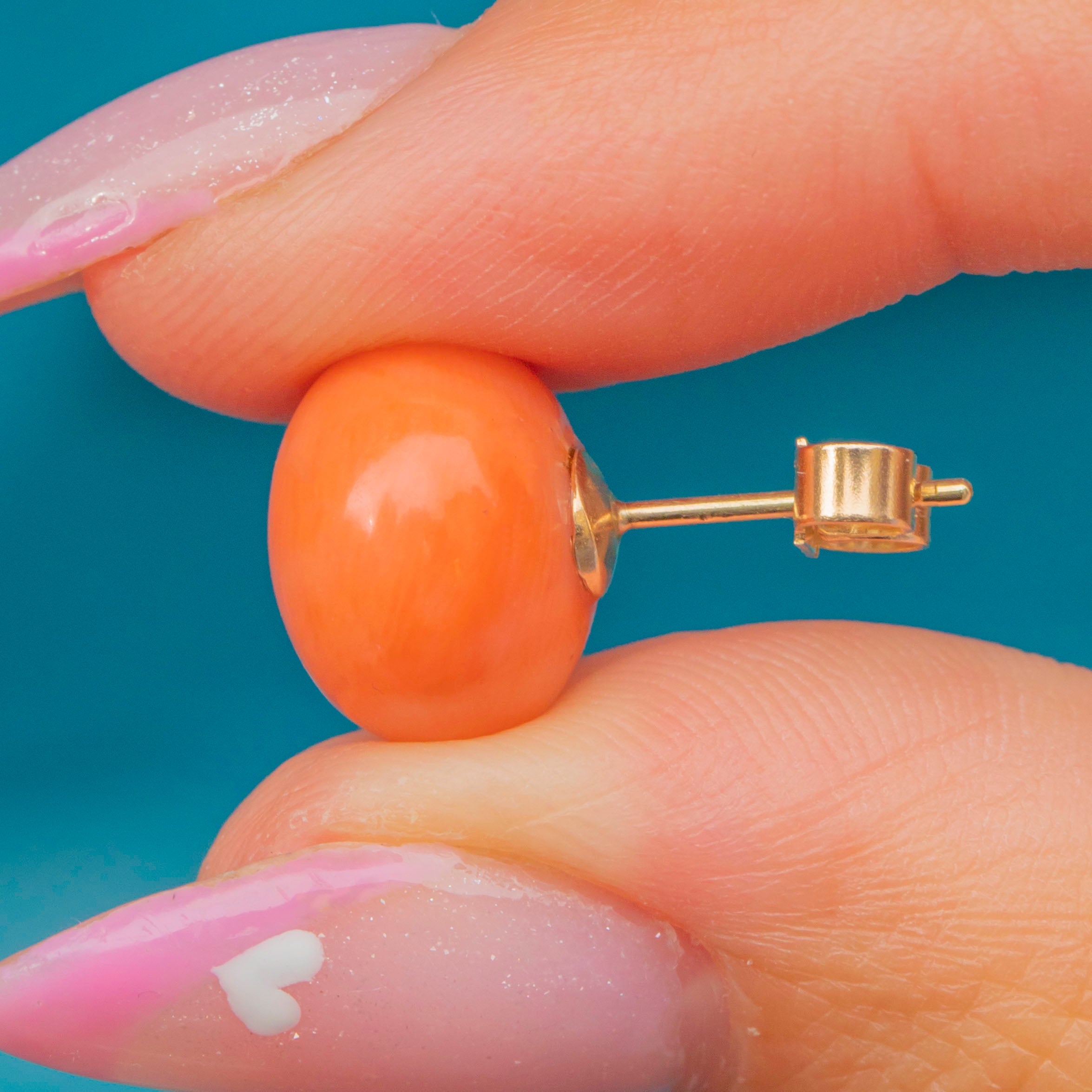 EXCELLENT: The Corals are beautifully preserved with no chips or cracks. The Gold settings and posts are in superb condition with minimal surface wear, suggesting the pair has been very well cared for over the years.