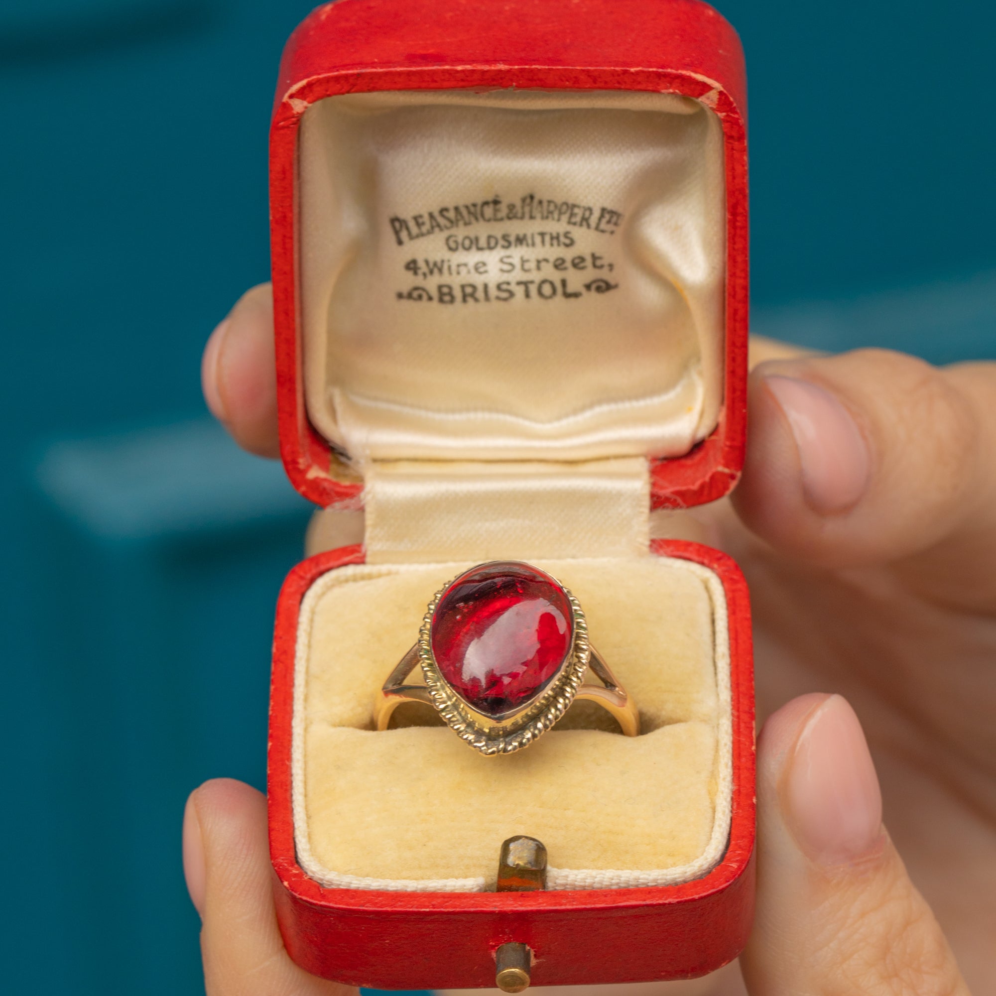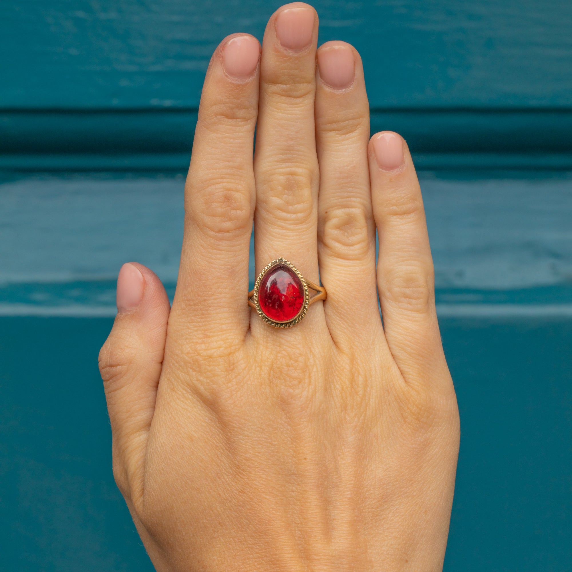 Make a statement wherever you go with this eye-catching 9ct Gold Victorian Garnet cabochon pear ring adorning your hand! The 5.89ct Garnet will instantly grab your attention with her seductive crimson hues flashing as the foiled backing catches the light.