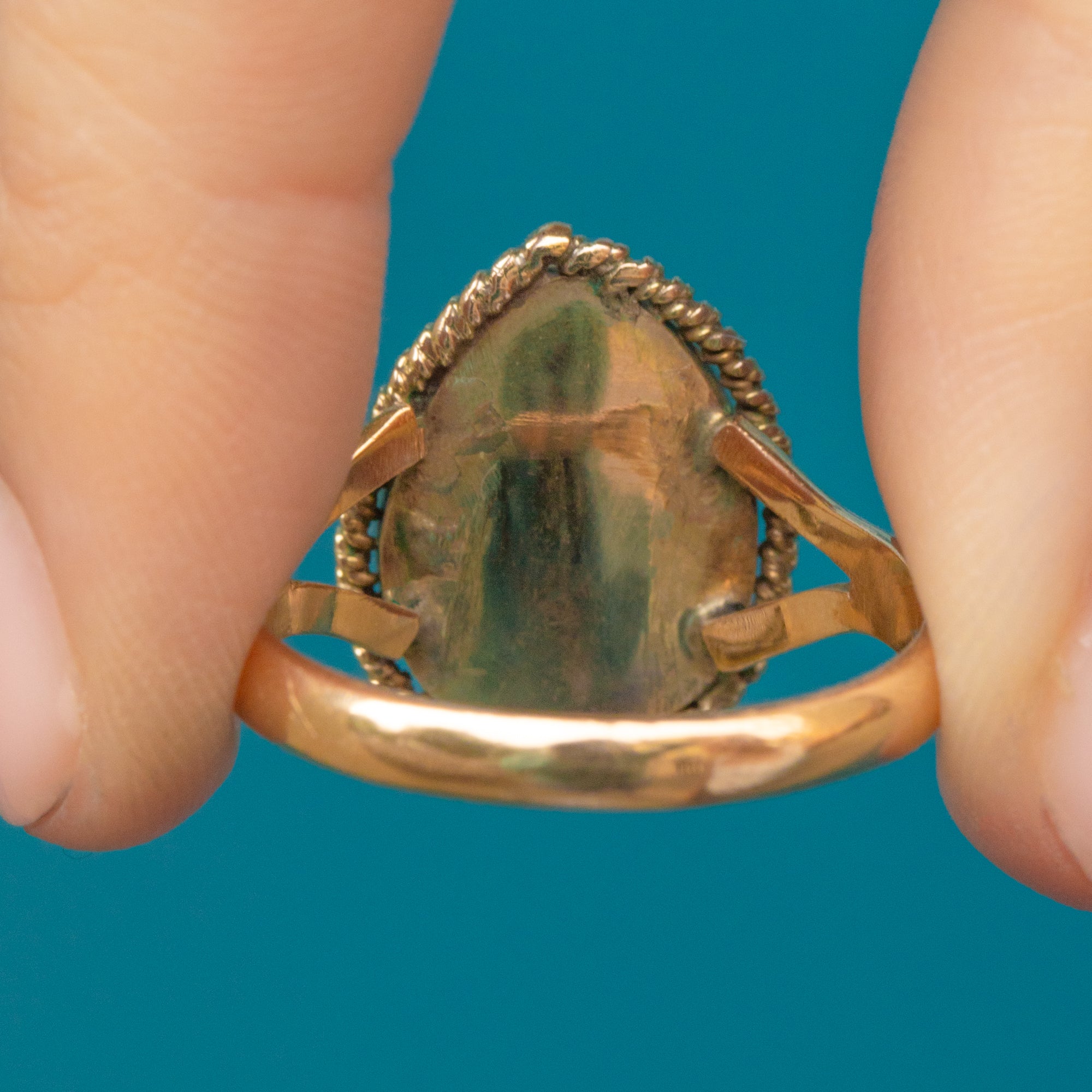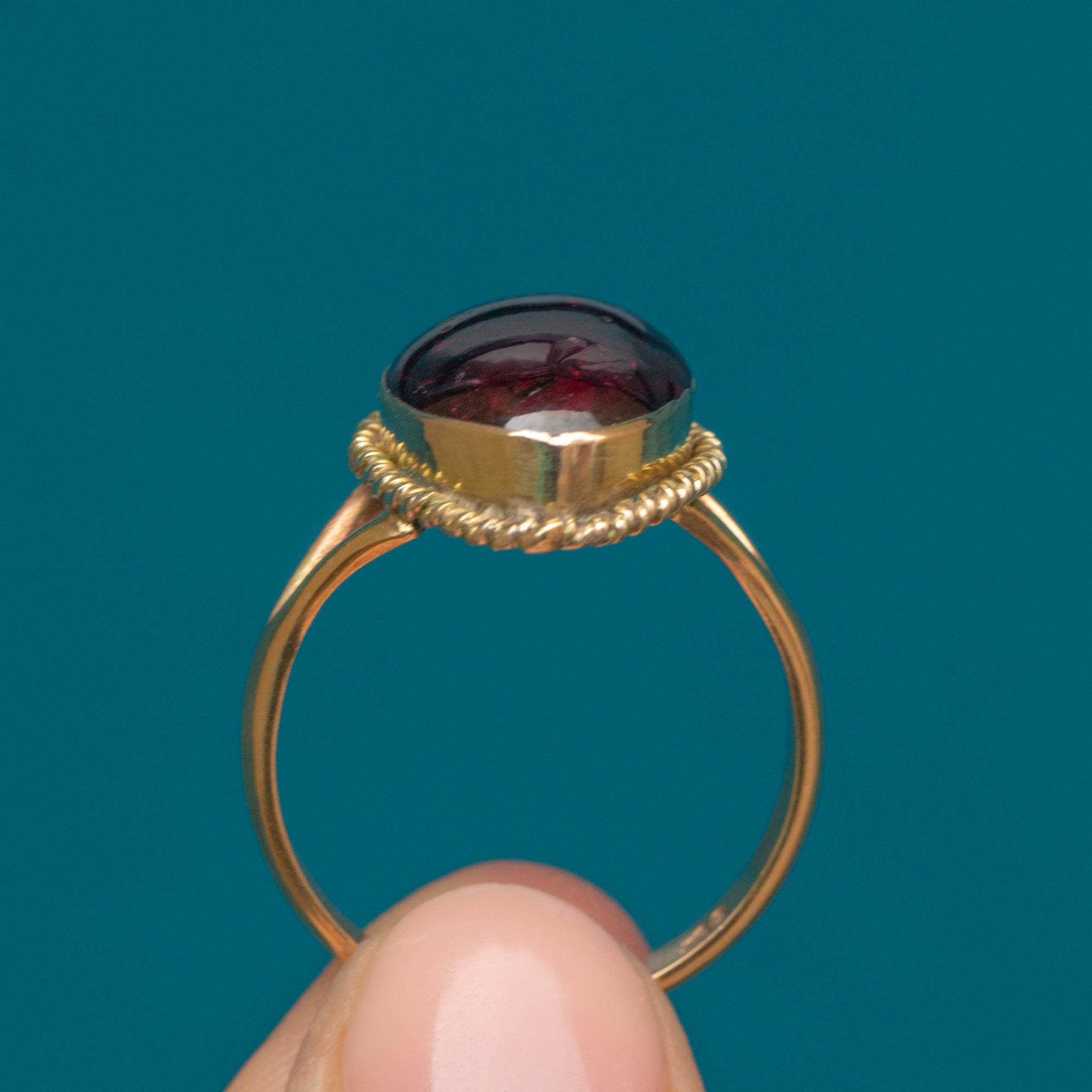 VERY GOOD. This 9ct Gold Victorian Garnet cabochon pear ring is in very good condition throughout. The large Garnet is truly mesmerising with only minor age-related surface wear, noticeable under close inspection, and has remained securely held within its bezel. The Gold has an even buttery hue and the rope border is firmly affixed with no wear to note. This piece has likely had a new shank added and there is some evidence of this on the back of the setting, but this ring sits comfortably and smooth against the skin. If you're a lover of outstanding pieces of Victorian jewellery, don't hesitate to make this sumptuous ring yours!