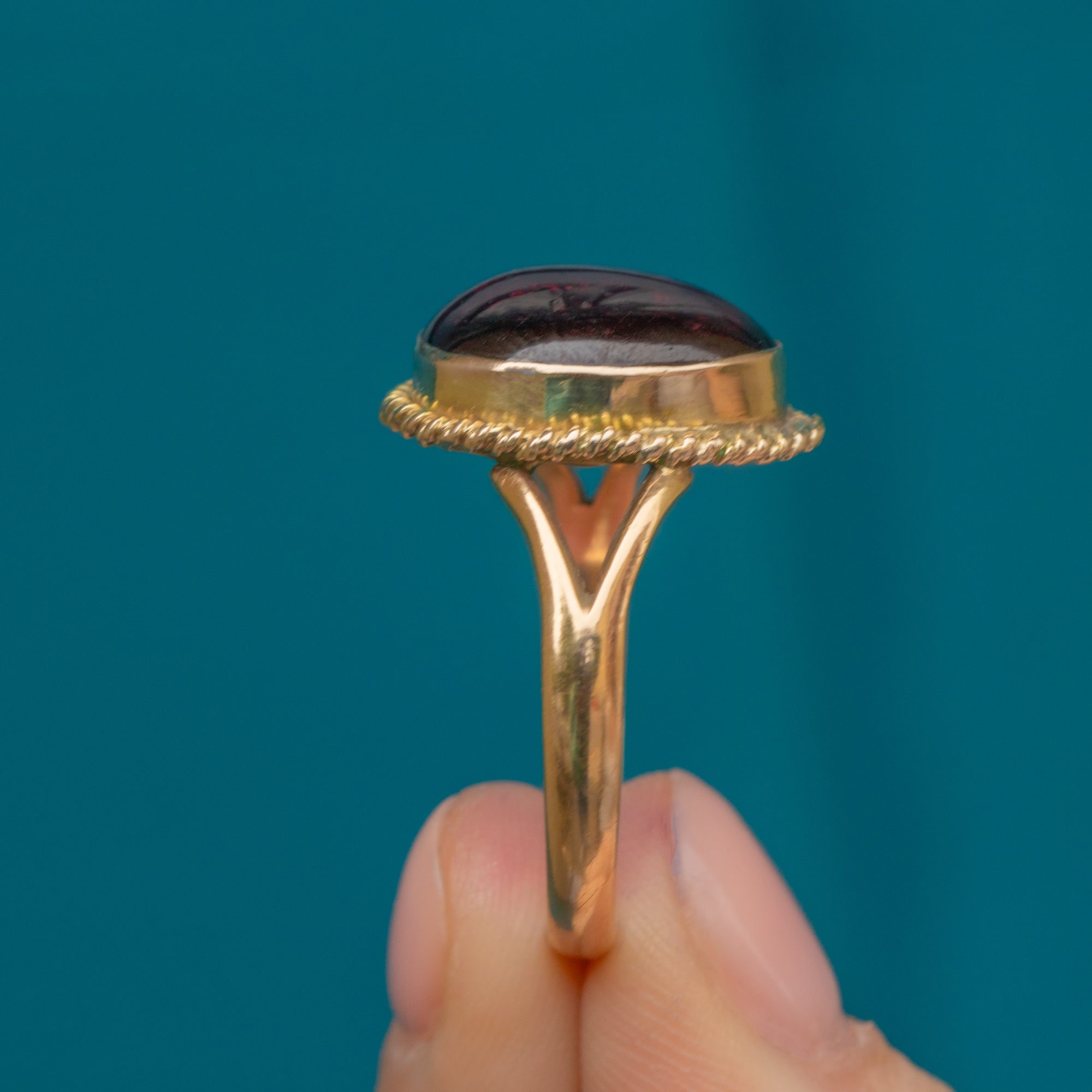 Wrapped up in buttery 9ct Gold, the smoothly cut Garnet cabochon is displayed proudly within a decorative rope border. With elegant tapered split shoulders and excellent finger coverage, this outstanding piece of history will bring Victorian gothic glamour to your repertoire!