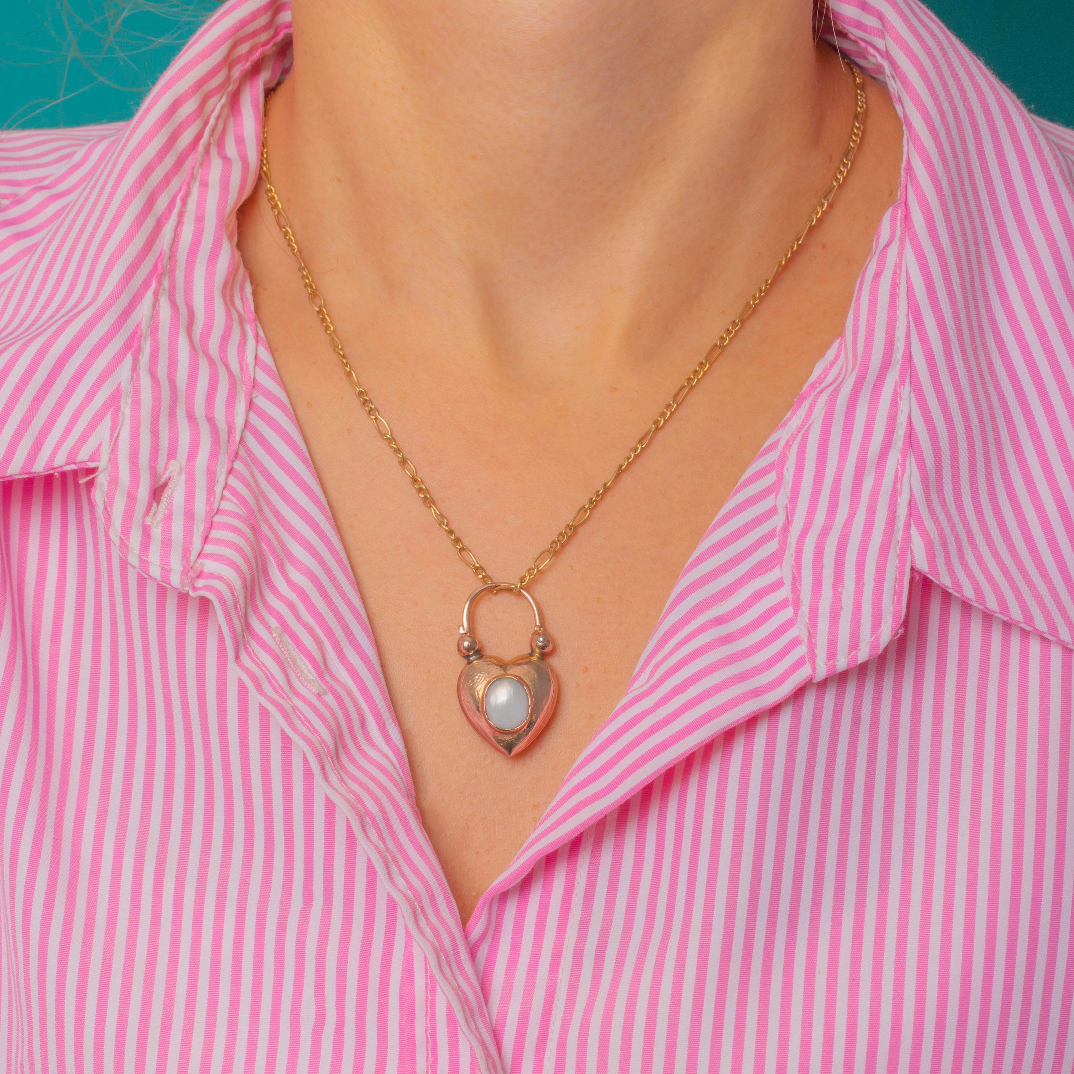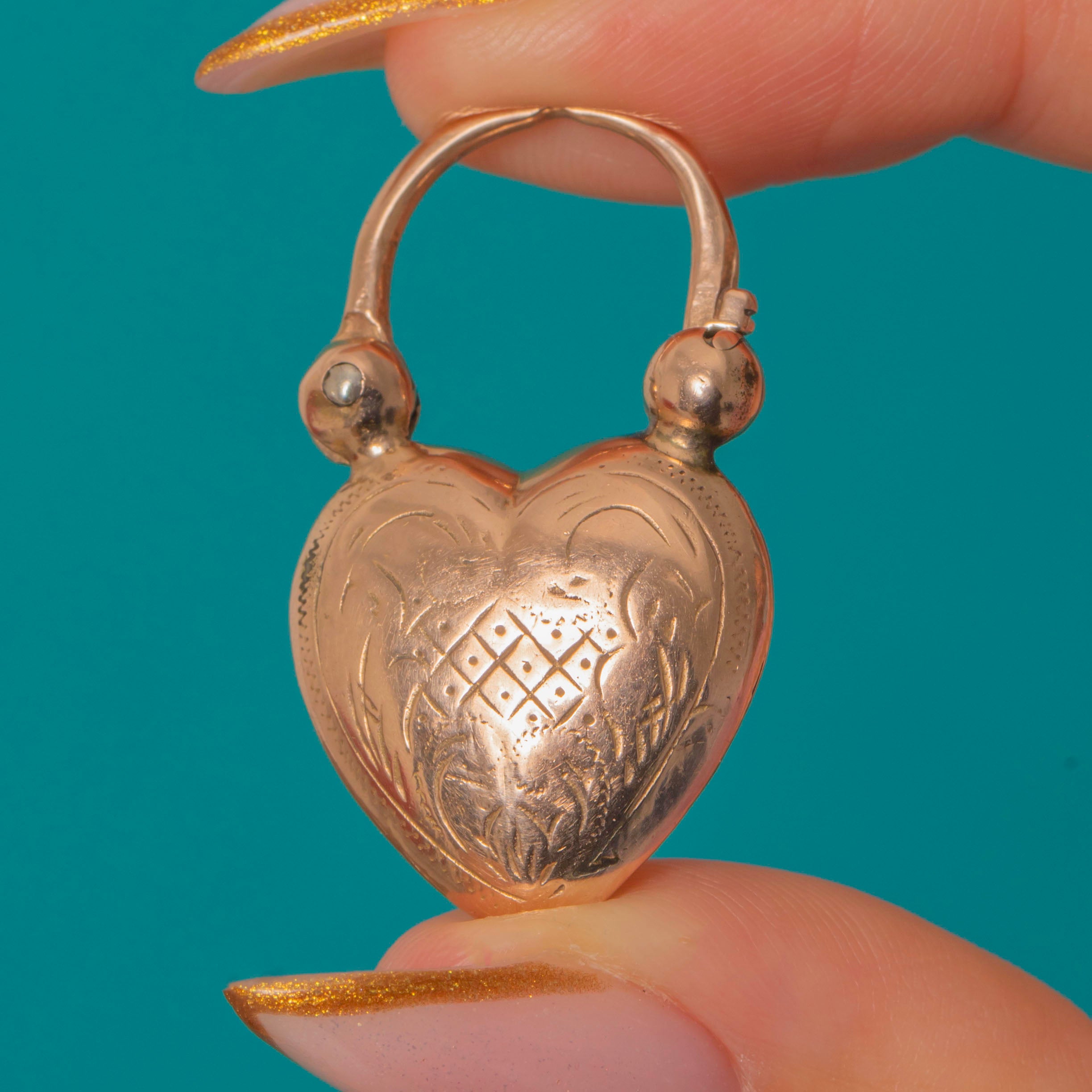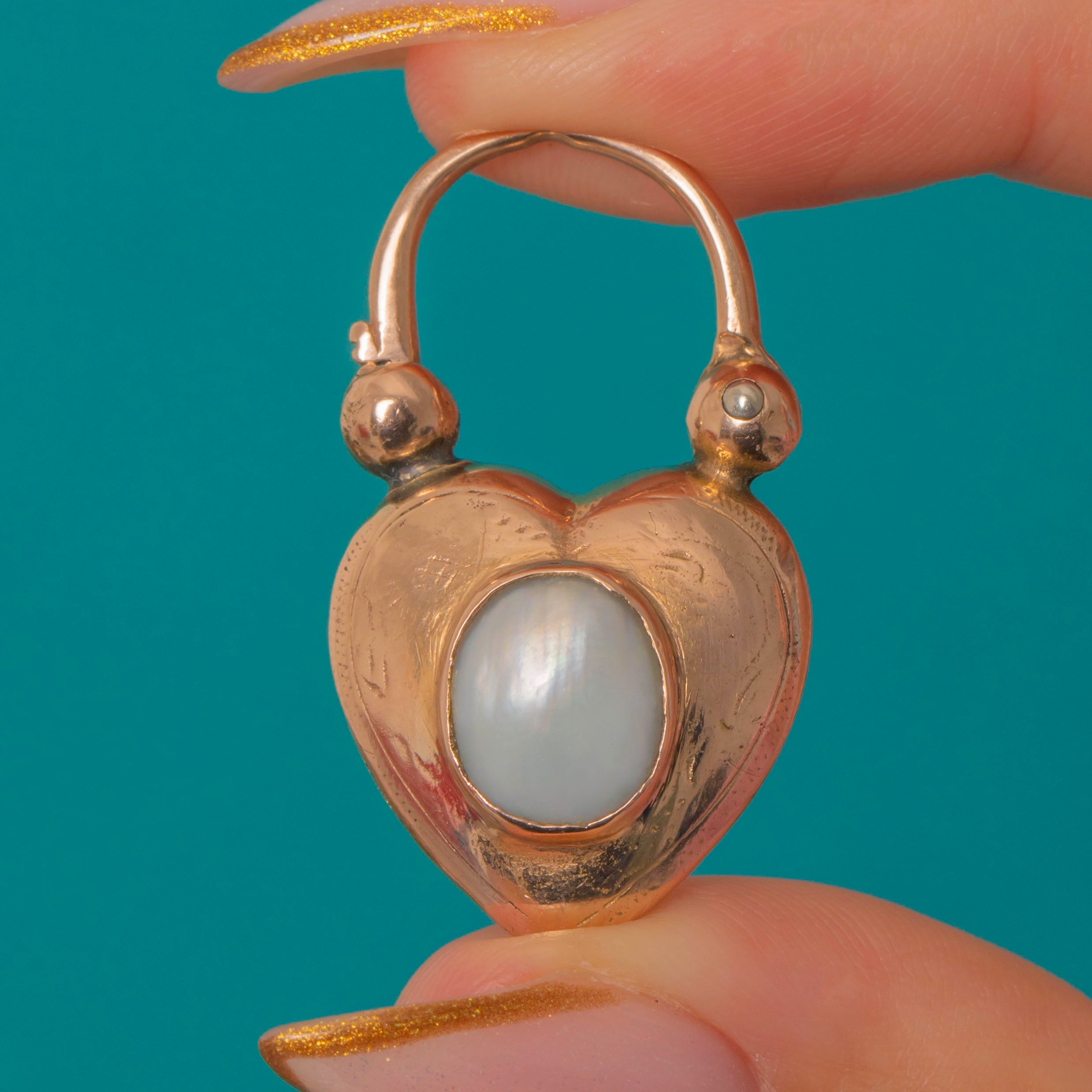 This exquisite Victorian padlock pendant captures all the romance of the 19th century. Crafted in rich 9ct Gold, its plump puffy heart form is adorned with a lustrous natural Pearl, shimmering softly at its centre. Each curve of the heart glows with the warm blush tones of antique Gold, its surface lightly engraved with delicate detailing.