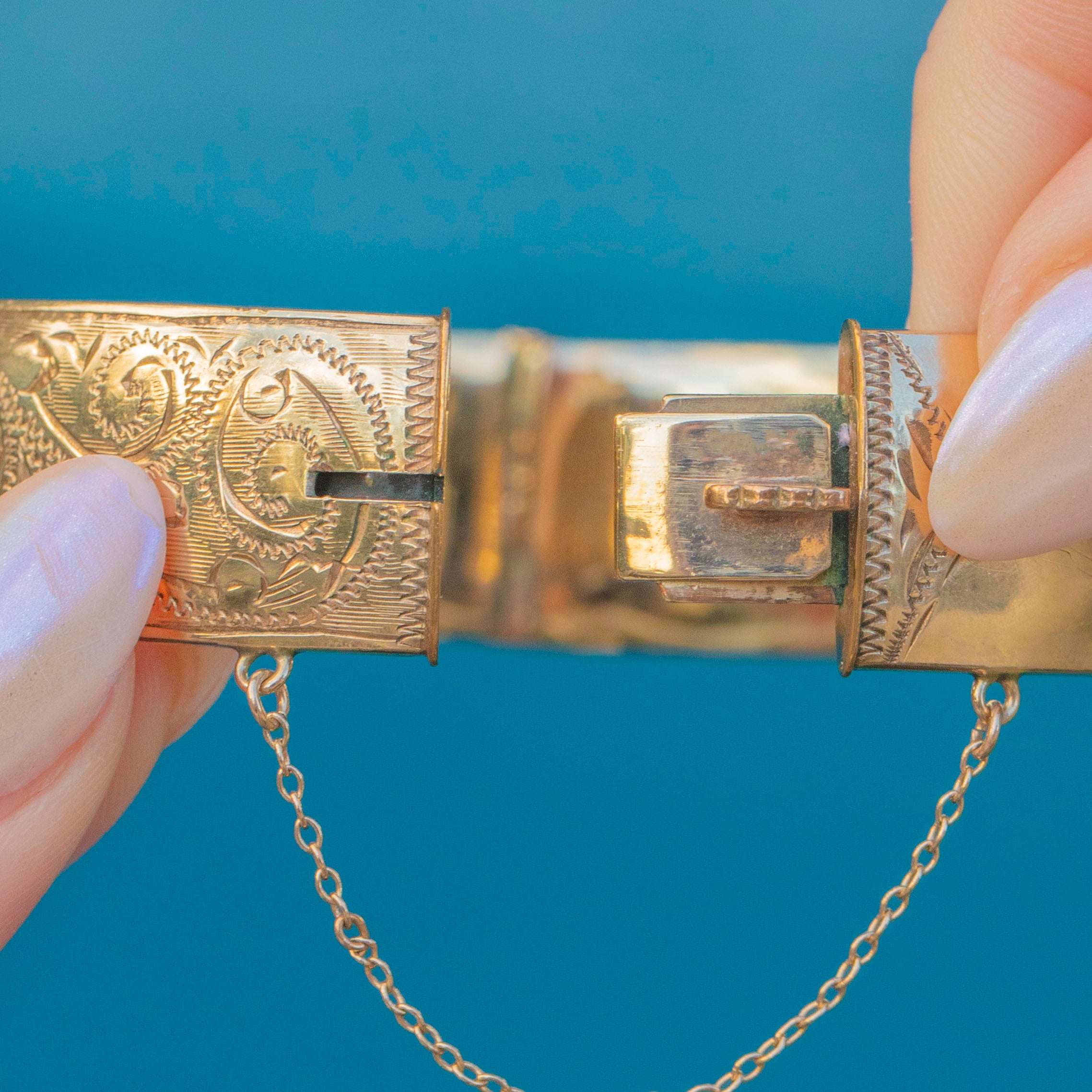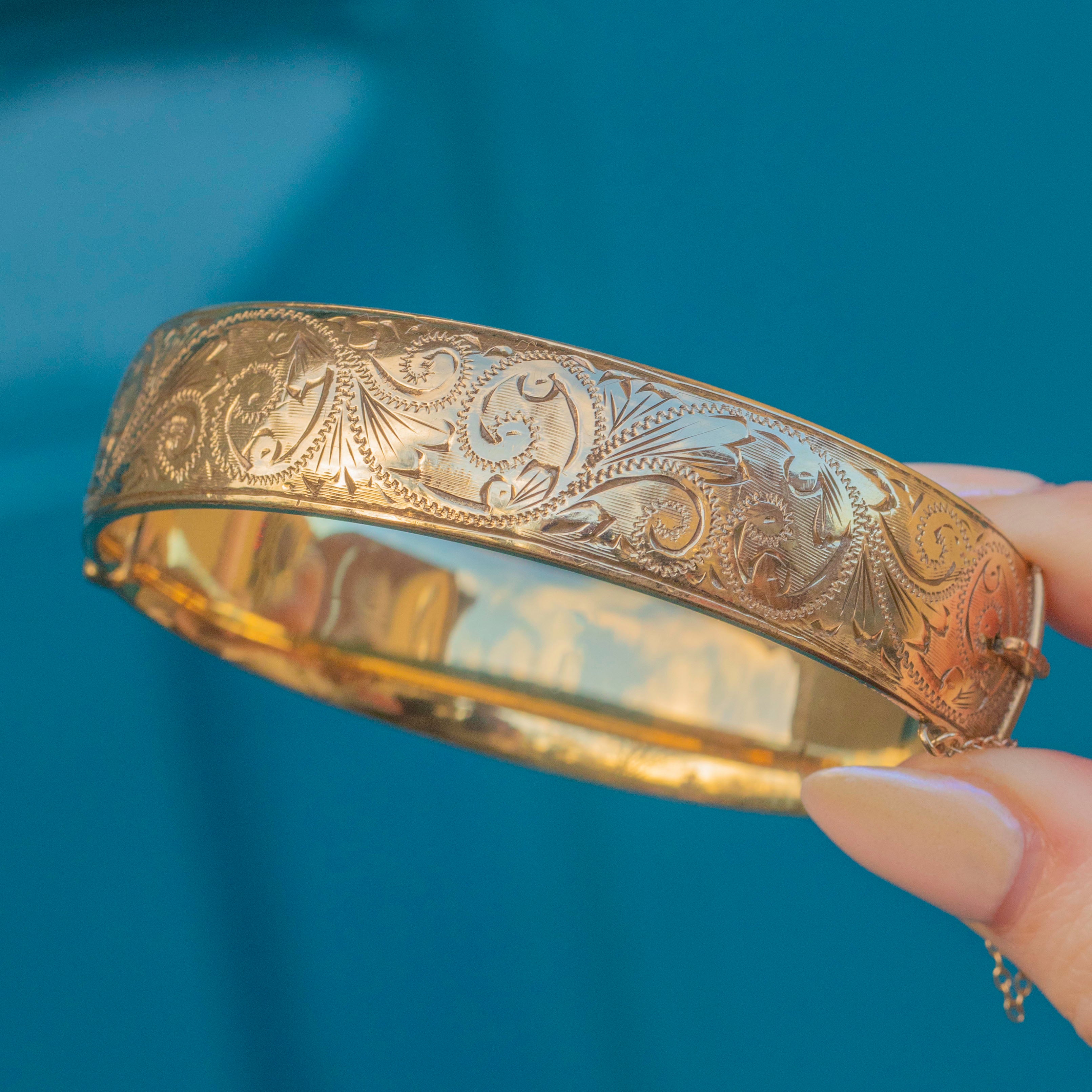 EXCELLENT. This 9ct rolled Gold engraved bangle is in excellent condition. The bangle has lasted incredibly well over the years, with a smooth feel, lovely engravings and a safety chain for extra measure!