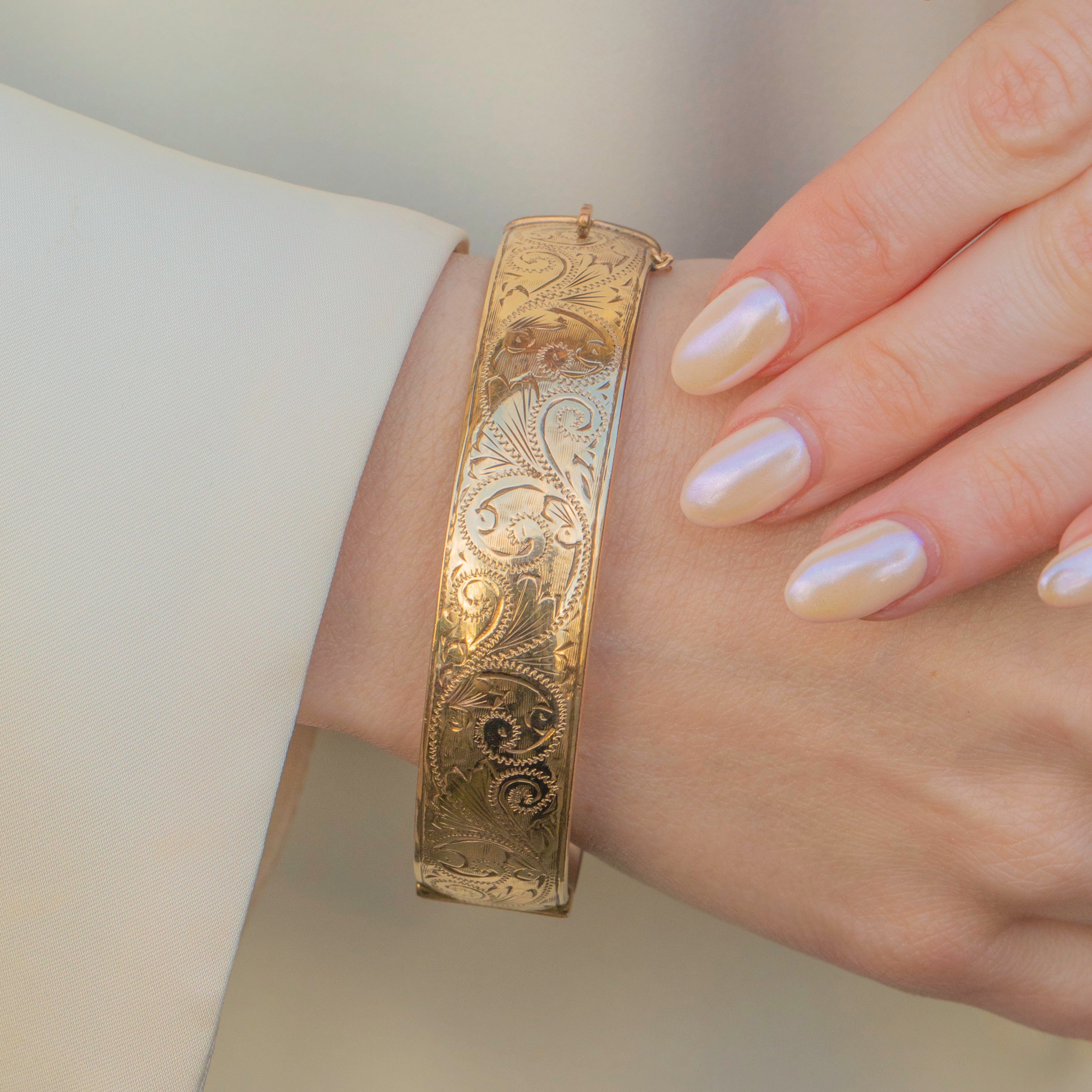 The front of this mid-century bangle has been beautifully engraved with swirling acanthus leaf engravings with a stippled finish contrasting the smooth lines creating a visual feast.