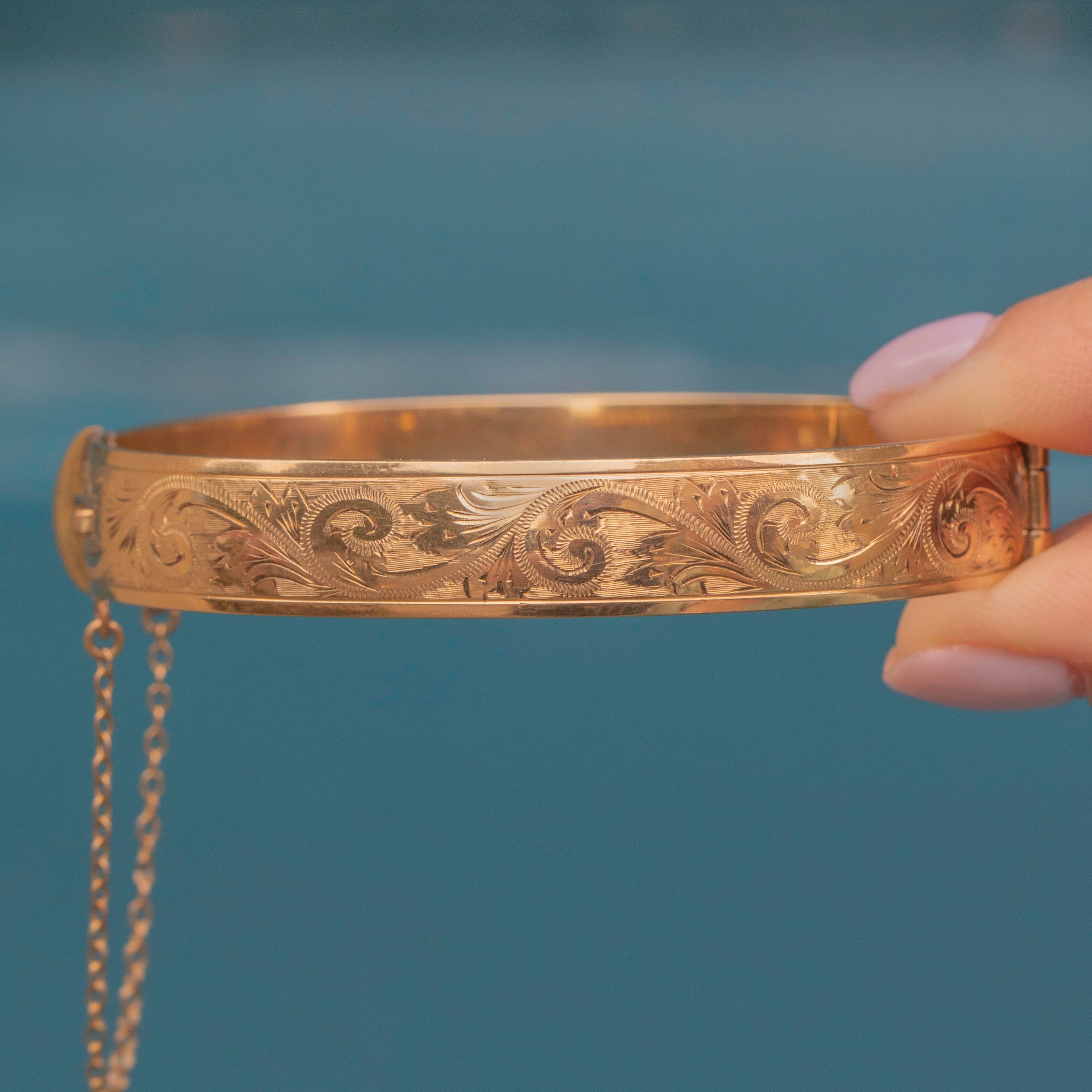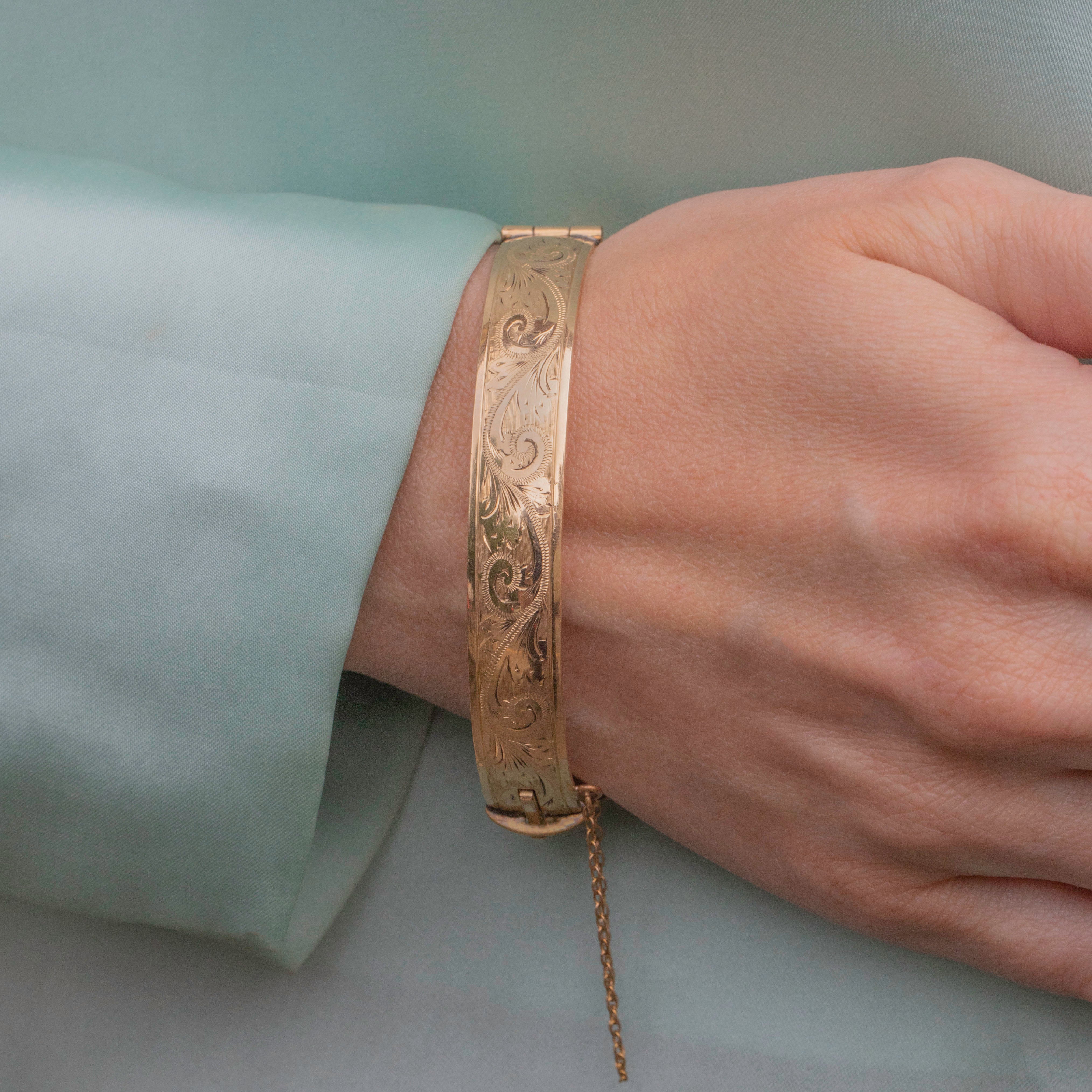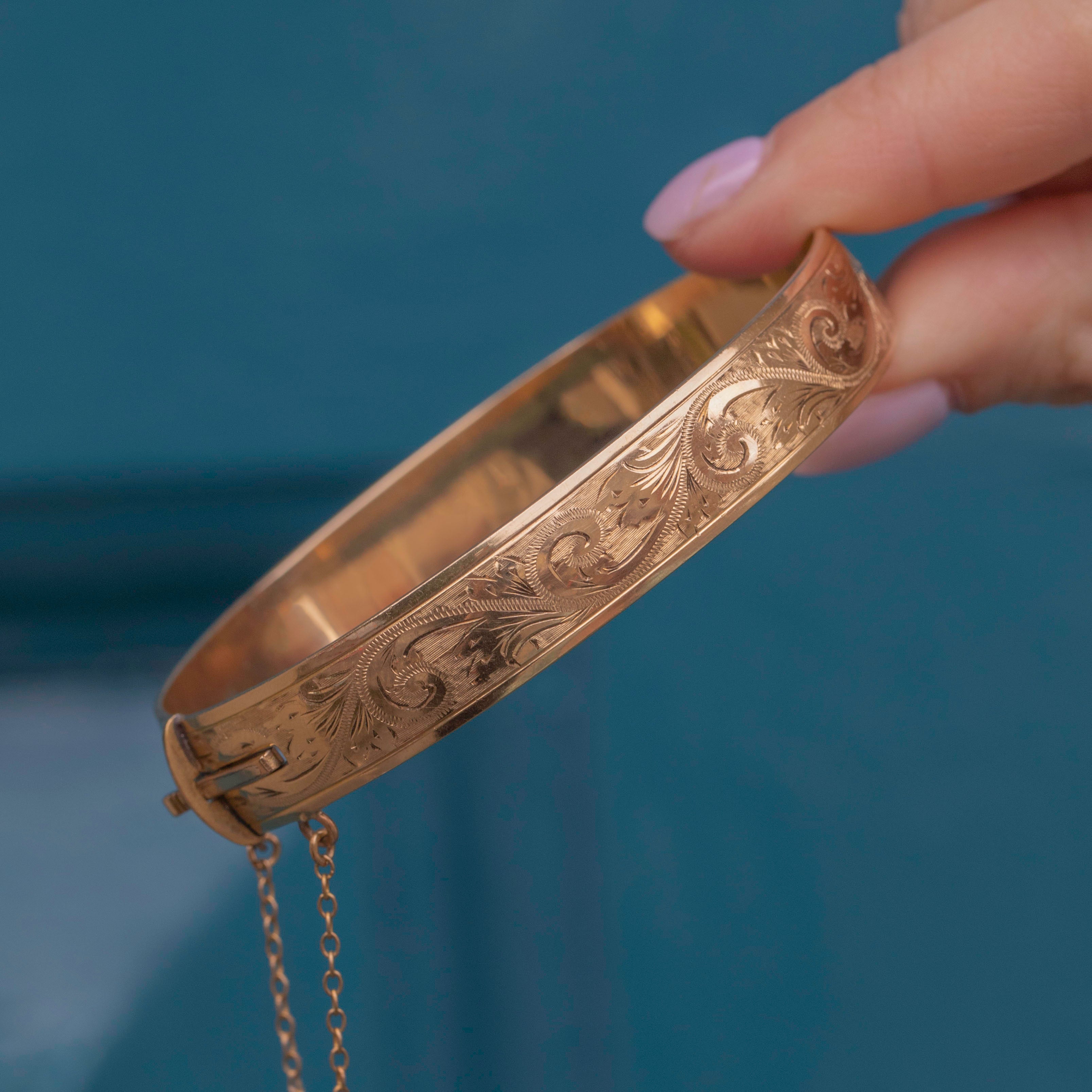 This is a gorgeous 9ct rolled Gold engraved bangle! You'll be certain to ooze 70s vintage charm with this striking piece adorning your wrist.