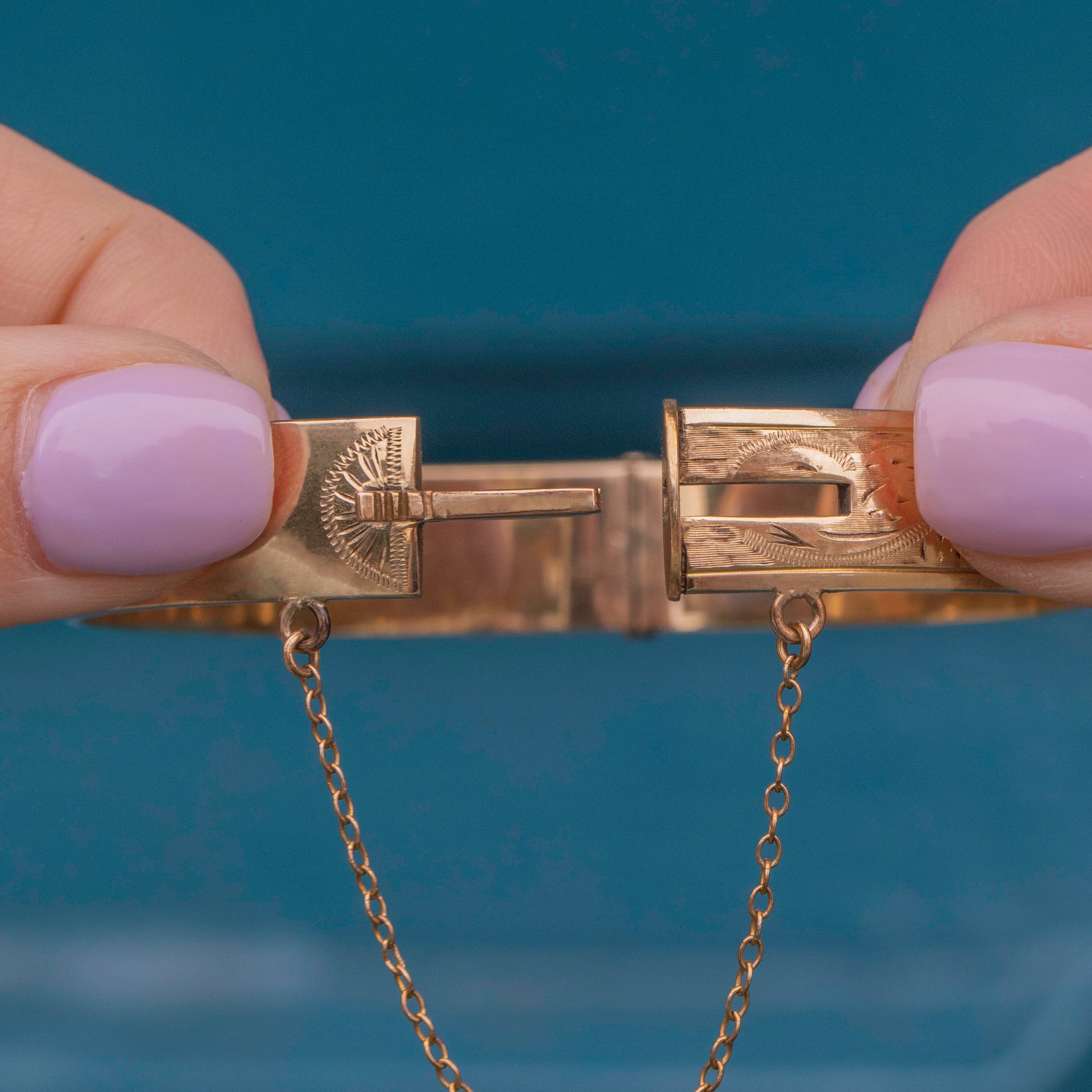 VERY GOOD. This 9ct rolled Gold engraved front bangle is in lovely condition throughout. The rolled Gold is sleek to the touch, making it comfortable to wear throughout the day. Her engraved edge is crisp and clear, with each engraving catching the light beautifully. Her hinge mechanism is in fine working order, and her clasp shuts with a click. There is some wear on the inside of the bangle, located next to the clasp, however this cannot be seen when worn. The perfect piece of wrist candy to add a touch of opulence to any attire!