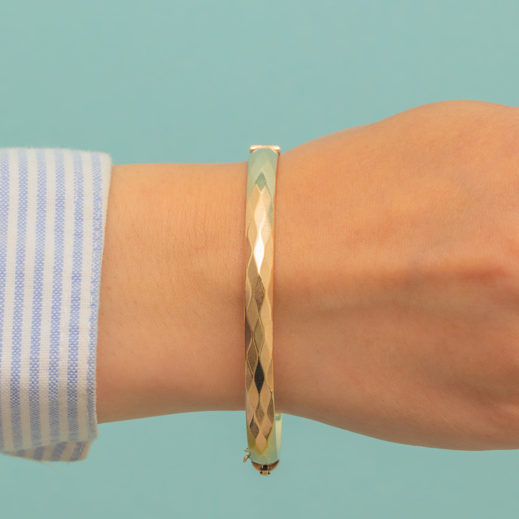VERY GOOD: This 9ct Rolled Gold faceted bangle is in very good condition! The Gold has a bright and buttery hue with some subtle wear along the edge of the facets, but nothing that detracts from her overall splendour. The bangle closes securely, so you can wear it with utmost confidence!