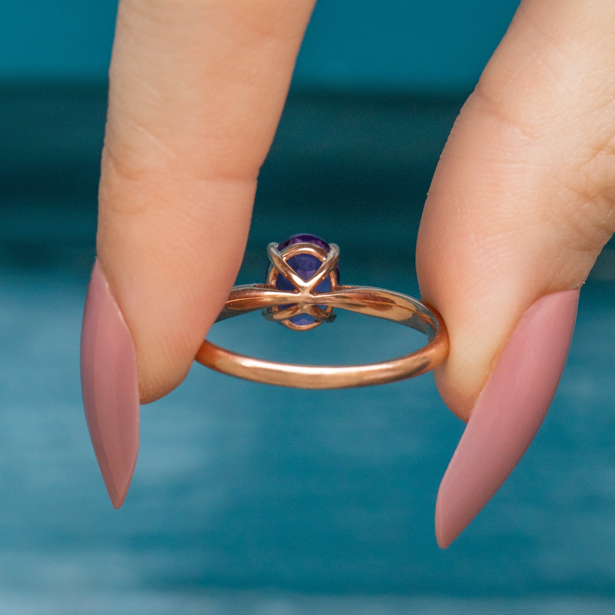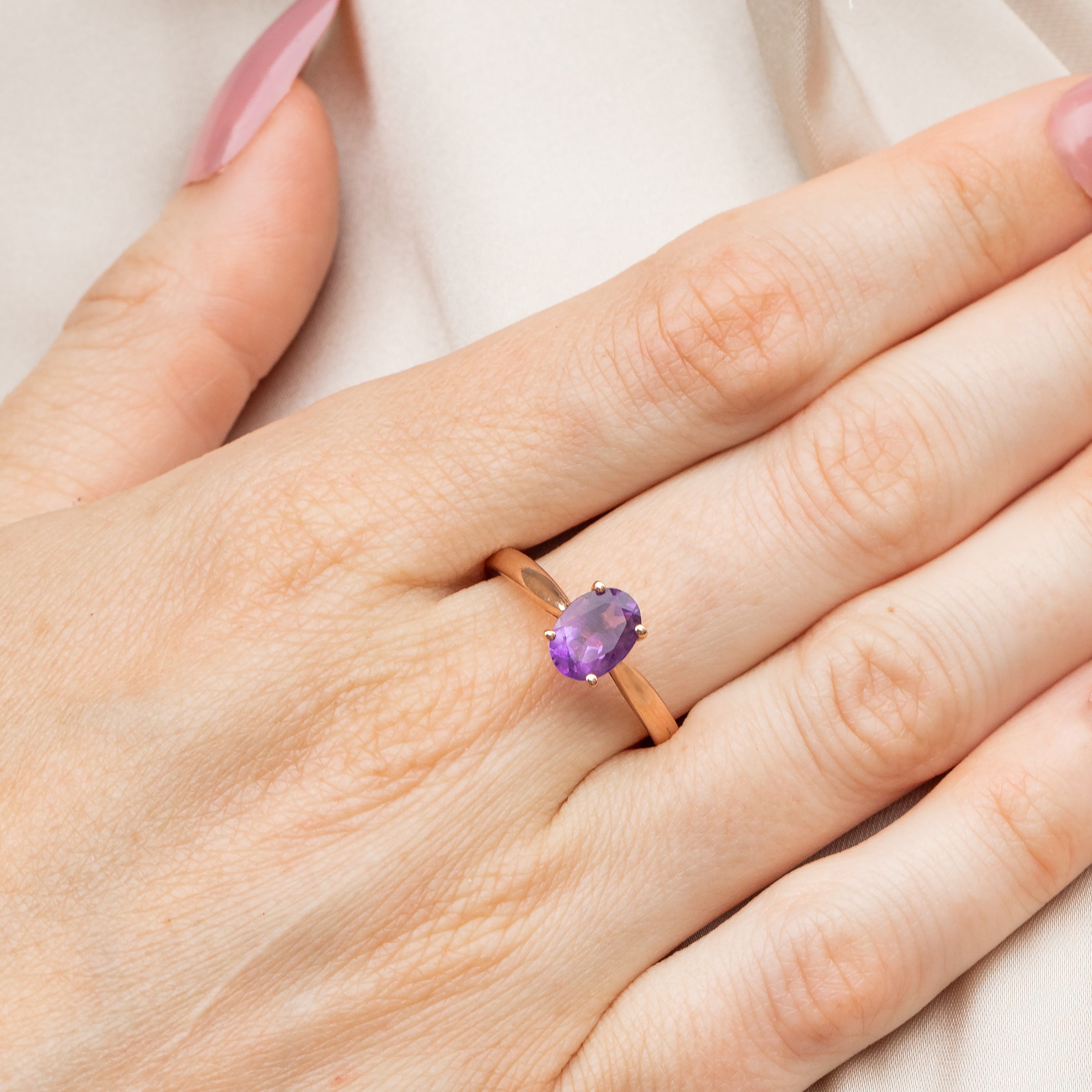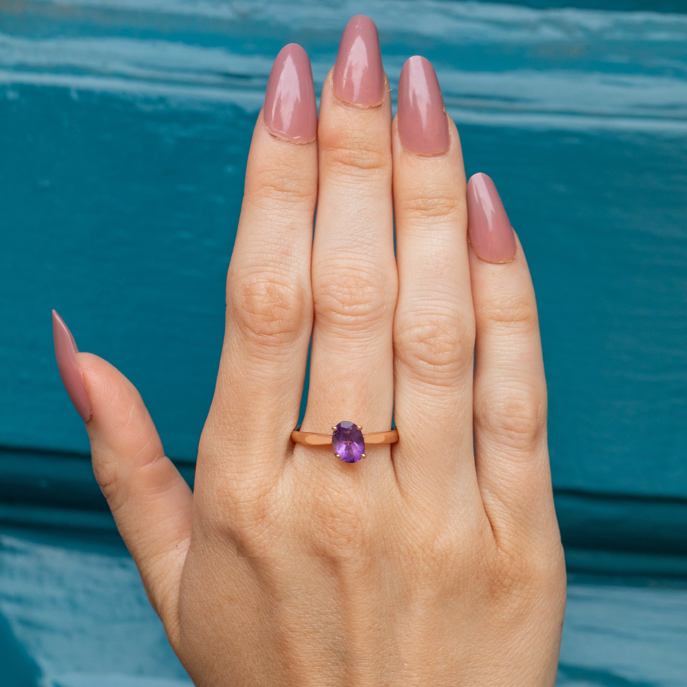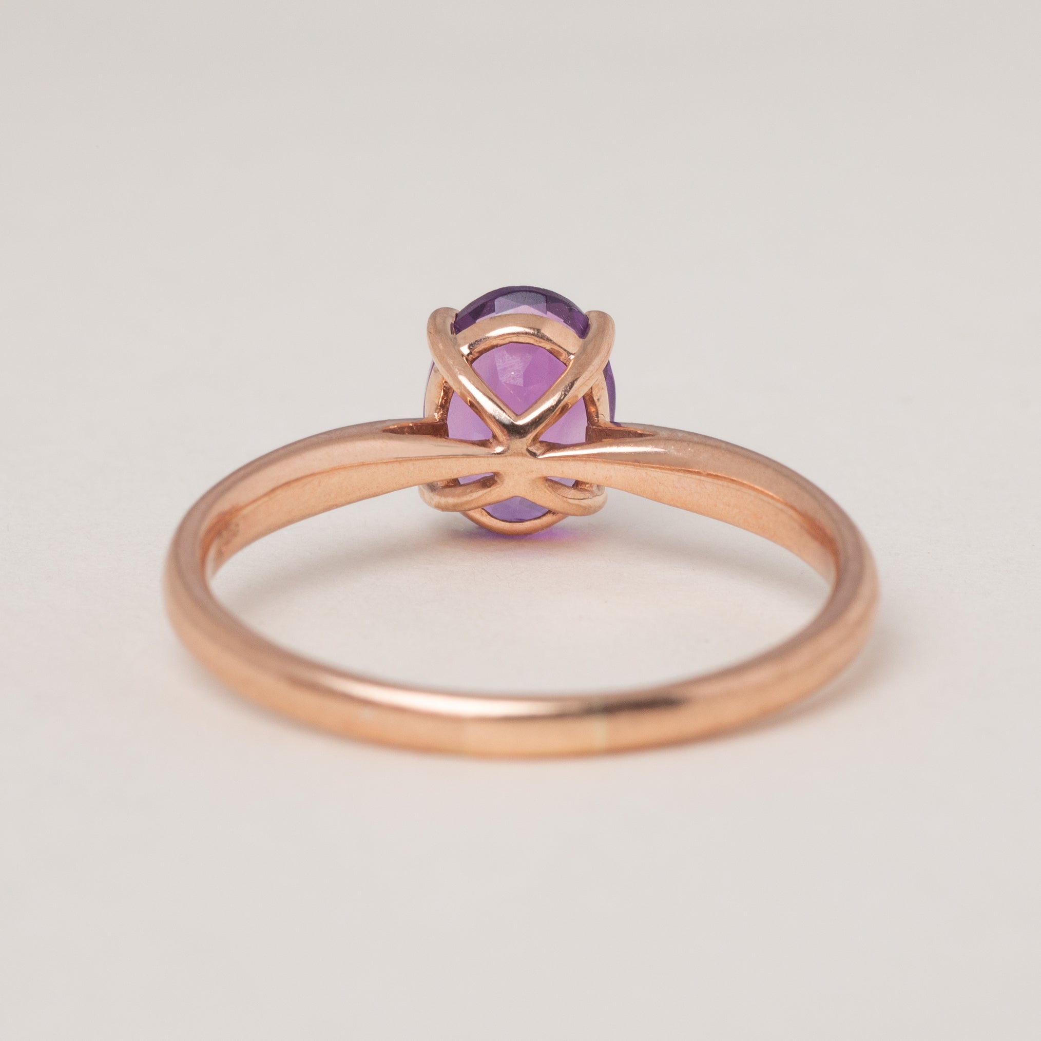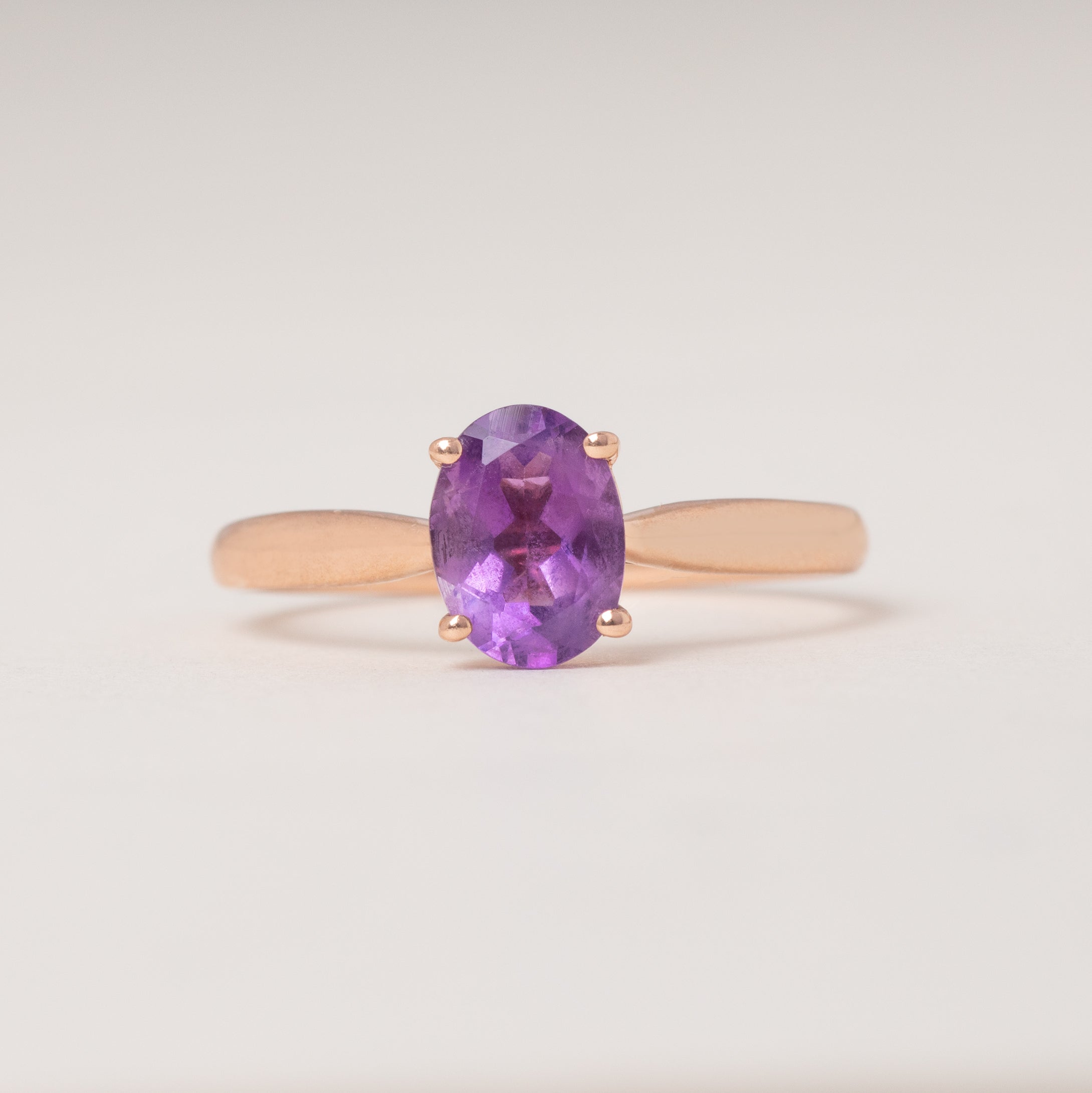 A beautiful 9ct Rose Gold Amethyst solitaire ring, boasting a regal allure! Her Amethyst possesses a gorgeous rich violet hue and rises proudly above the finger.