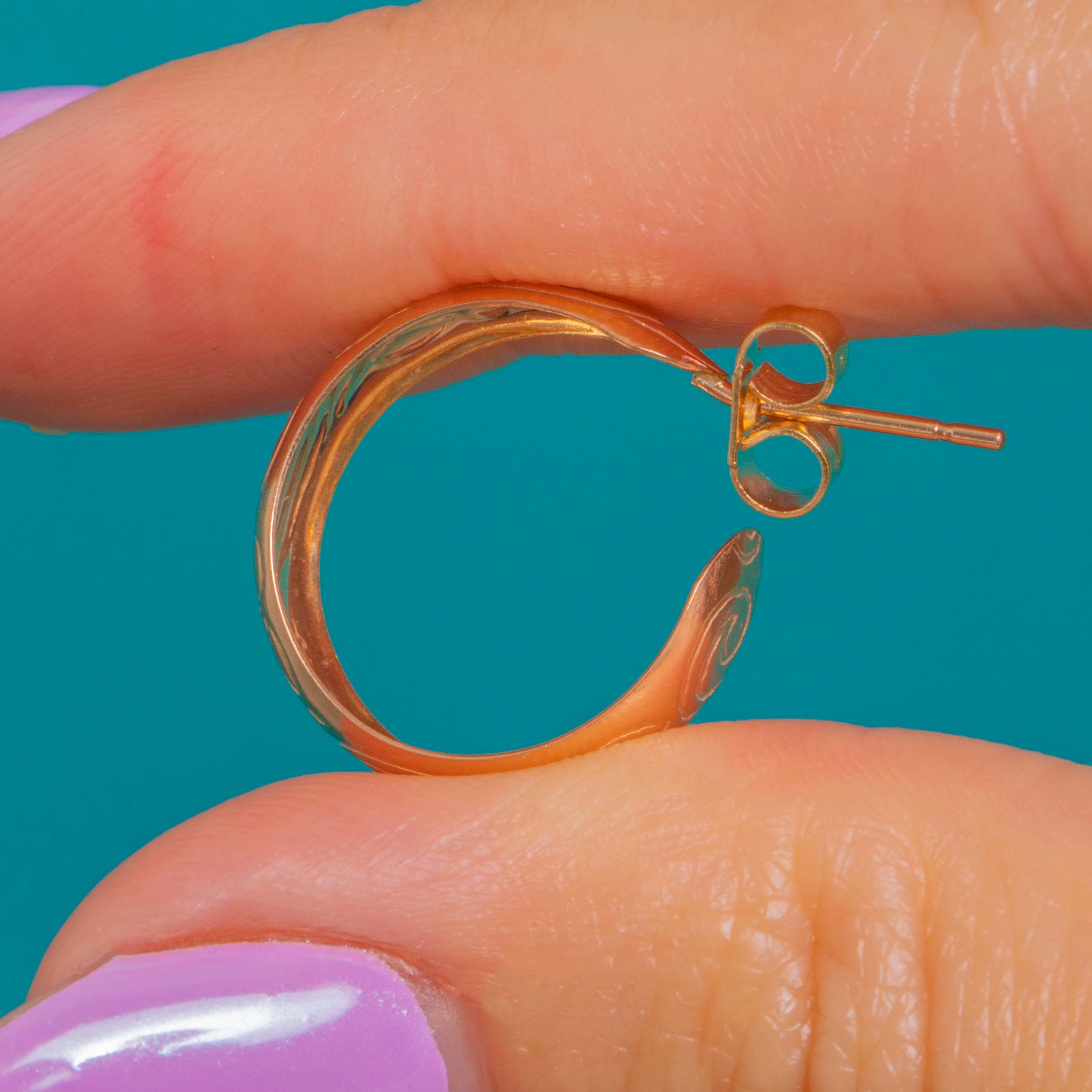 Crafted as compact half hoops that sit close to the ear, the low-relief engraving lends texture and light-play. A timeless pair—these are the kind of earrings you’ll reach for again and again.