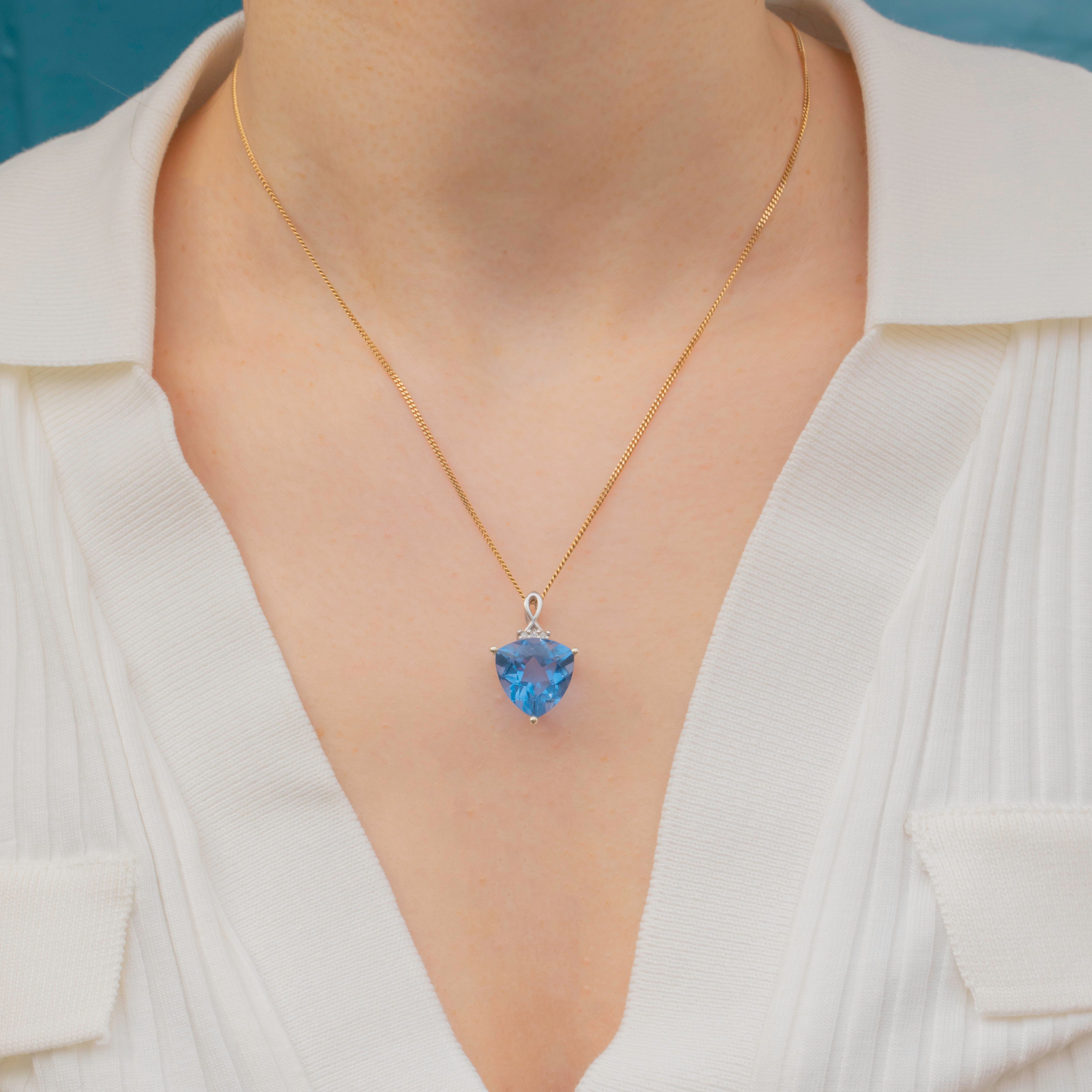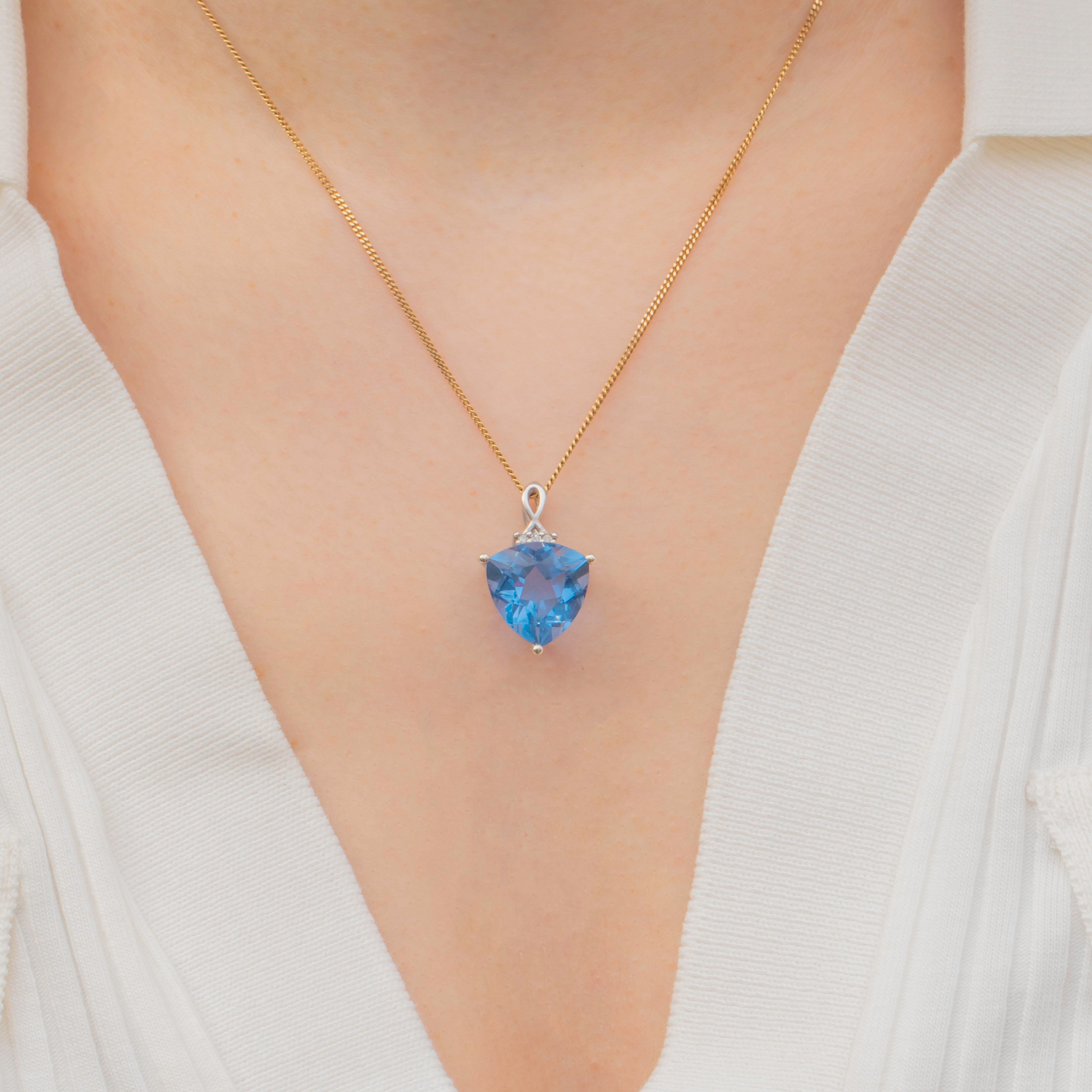 VERY GOOD-EXCELLENT: This 9ct Gold blue Spinel pendant is in wonderful condition. The Diamonds and Spinel are radiant, with only a couple of small fleabites that are difficult to spot without a jeweller's loupe. Secure in her glossy 9ct white Gold settings and with a secure bale, you can wear this pendant with confidence!