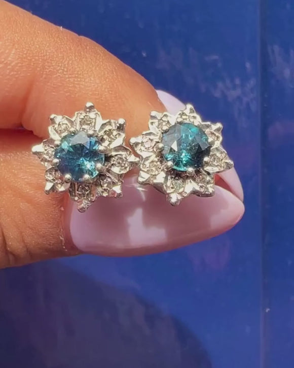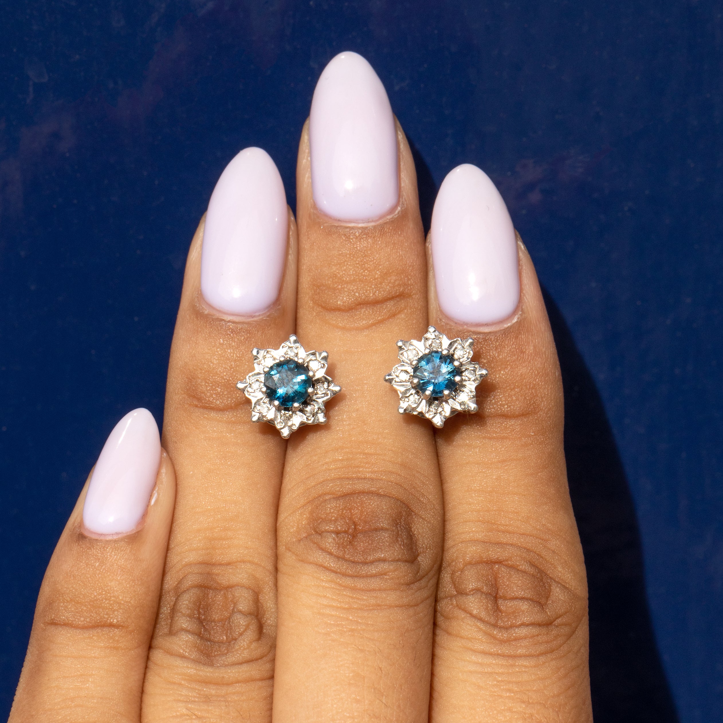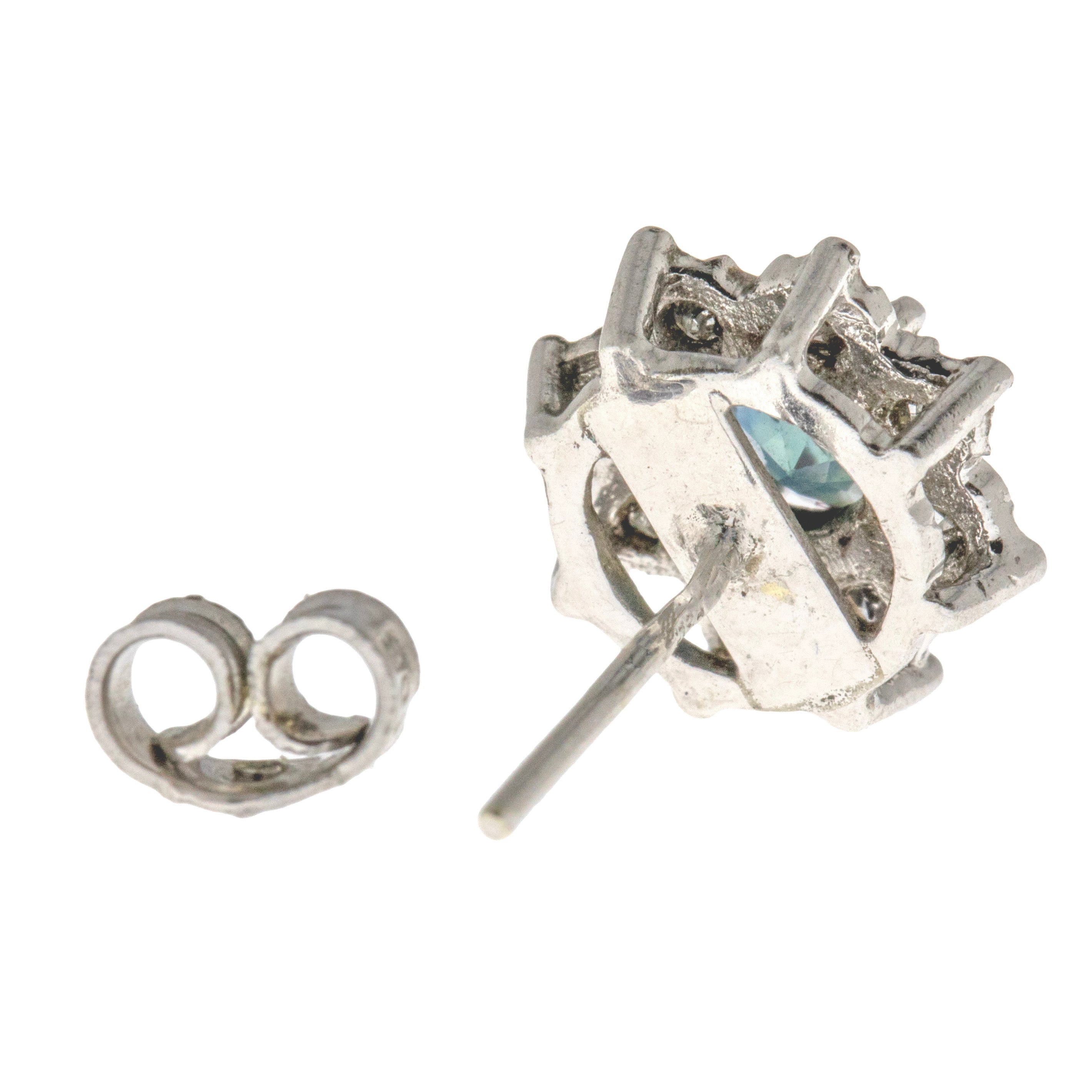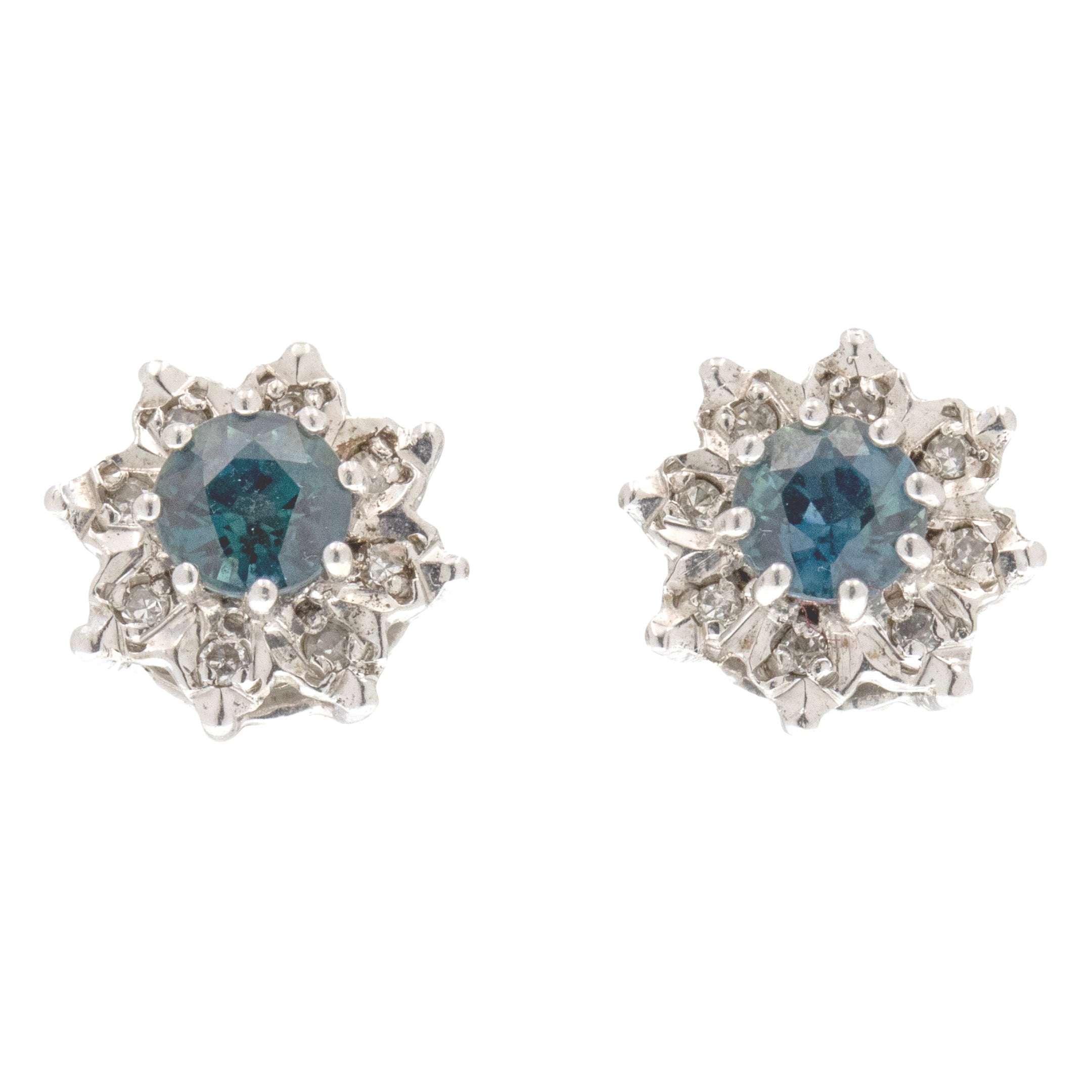 Boucles d'oreilles puces en or blanc 9 carats avec saphir et diamant en grappe, saphir 1,00 ct