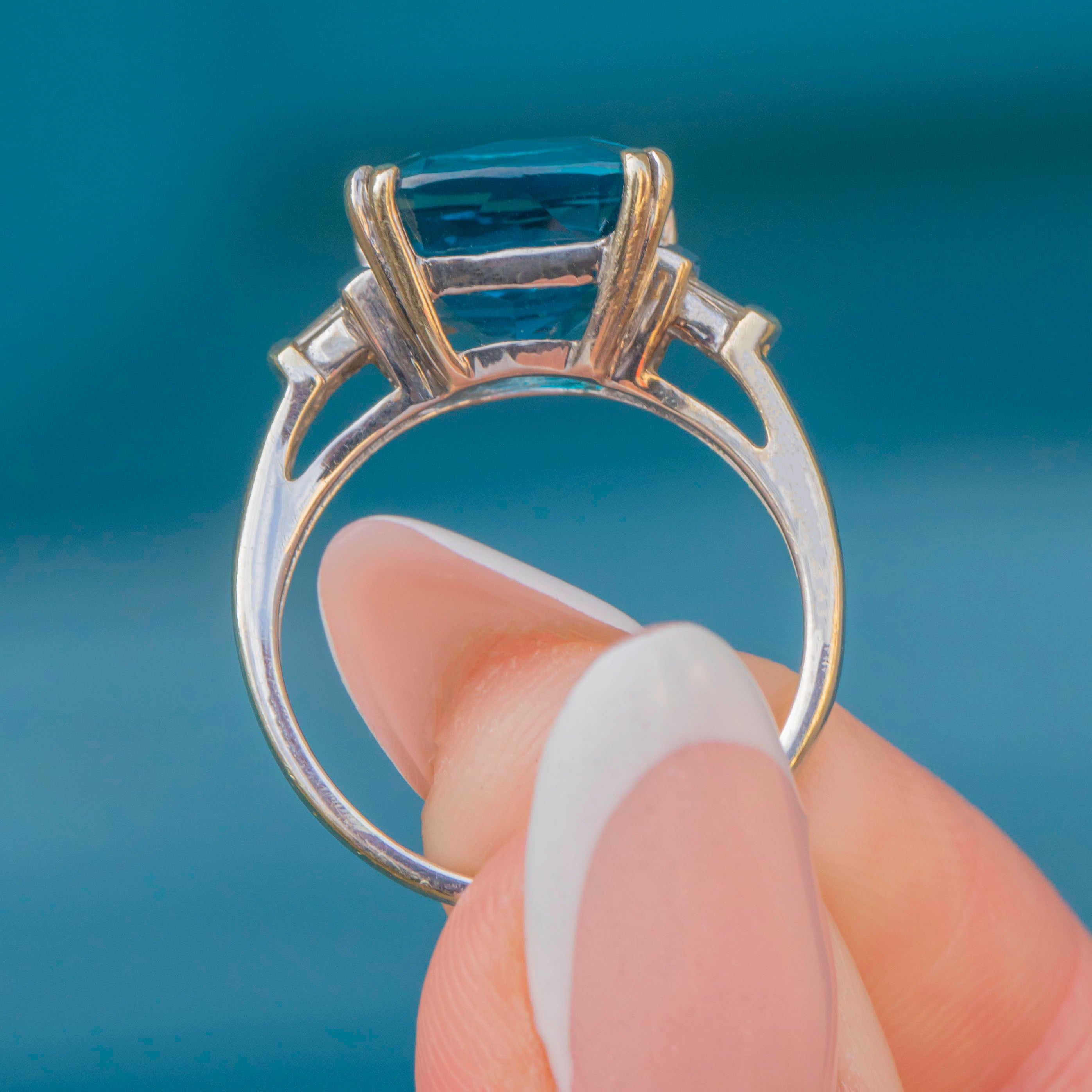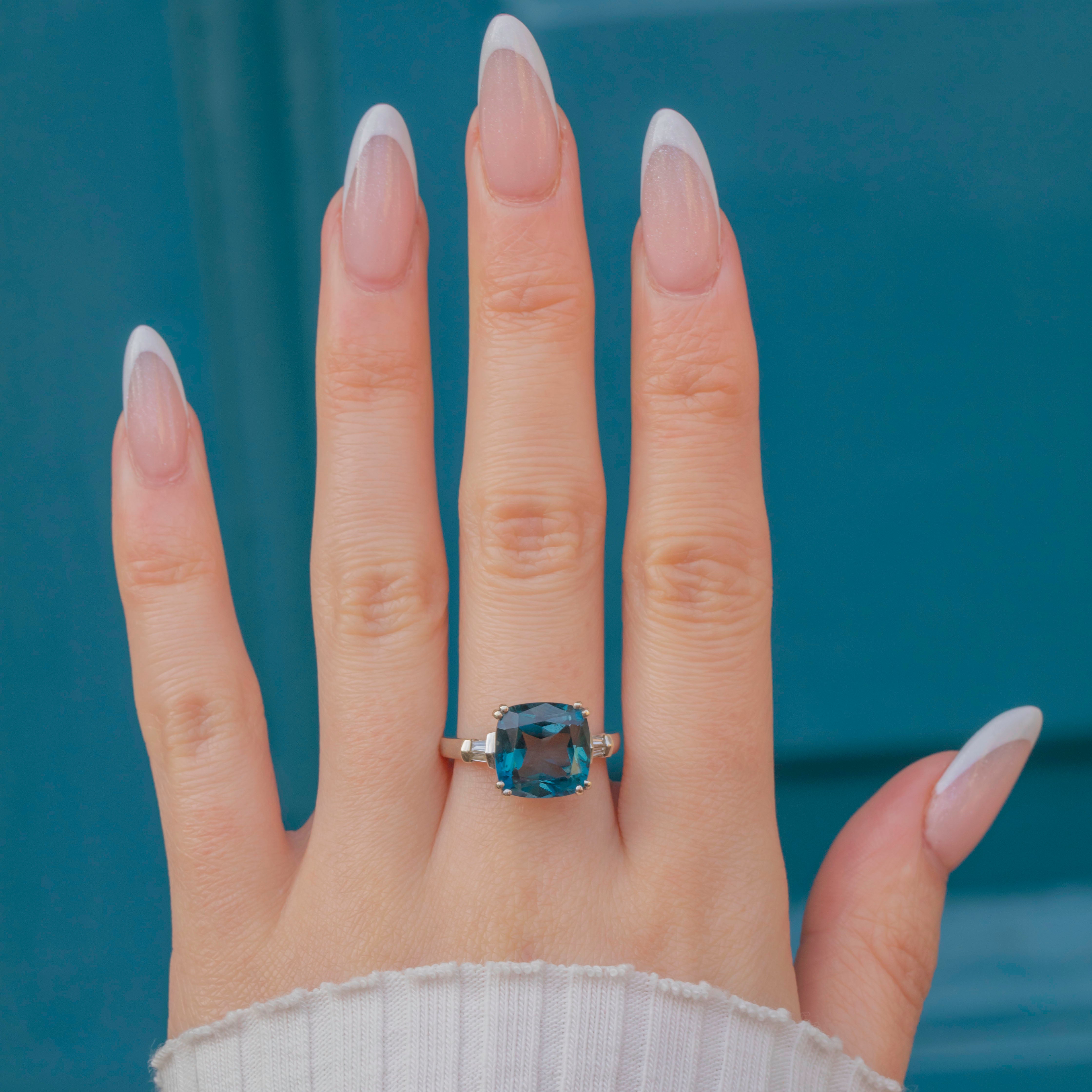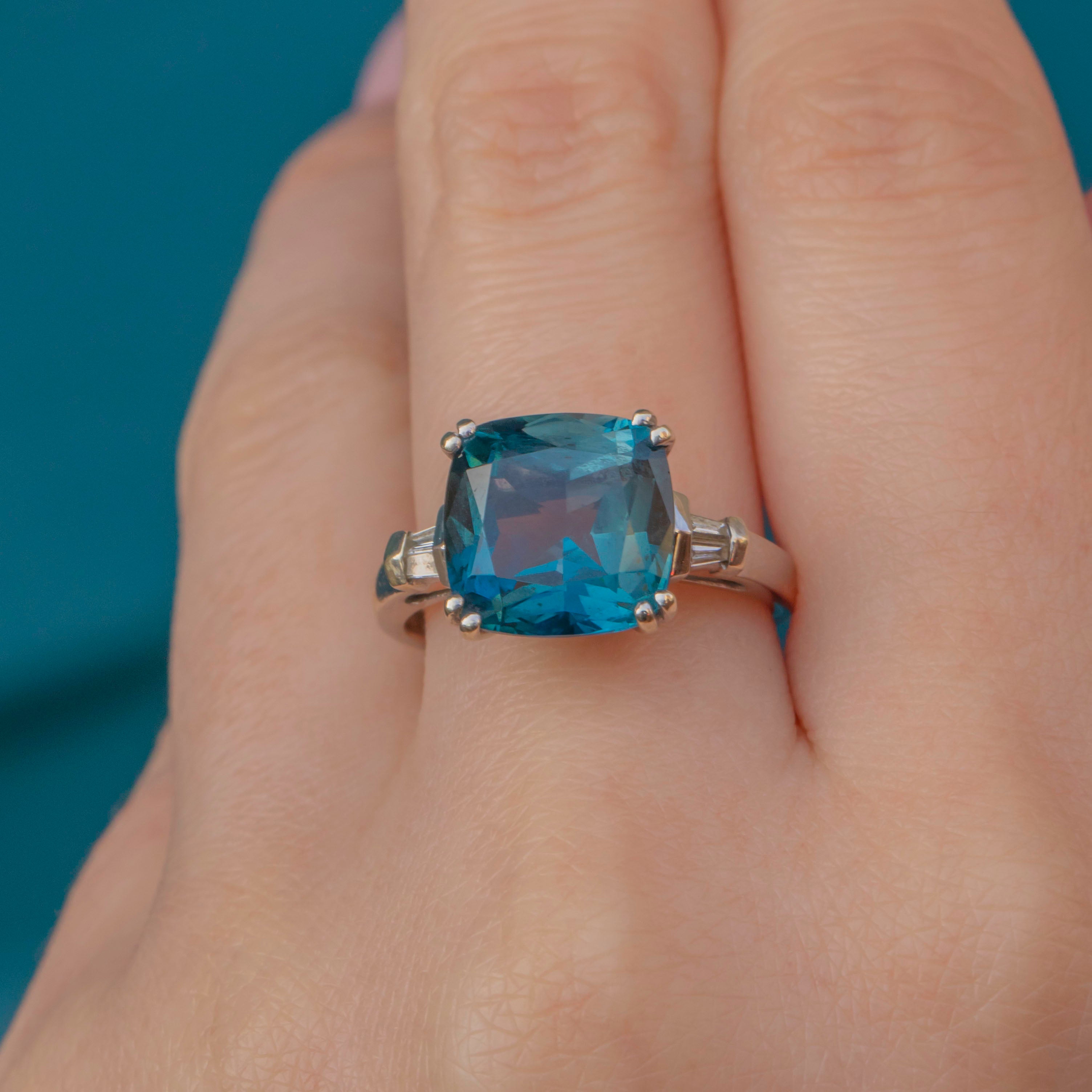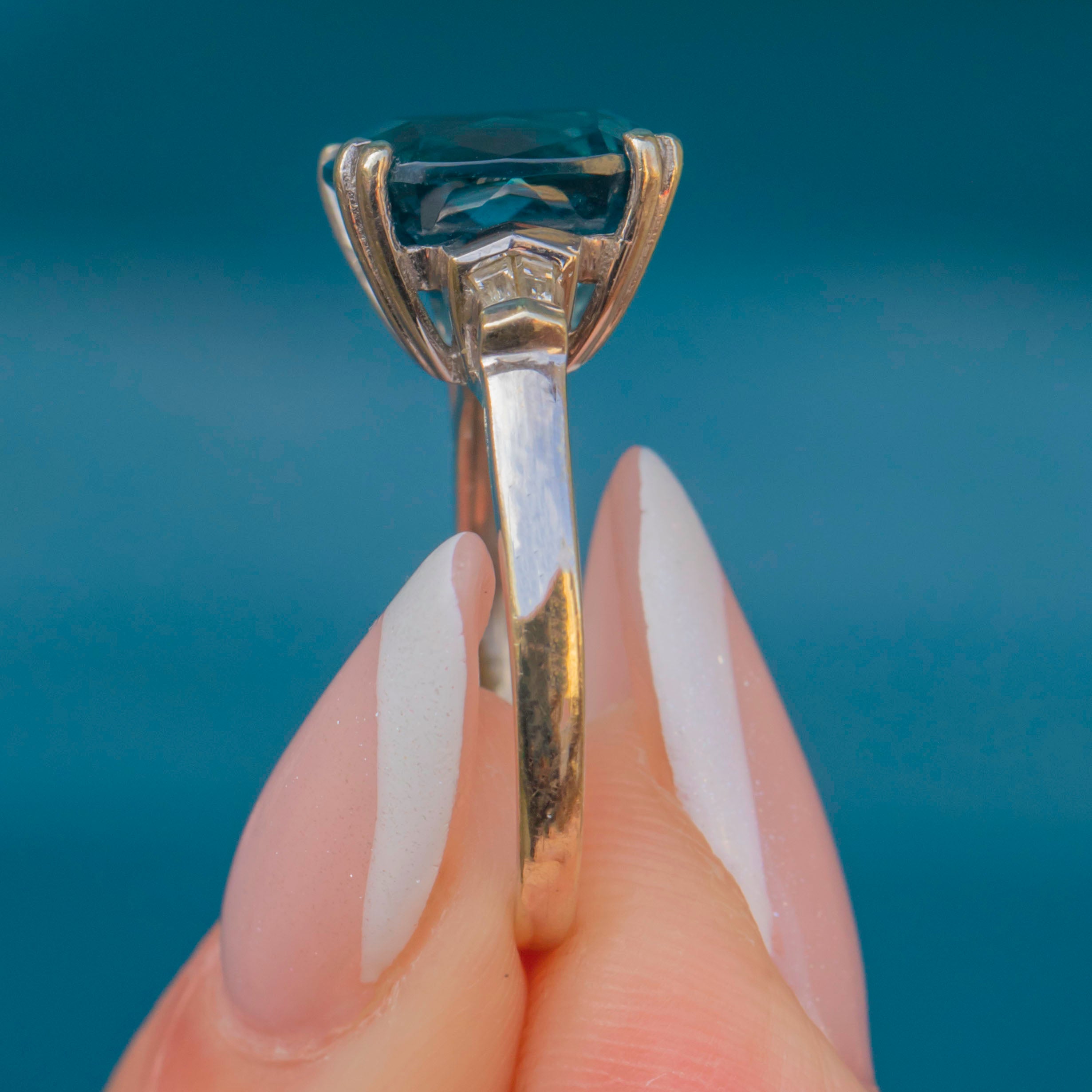 This 9ct White Gold Teal Spinel Diamond Ring is a stand-out piece! A large 4.95ct Spinel takes centrestage, guaranteed to mesmerise you with her bright teal hue, flanked by two bright baguette-cut Diamonds.