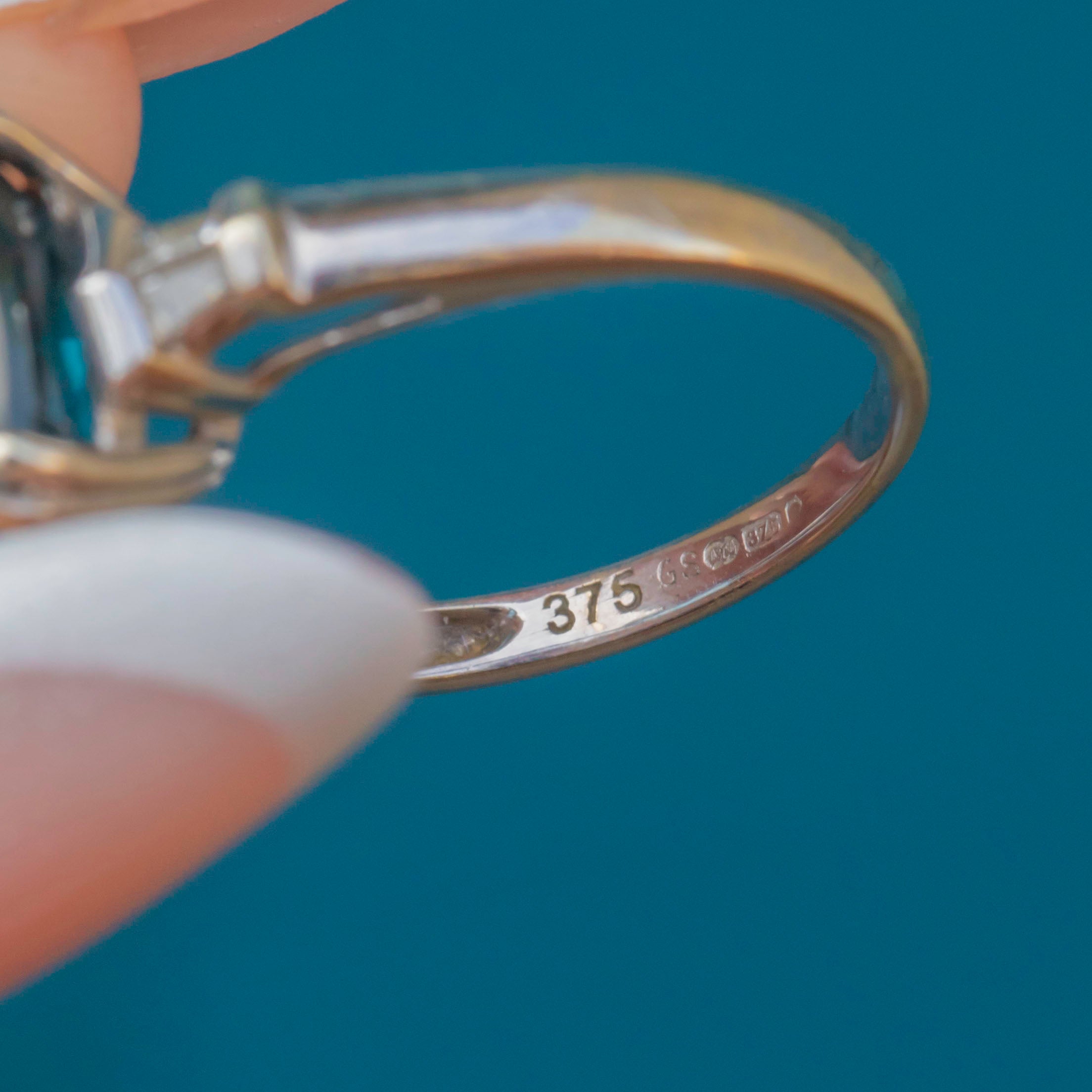 EXCELLENT: With nothing to report his 9ct White Gold Teal Spinel Diamond Ring is in excellent condition. Her synthetic Spinel is gorgeous as are her two Diamonds. Her White Gold is crisp and bright and holds the gemstone in place, allowing for confident wear!