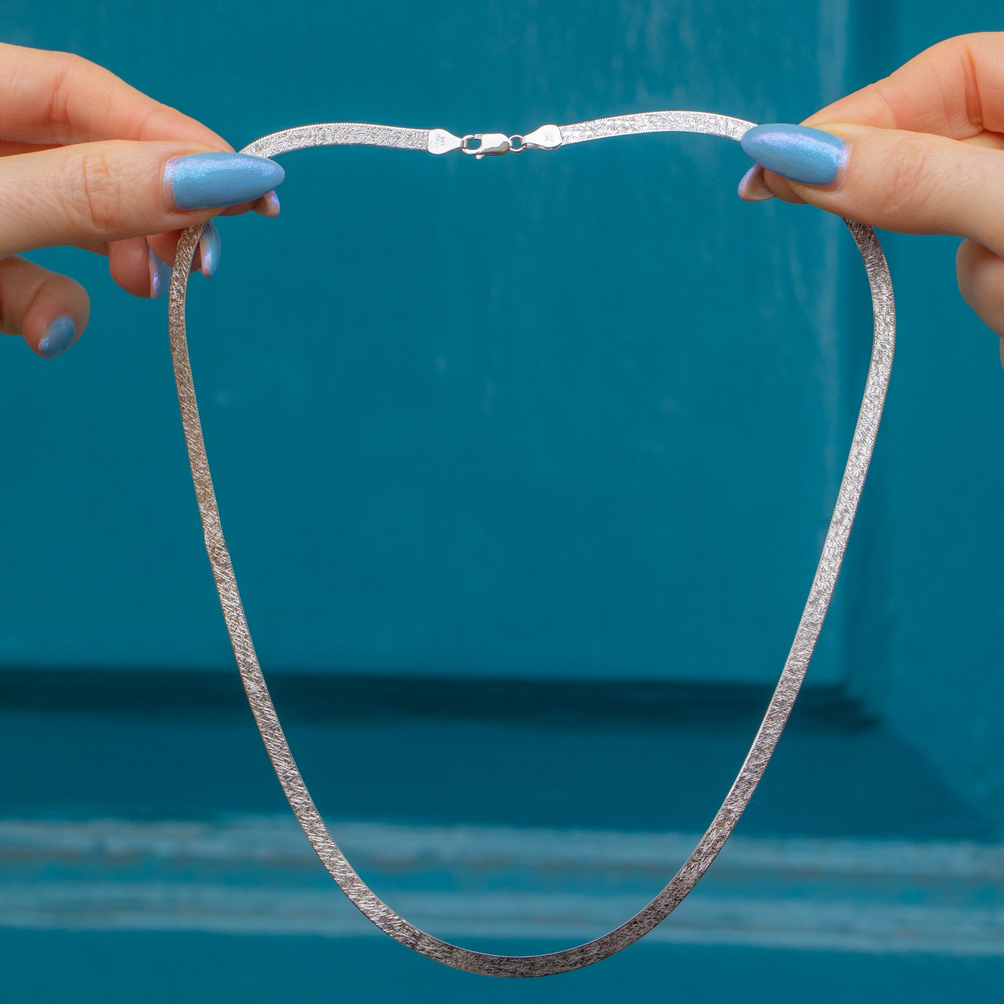 EXCELLENT. This 9ct White Gold textured chain is in excellent condition, with the herringbone links connected securely. The clasp is a great size, coming to you in perfect working order. This White Gold chain will quickly become a piece you can't live without.