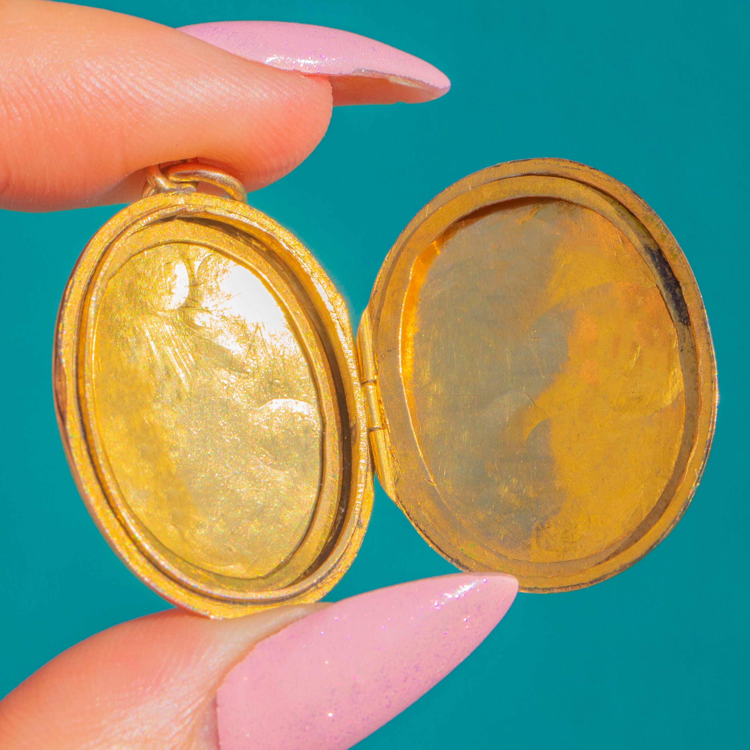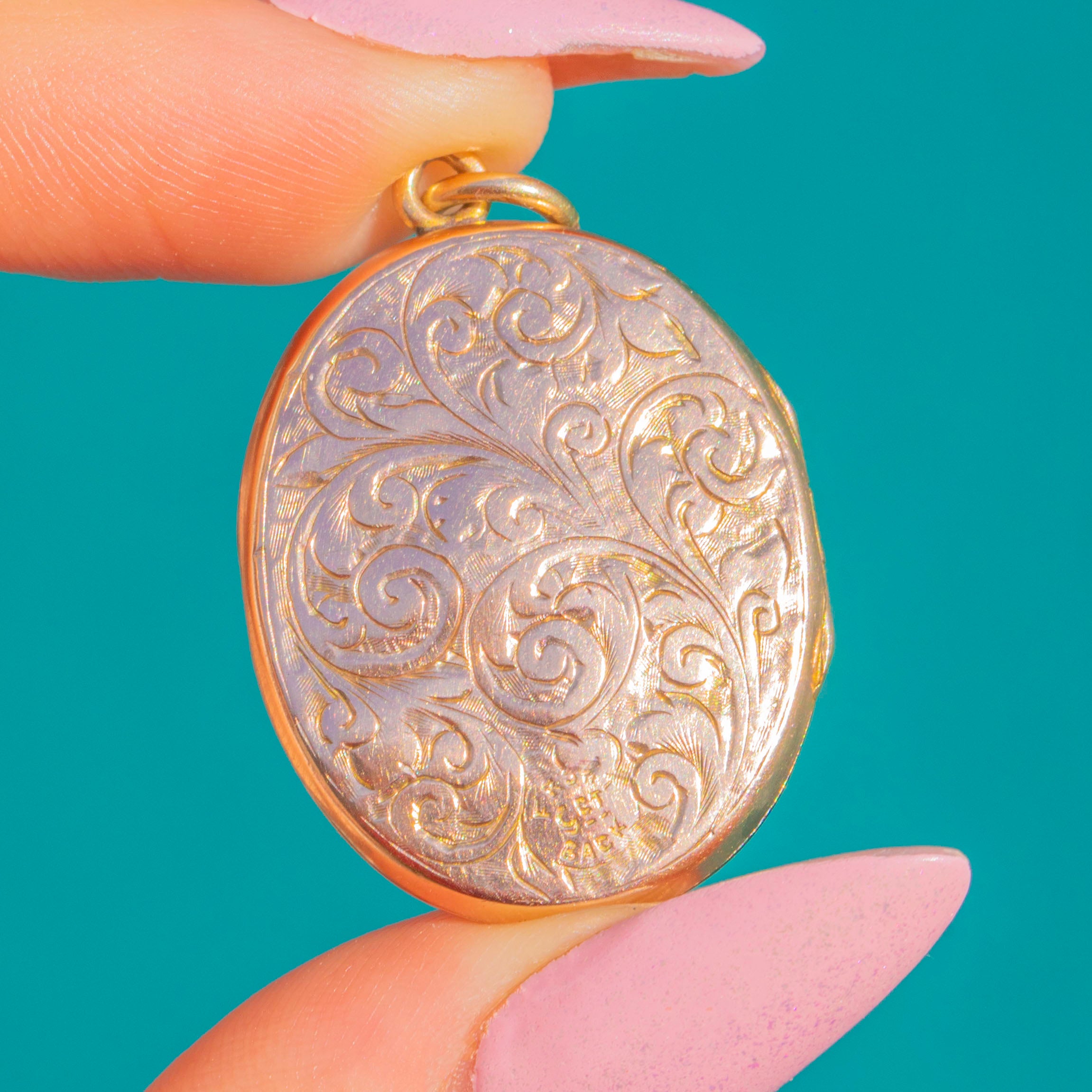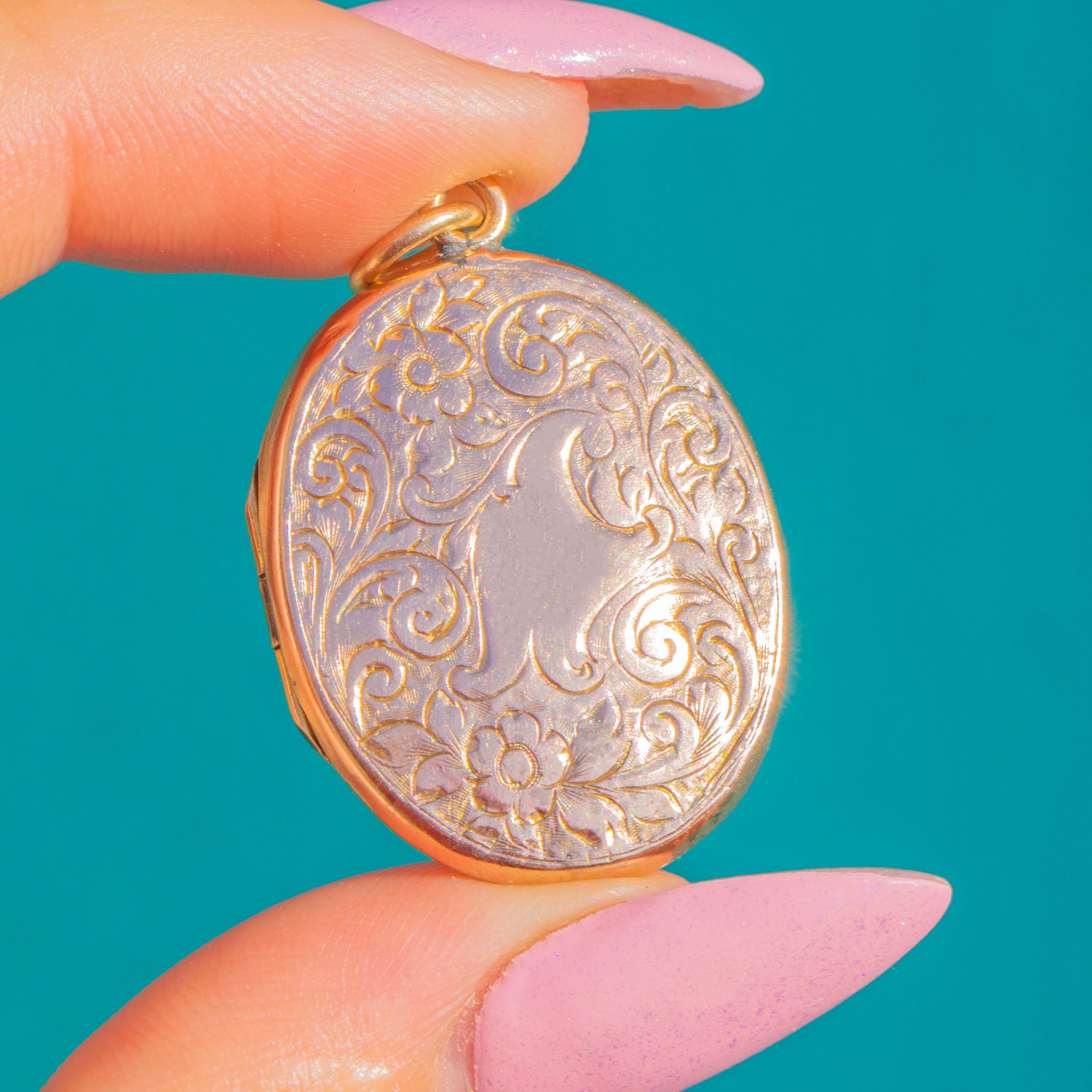 Elegantly proportioned with a romantic flourish, its deep, detailed engravings catch the light beautifully, while the smooth border provides a refined frame. Inside, slim rims are ready to hold cherished photographs or tiny keepsakes, making this a timeless piece of wearable sentiment.