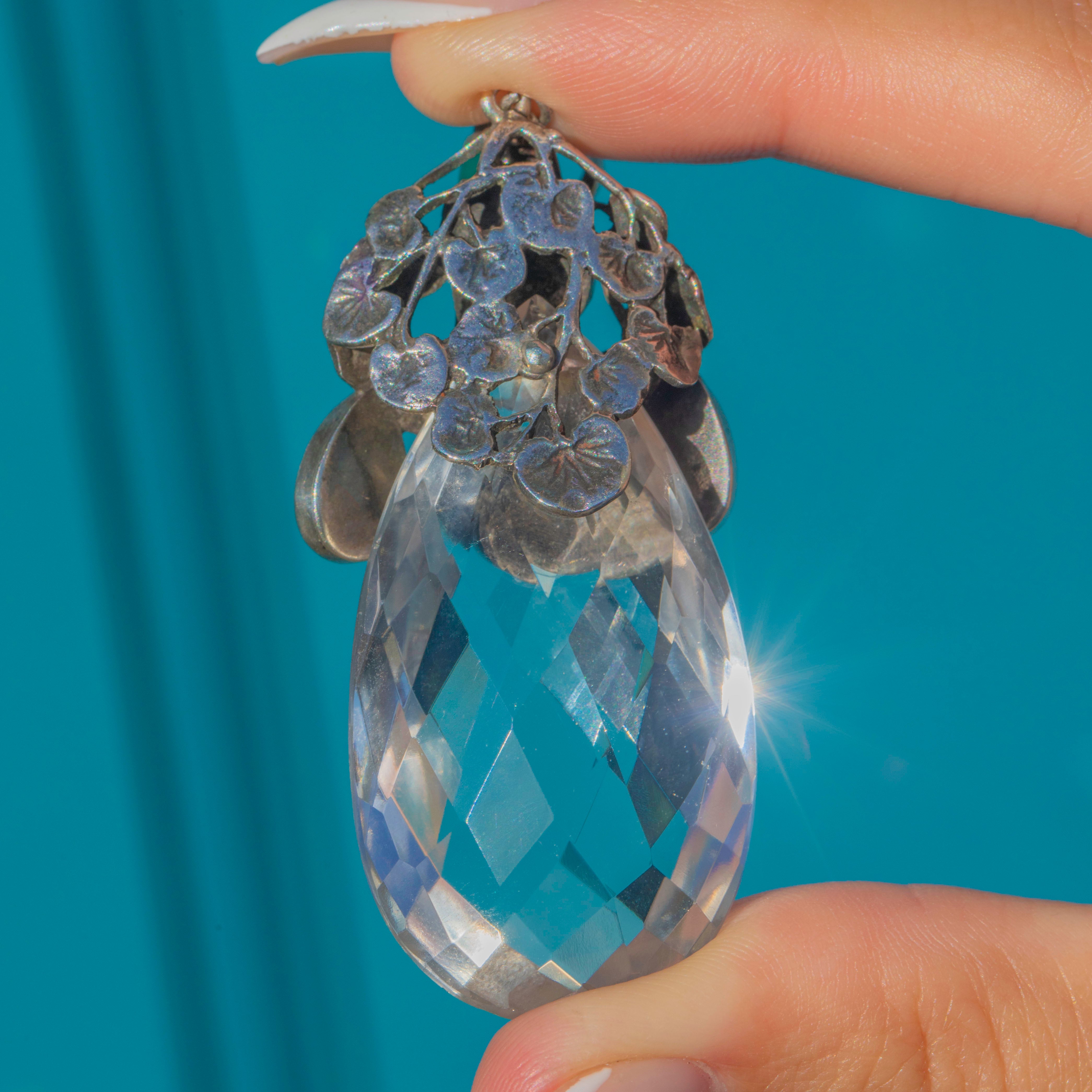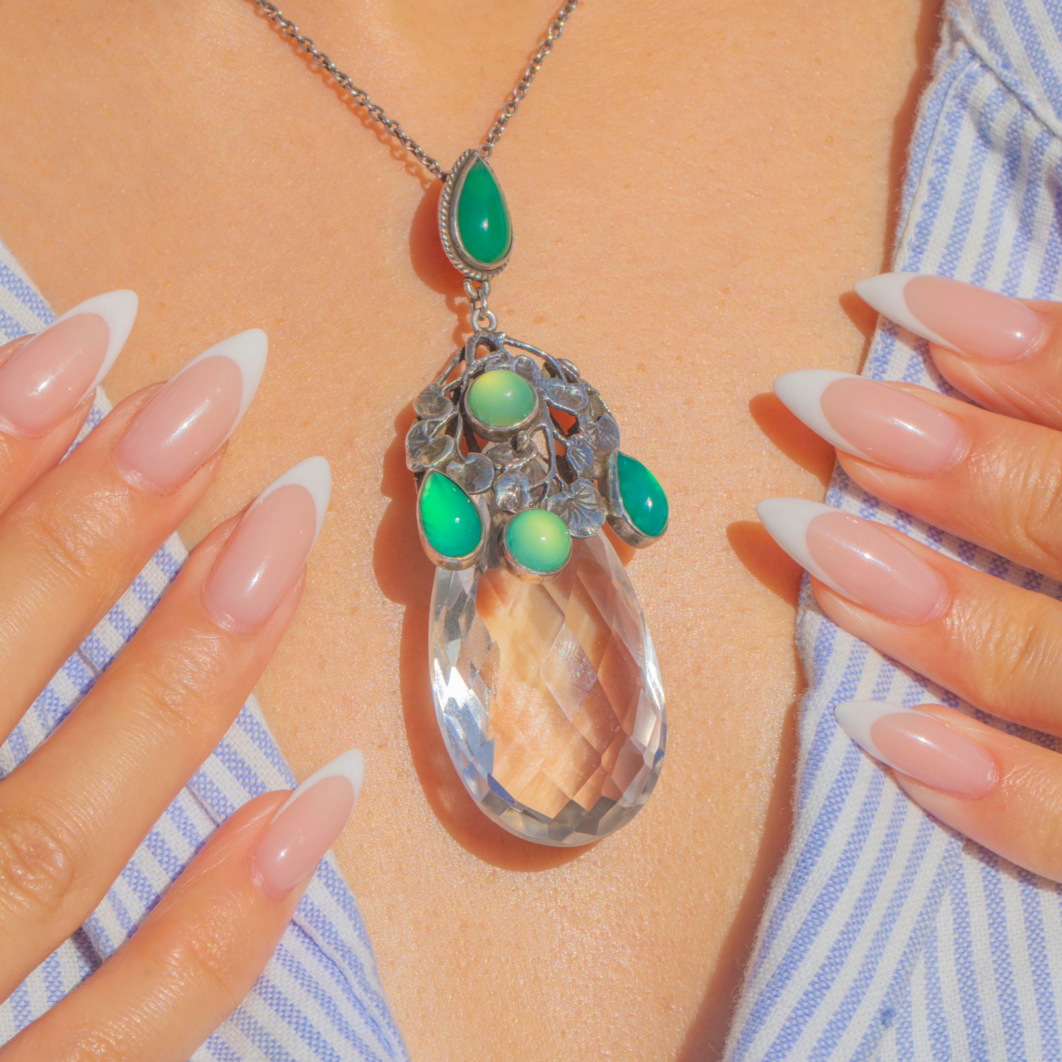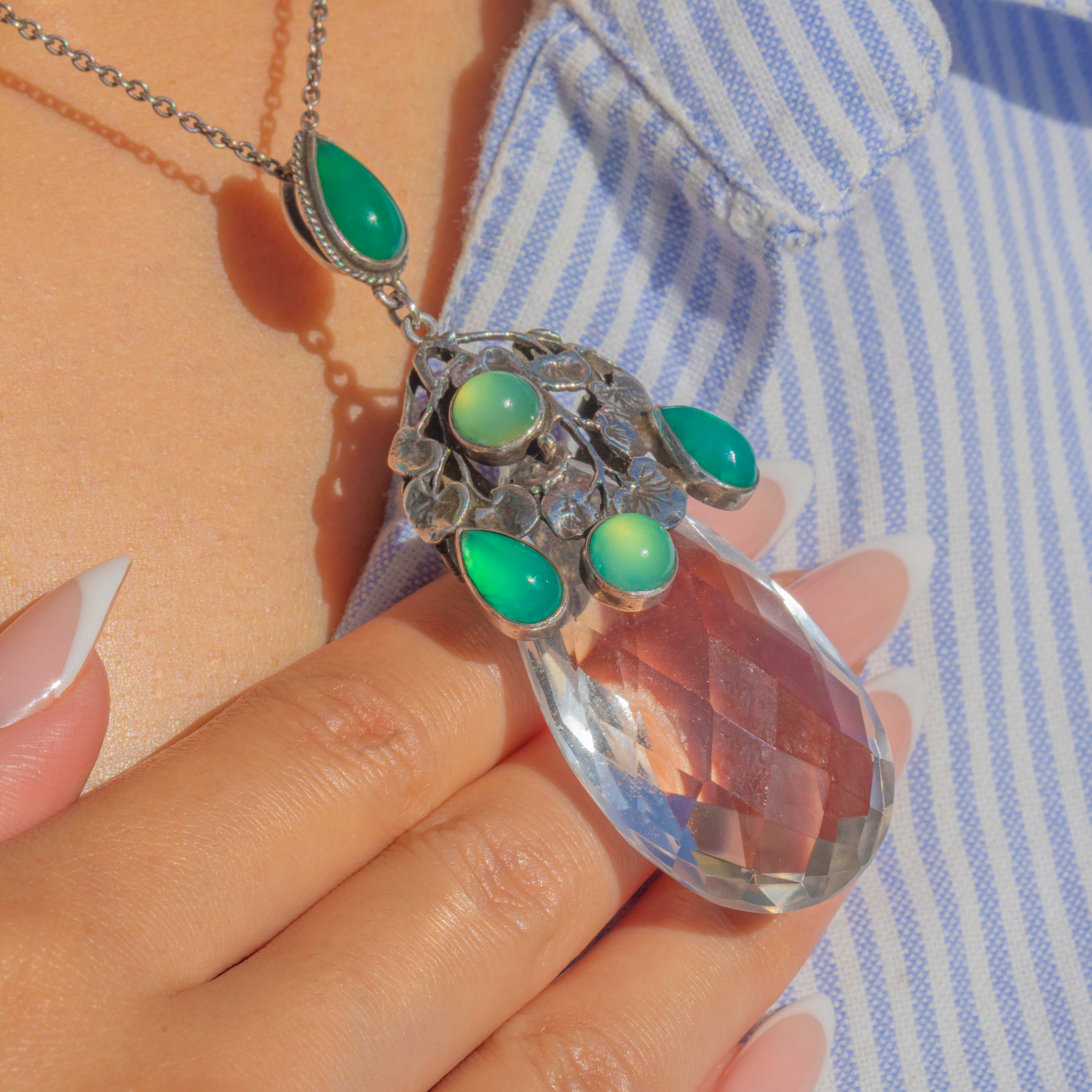 A spectacular Arts & Crafts pendant attributed to Amy Sandheim, showcasing a large faceted Rock Crystal teardrop crowned by a sculptural Silver foliate canopy set with glowing green Chalcedony.