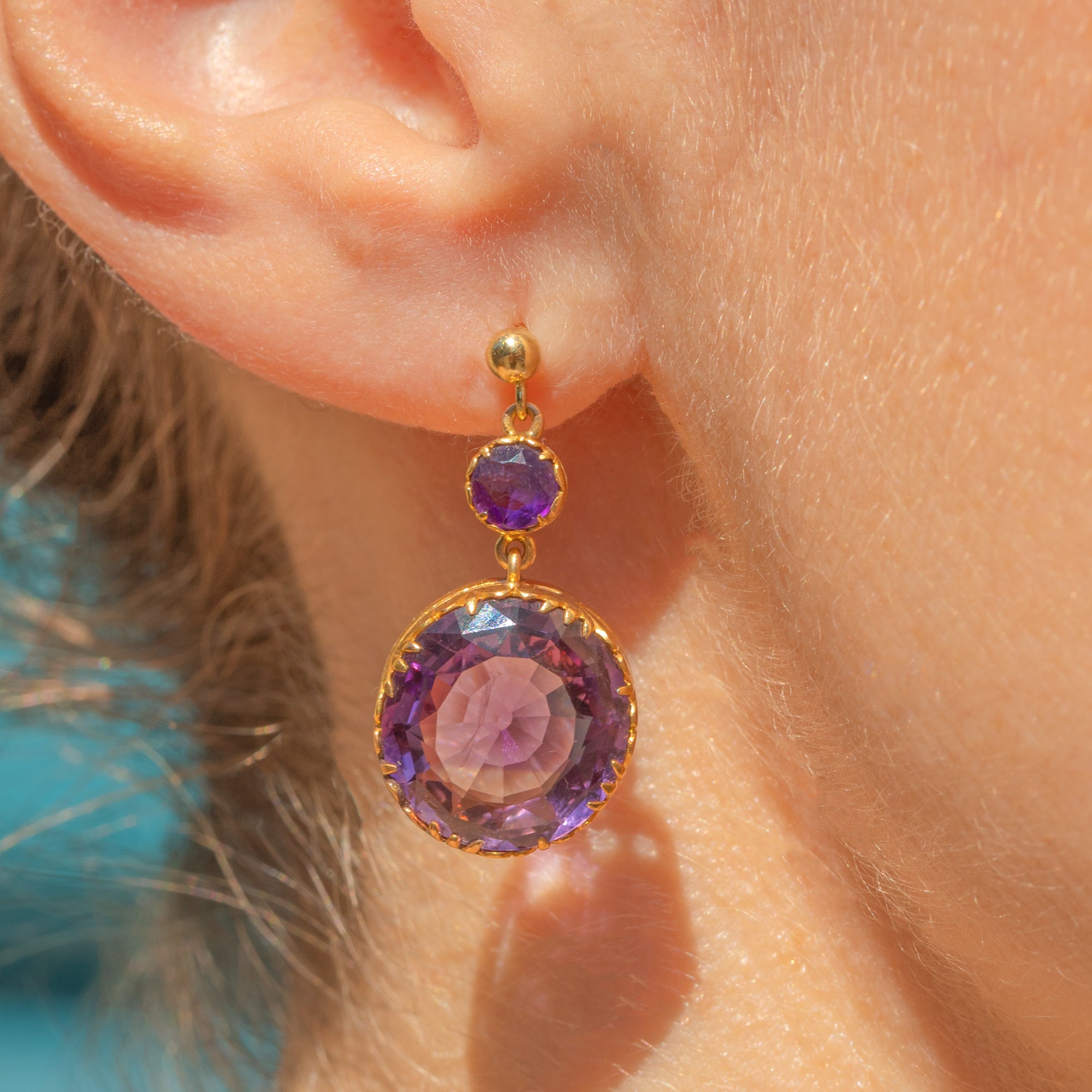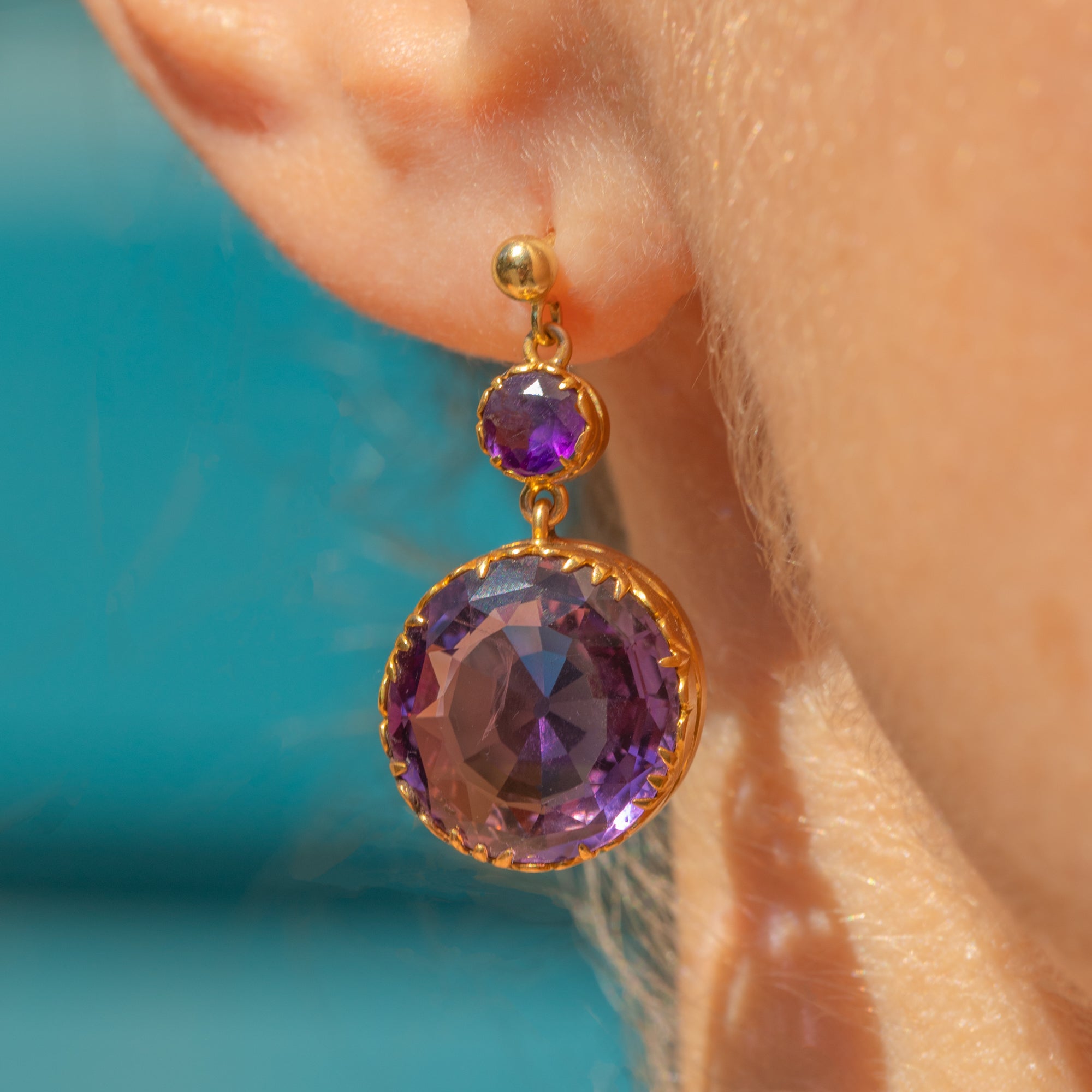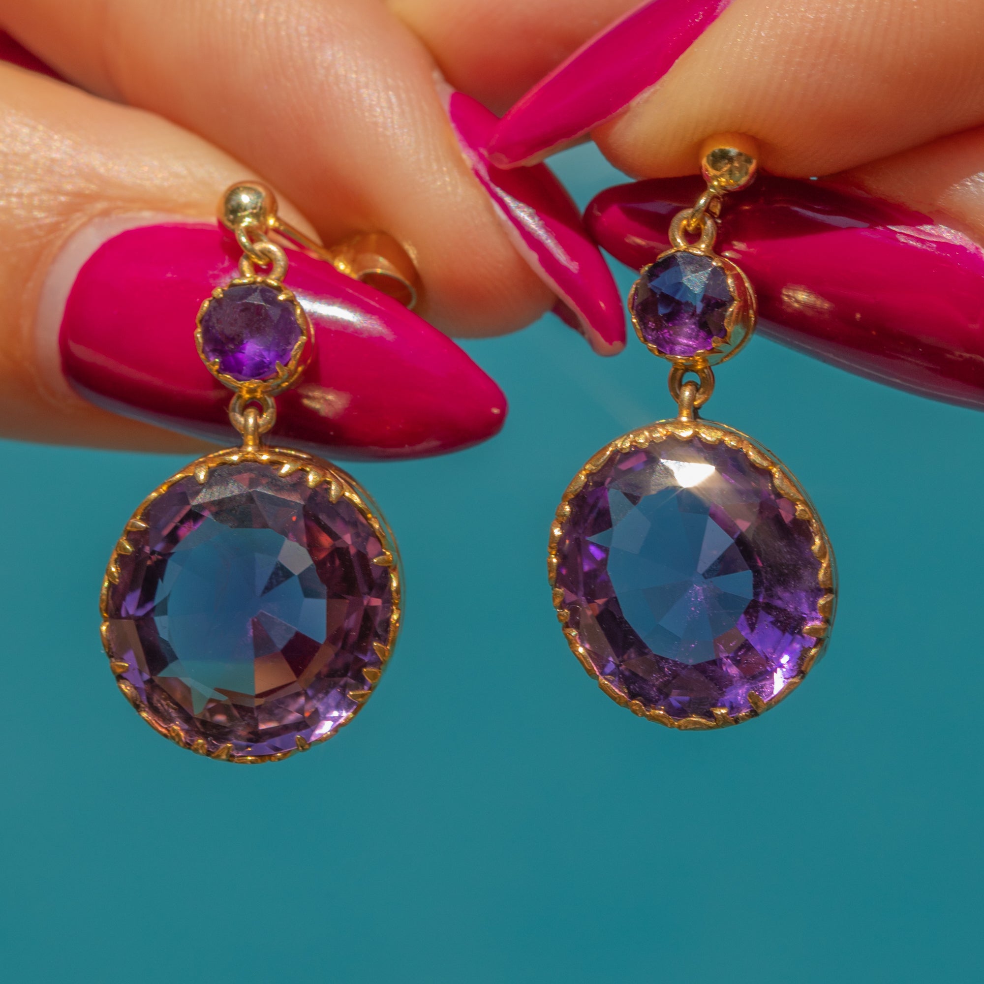 EXCELLENT: The Amethysts are stunning, vibrant and securely set, with no chips or surface wear. The Gold has a rich, buttery hue and shows no signs of wear around the settings, ensuring the gemstones remain securely set. There are subtle signs indicating the earrings were once converted from a different piece of jewellery, adding a touch of history to their charm.