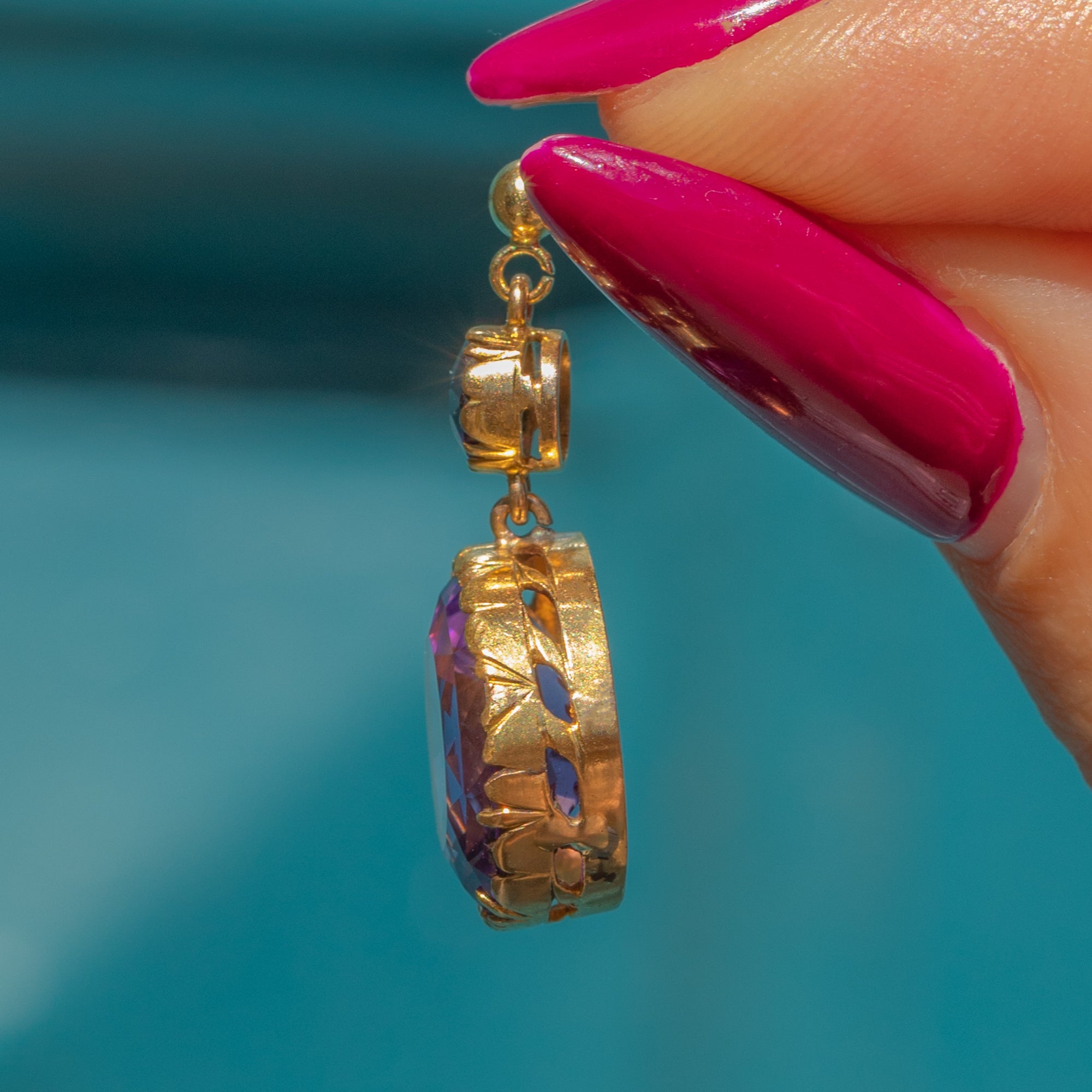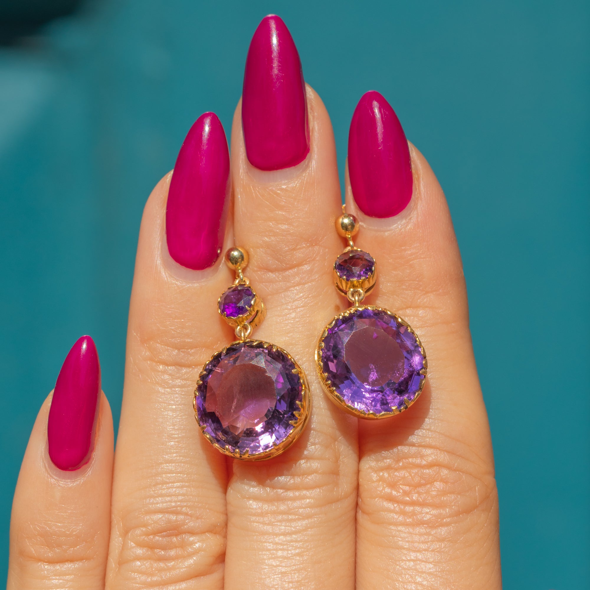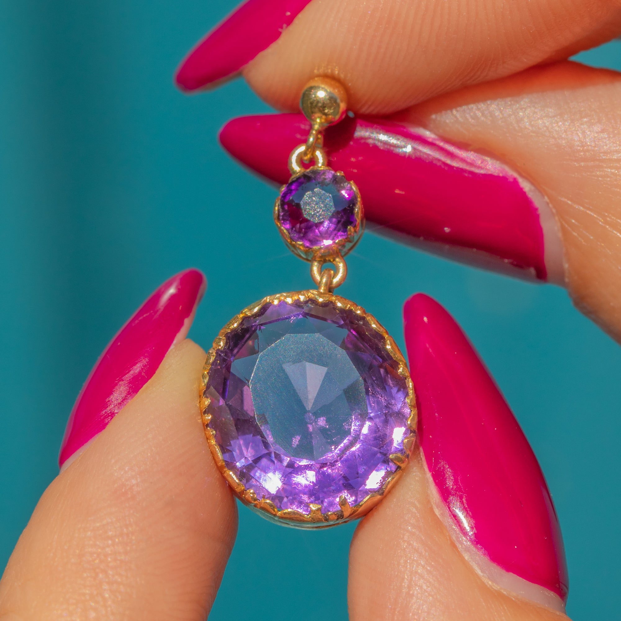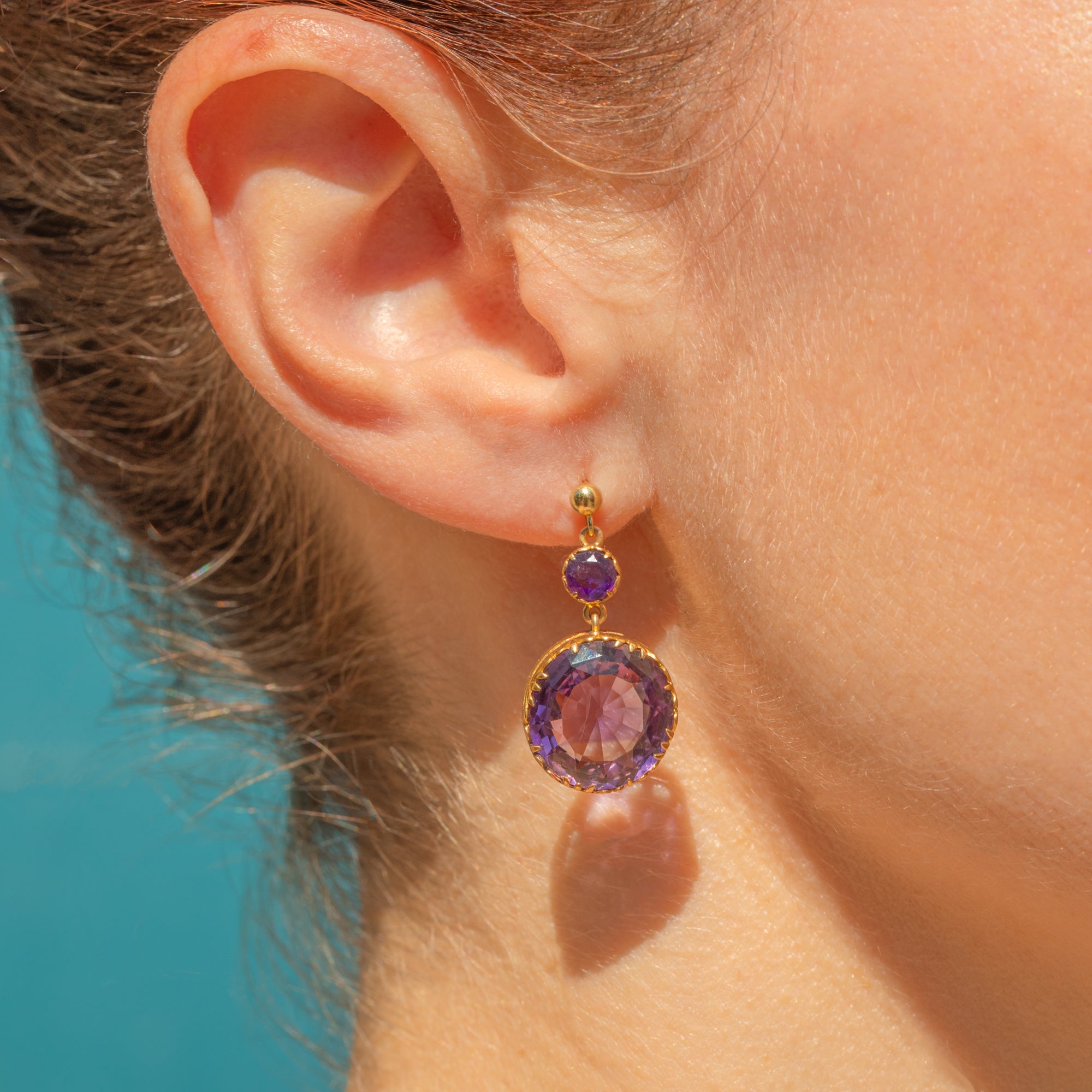 EXCELLENT: The Amethysts are stunning, vibrant and securely set, with no chips or surface wear. The Gold has a rich, buttery hue and shows no signs of wear around the settings, ensuring the gemstones remain securely set. There are subtle signs indicating the earrings were once converted from a different piece of jewellery, adding a touch of history to their charm.