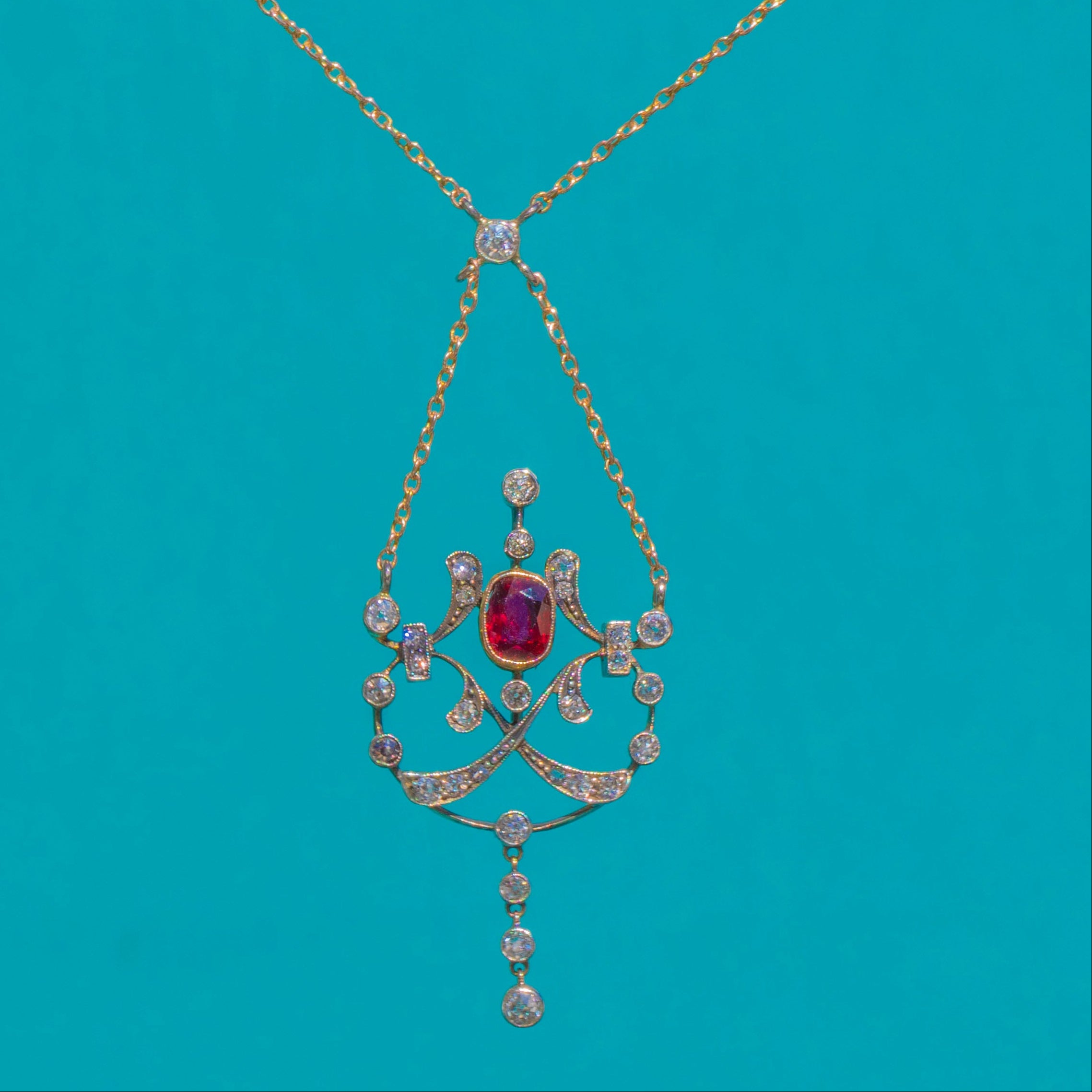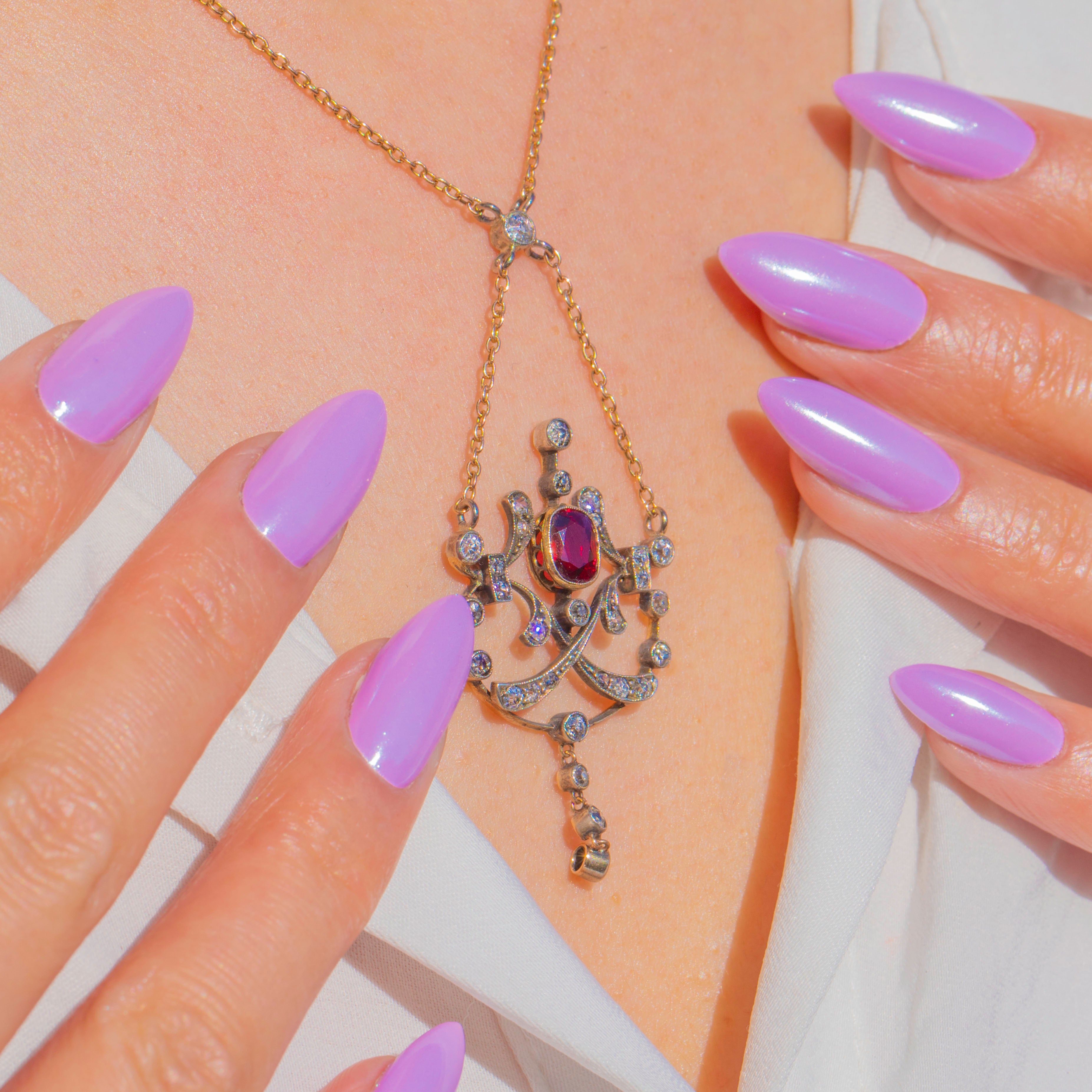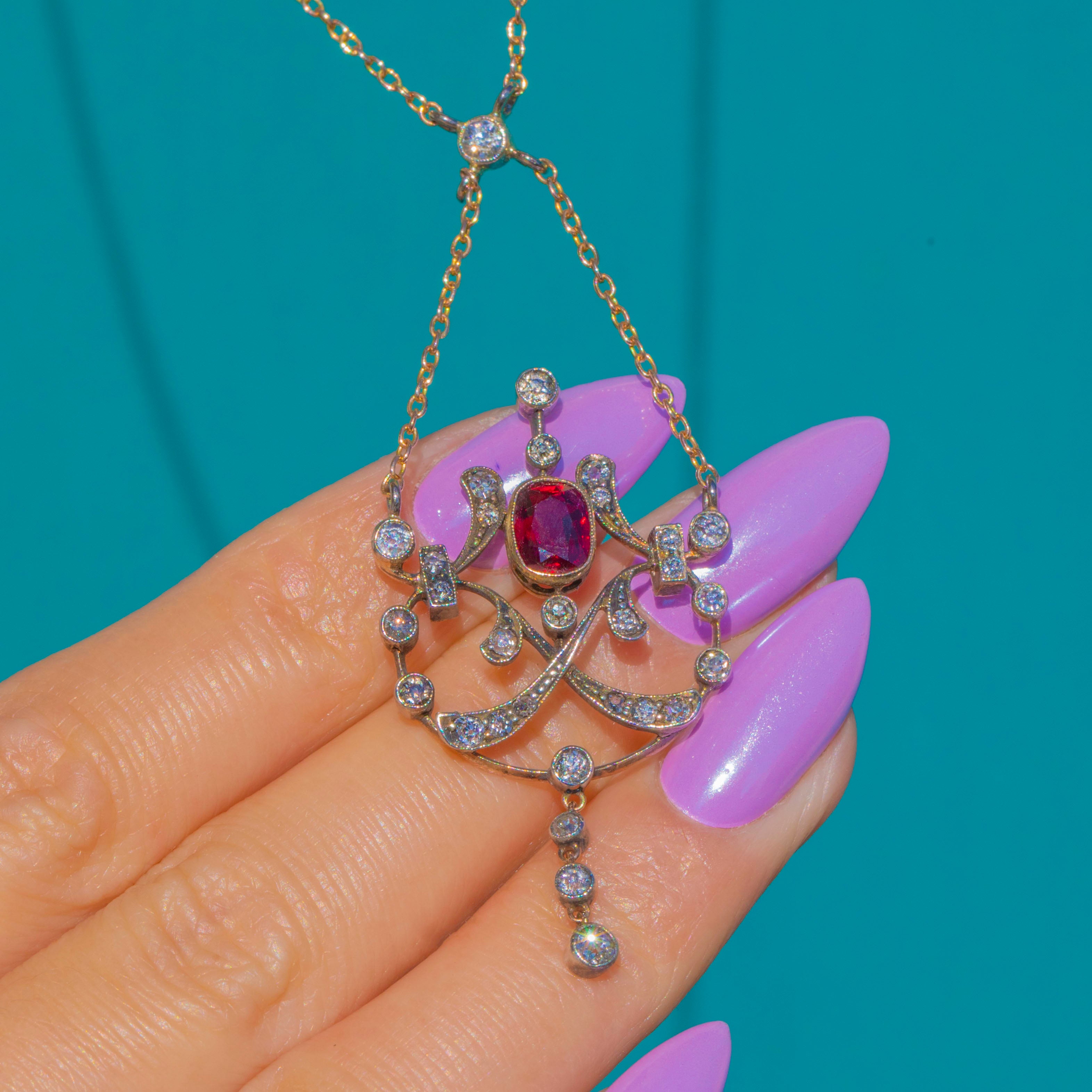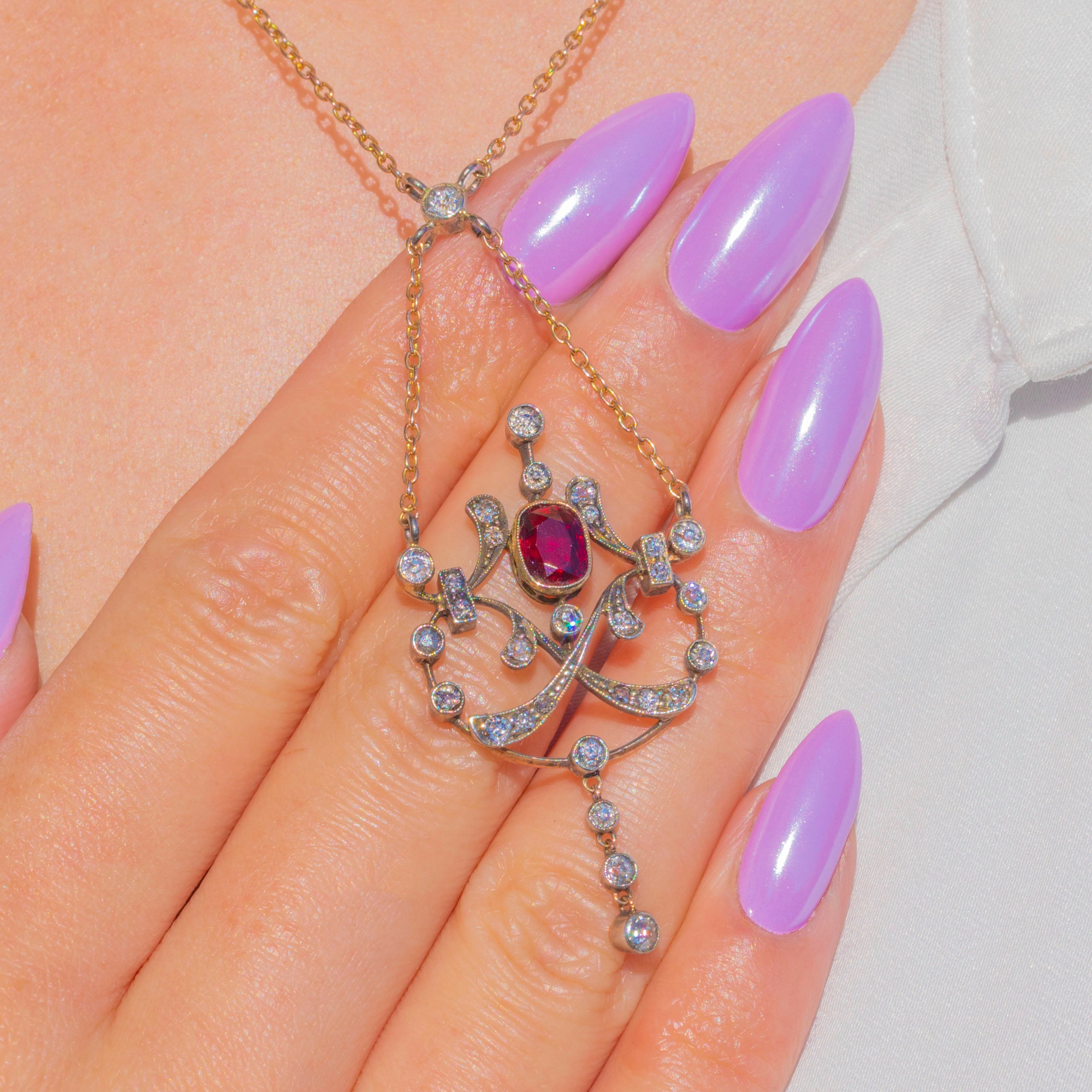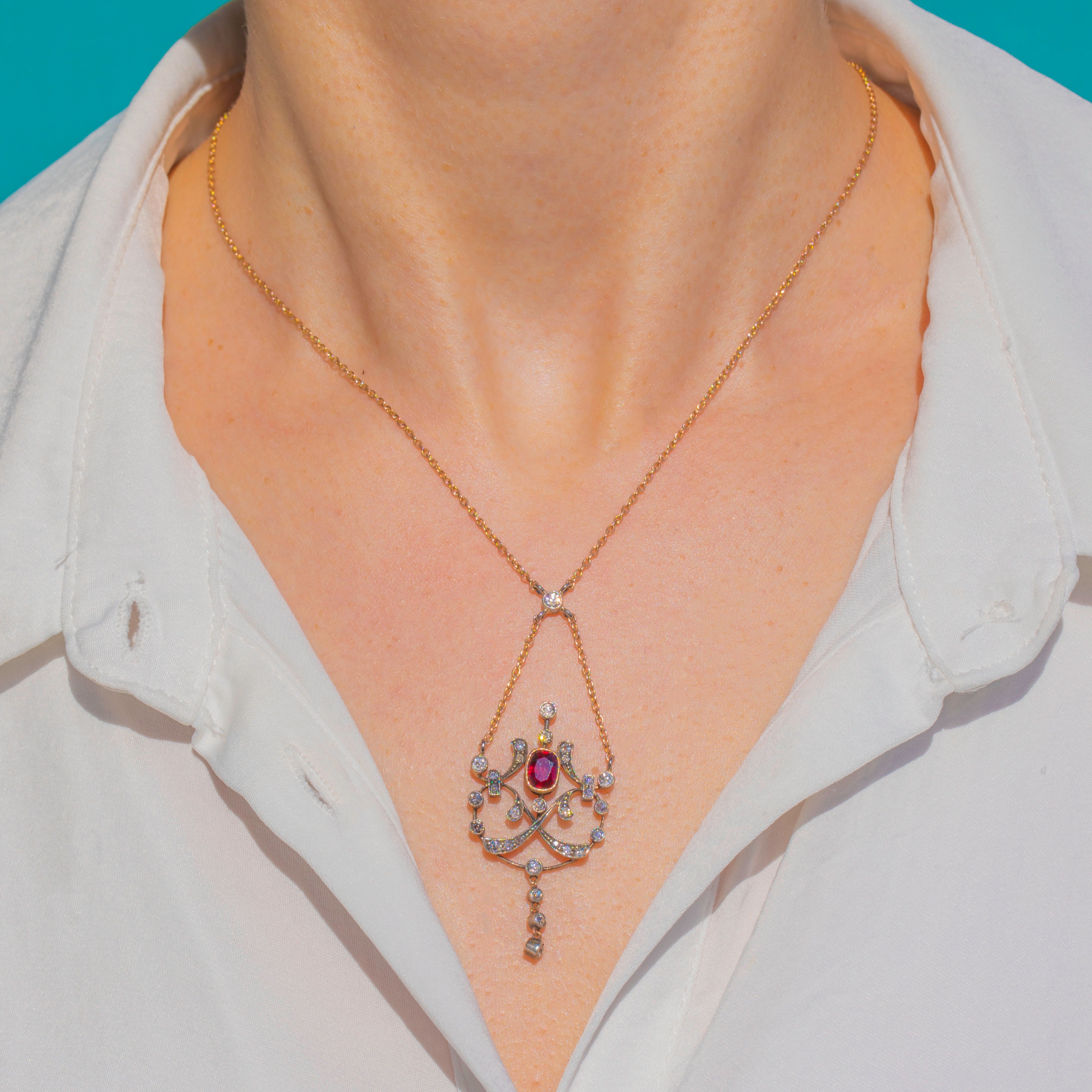 An exquisite antique lavaliere, this pendant necklace centres a vivid 1.90ct Ruby in a raised bezel, framed by a constellation of old-cut Diamonds. Delicate openwork scrolls with fine millegrain detailing flow into an articulated three-stone drop, lending graceful movement and that quintessential Edwardian romance.