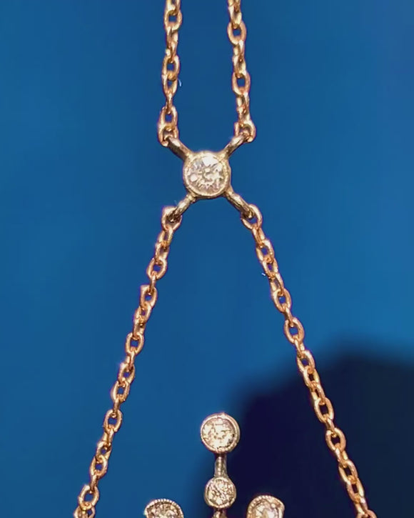 The two-tone palette is irresistible: crisp Platinum Diamond settings for brilliance, backed in glowing 15ct Gold with a fine 15ct Gold chain. Ornate yet airy, this elegant jewel sits beautifully at the collarbone and sparkles with every step.