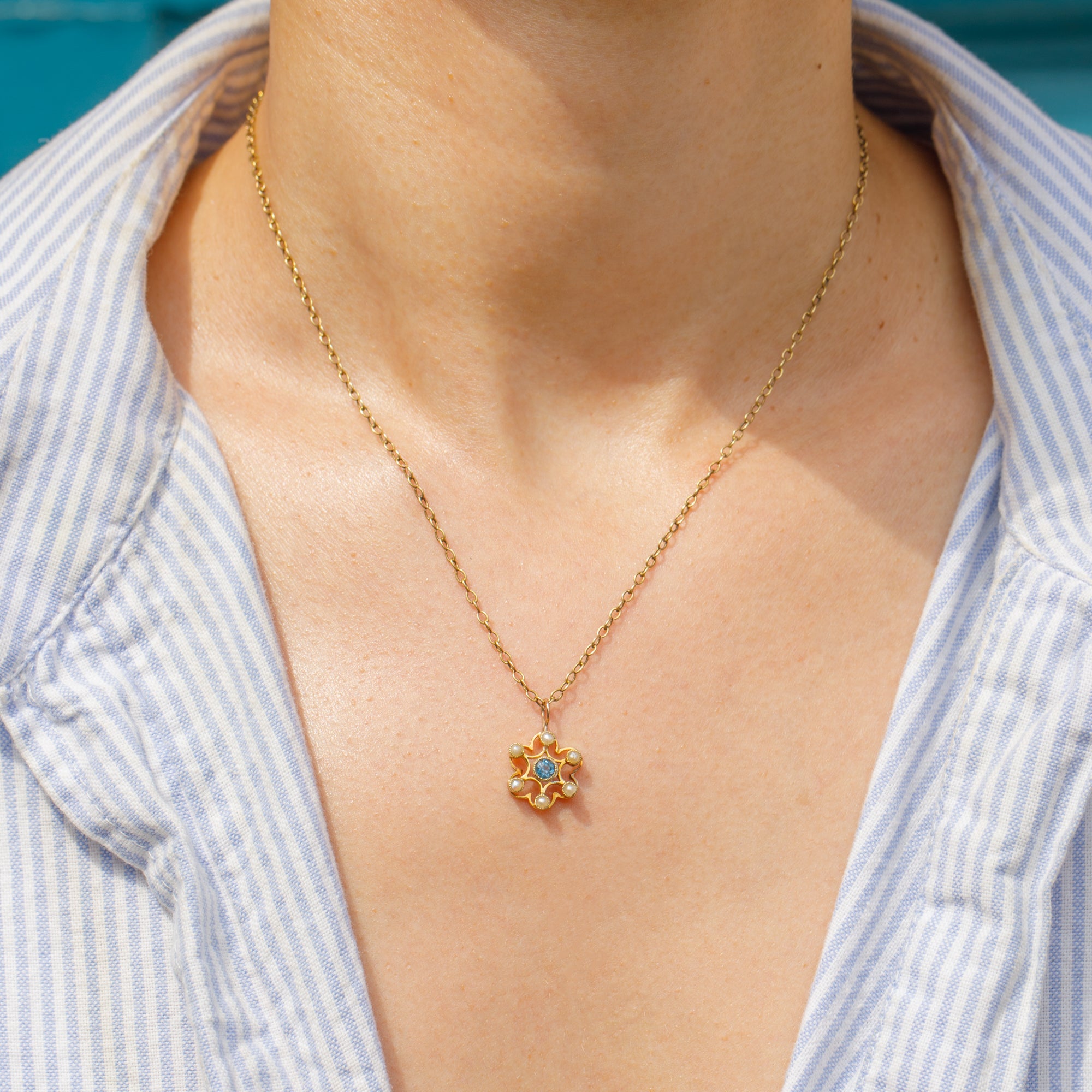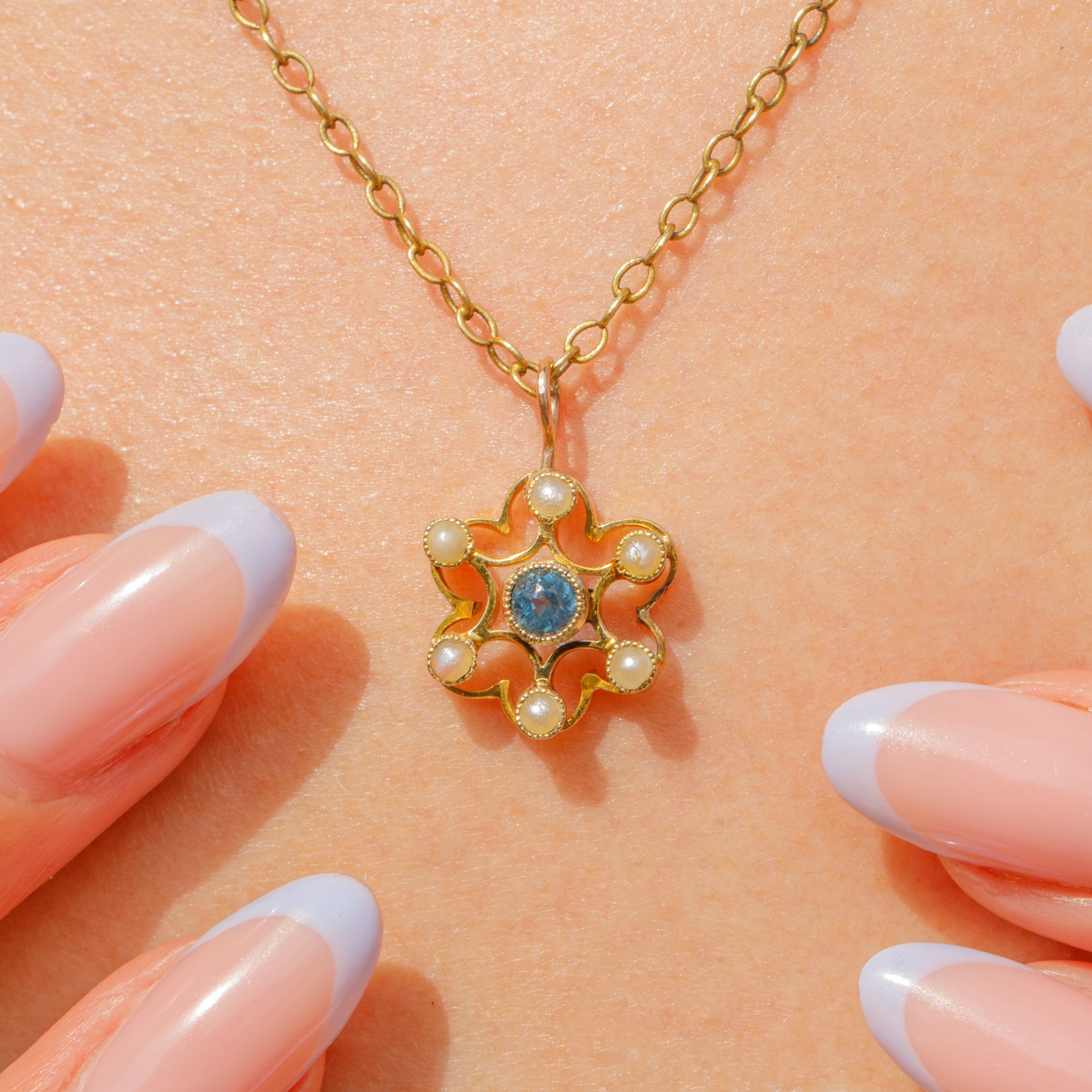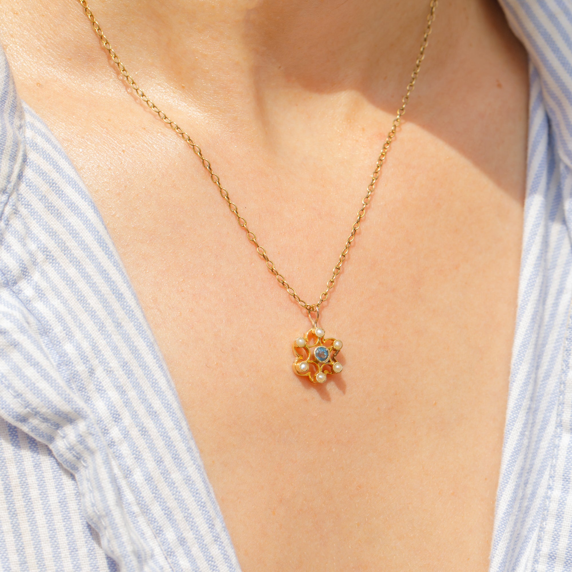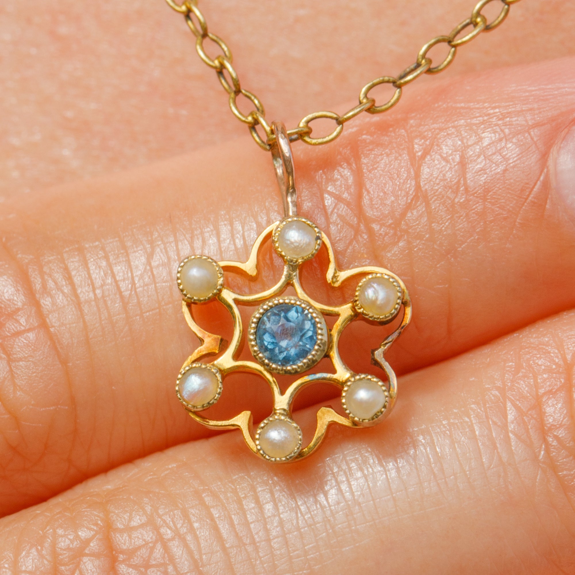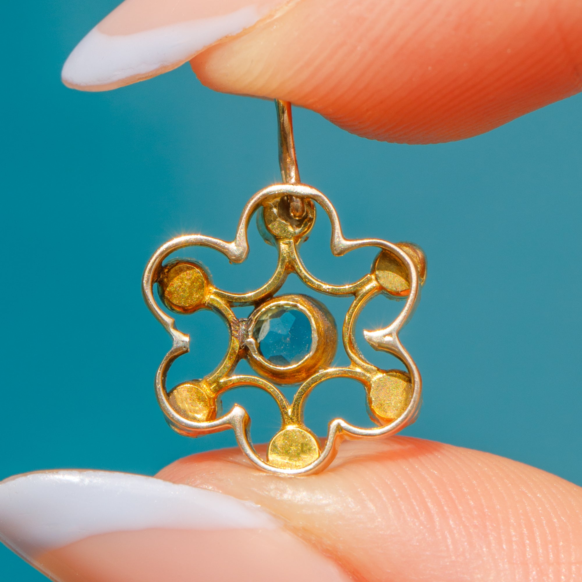 VERY GOOD-EXCELLENT: This antique 15ct Gold Blue Tourmaline Pearl floral charm is in great condition. The gemstones are radiant and set securely in their bezels. There are some spots of discolouration to the back of the pendant commensurate with age, though this is difficult to notice, particularly when the pendant is worn. With a securely soldered jump bale, she is ready to be worn and enjoyed!
