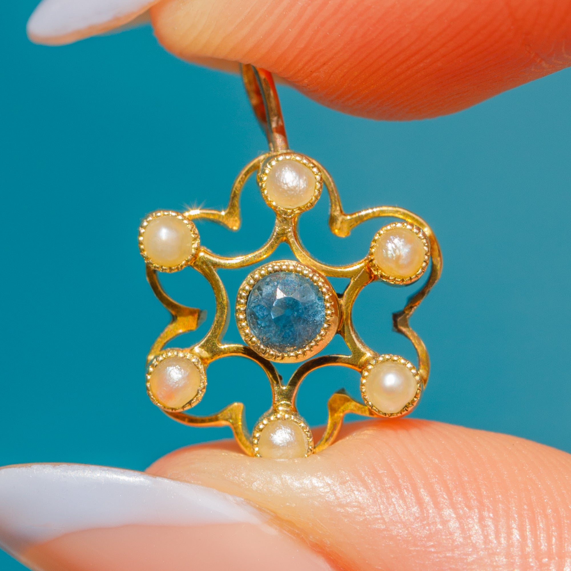 Antique 15ct Gold Blue Tourmaline Pearl Flower Charm