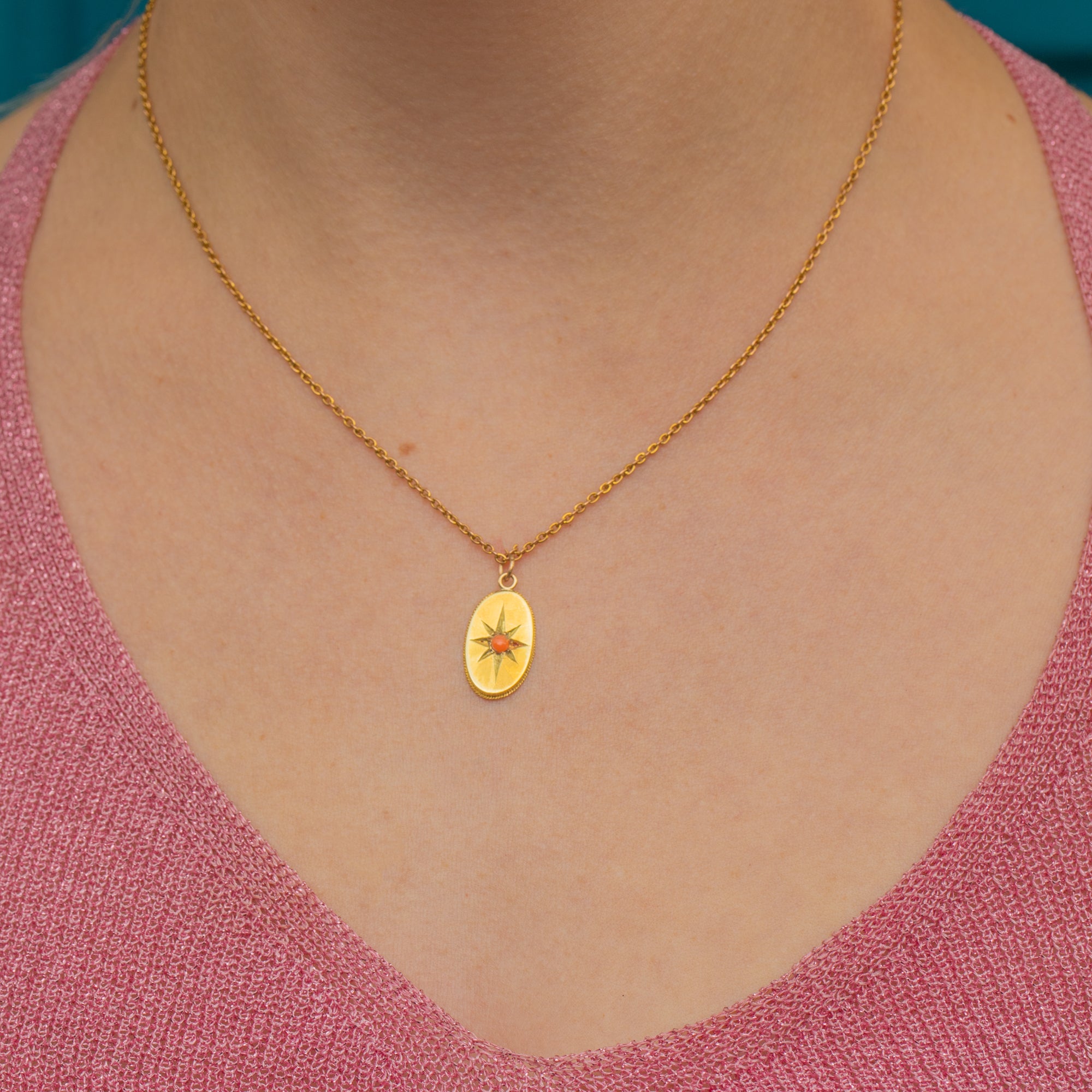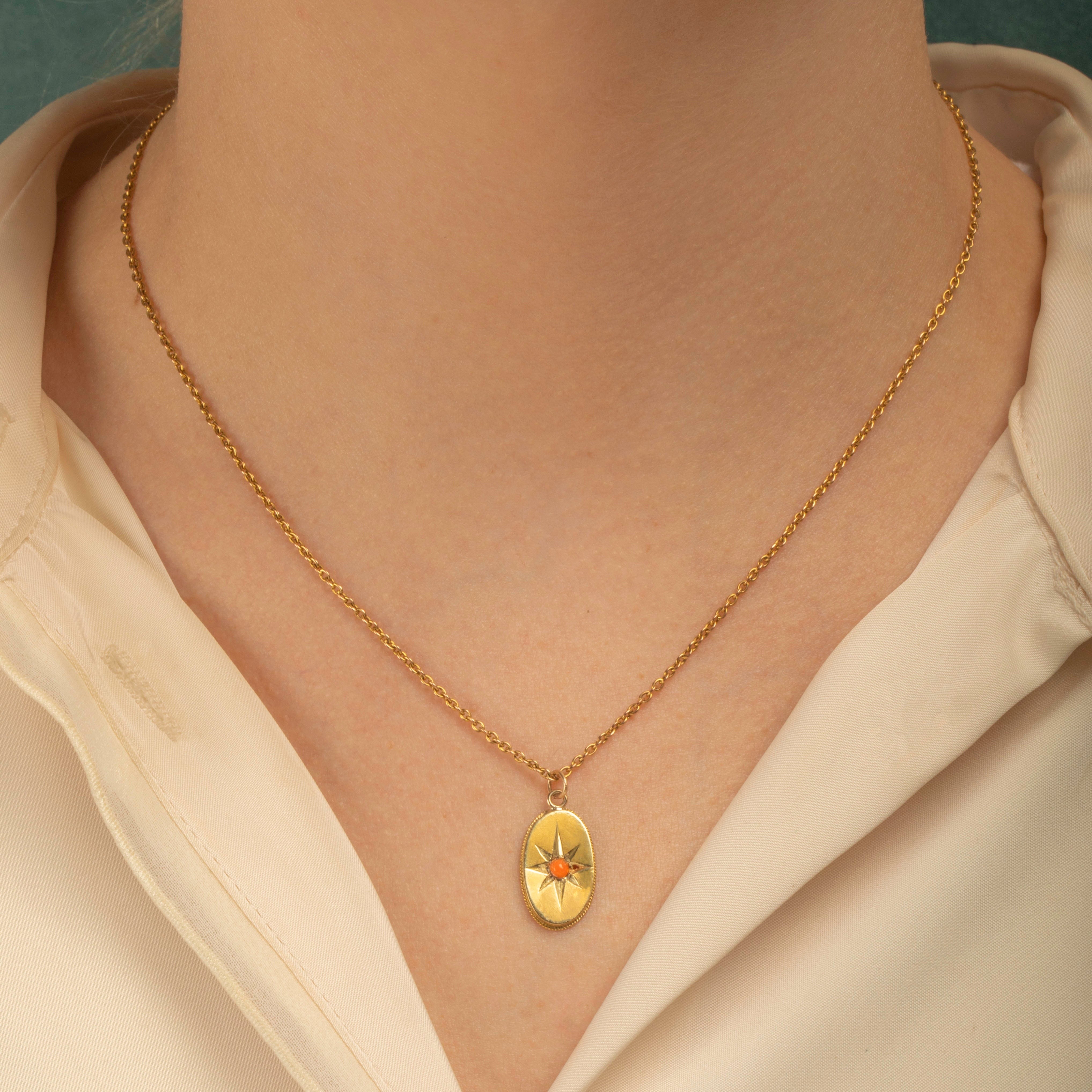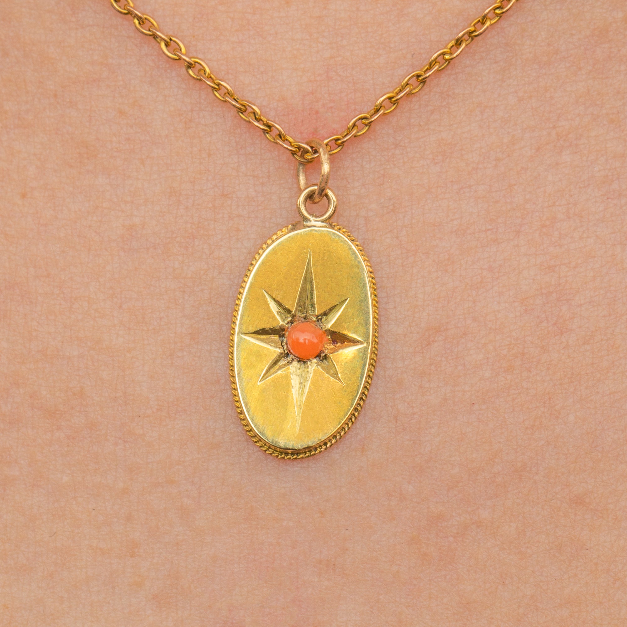 VERY GOOD. This Victorian 15ct Gold star set Coral pendant is in very good condition. The Gold is smooth and glossy, with a bright saturation. Under close inspection, there are two small gaps in the Gold, within the stars points, but the Coral is securely held in place. Complete with a soldered jump ring, you can wear this celestial treasure for years to come!