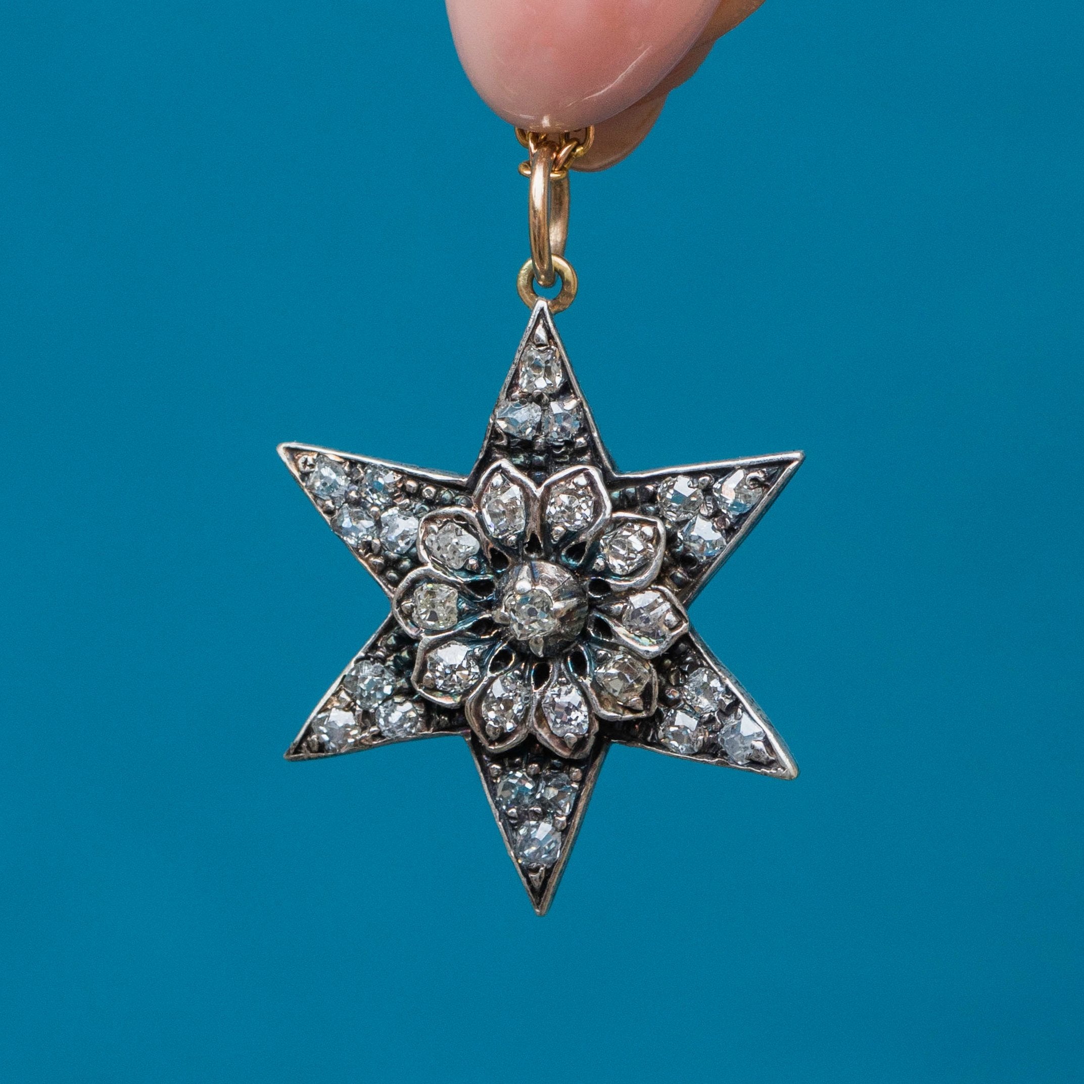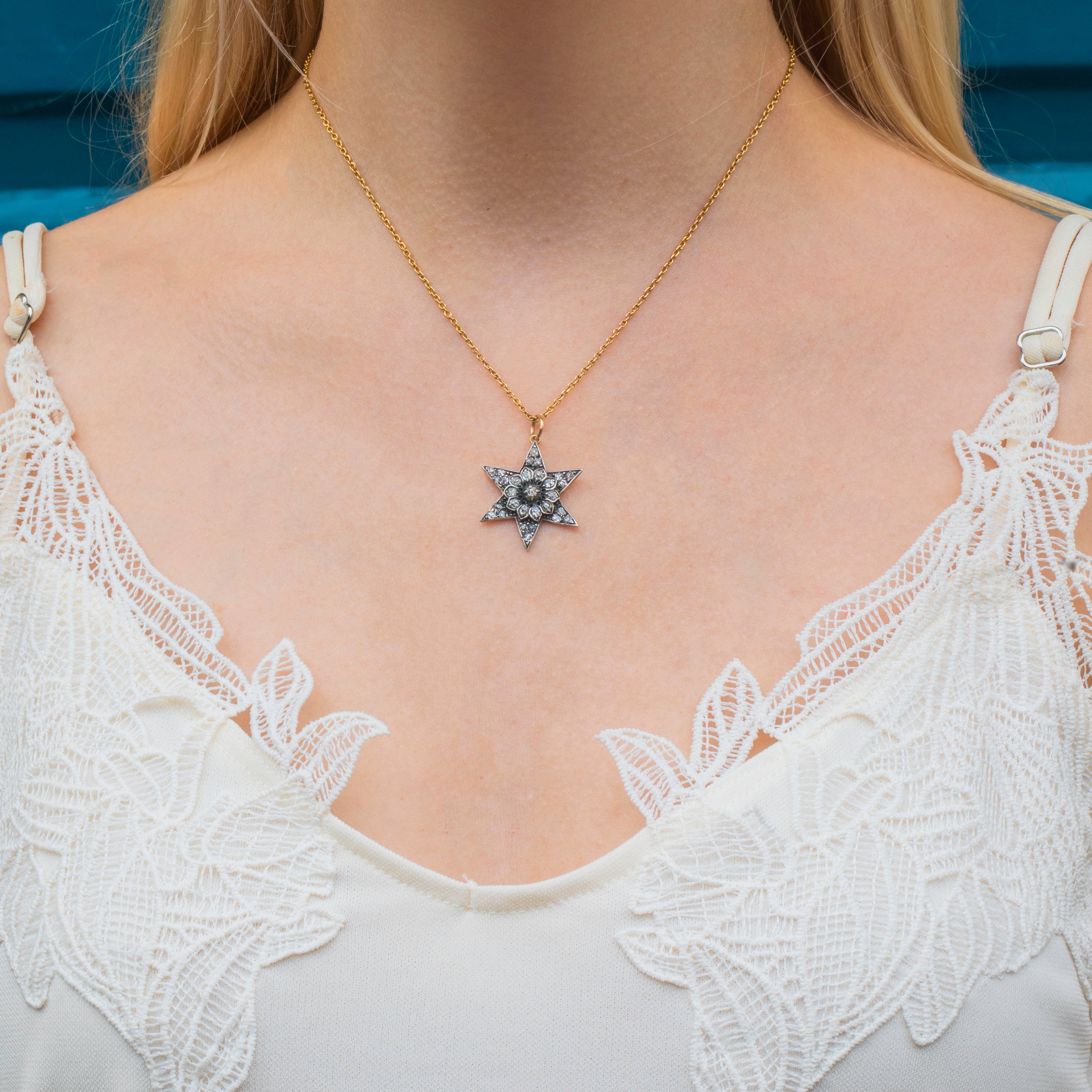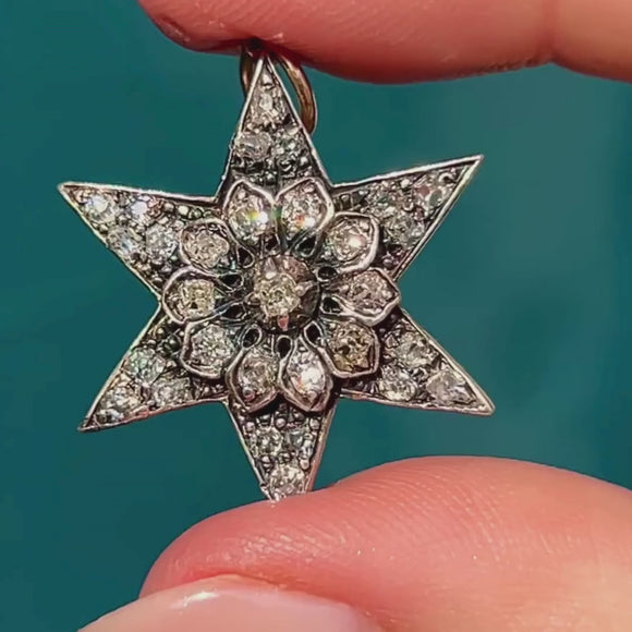 This bright Victorian 15ct Gold Diamond starburst pendant is just breathtaking! Exuberant in sparkle, this pendant is a must-have for anyone who collects antique jewellery! She will sparkle under the warm candle-lit parties or balls you are attending or the fairy-lit Christmas lights! She is an all season pendant that will dazzle anyone that looks at her with a total weight of 0.75ct!