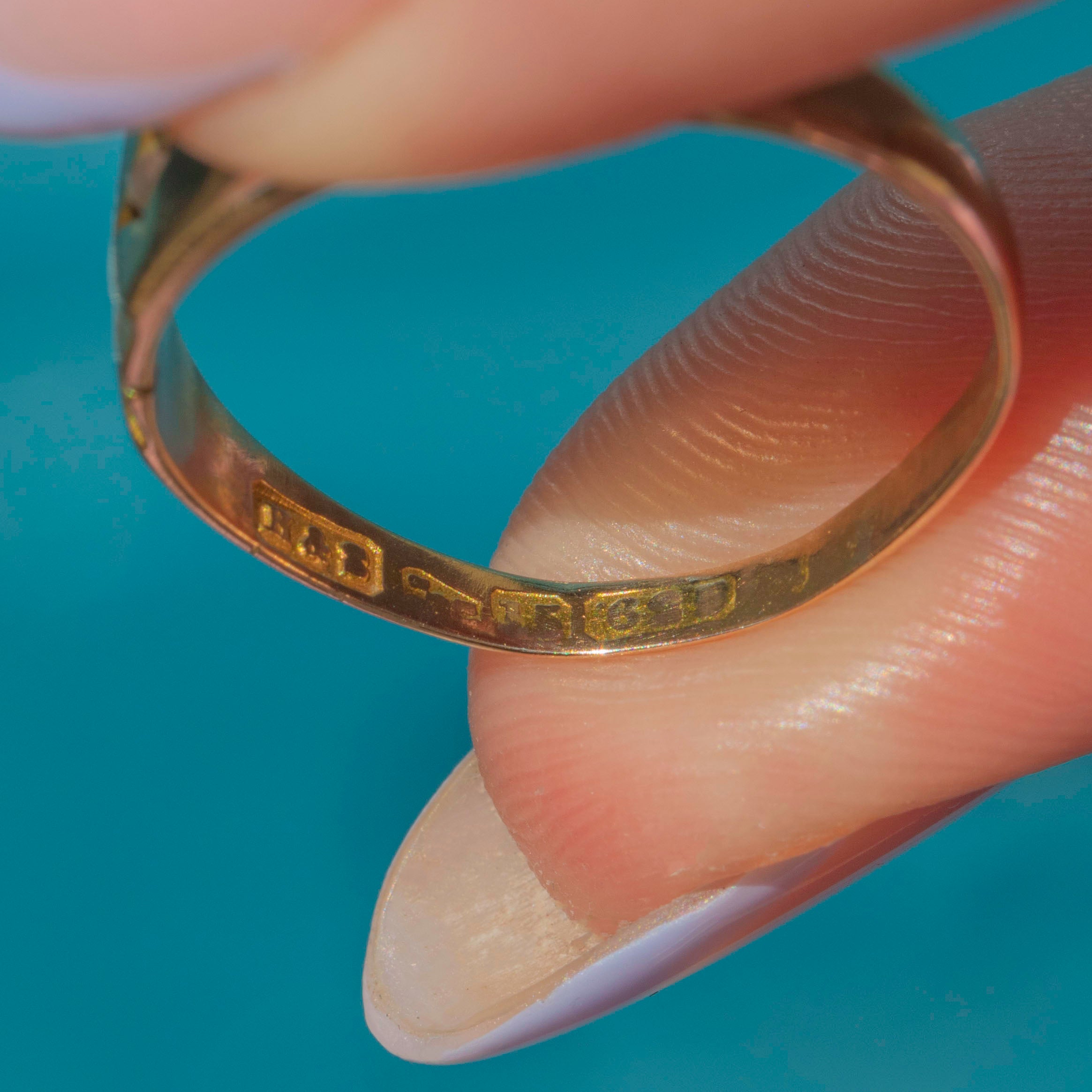 VERY GOOD: This antique 18ct Gold Diamond three stone gypsy ring is in great condition. Her Gold is buttery and warm, and her Diamonds are securely set. There are some minor signs of wear and scratches to the band, commensurate with age. While a resize mark is visible and obscuring the date letter on the antique hallmarks, she is still delightful! This Victorian Diamond trilogy ring will make a superb addition to your collection!