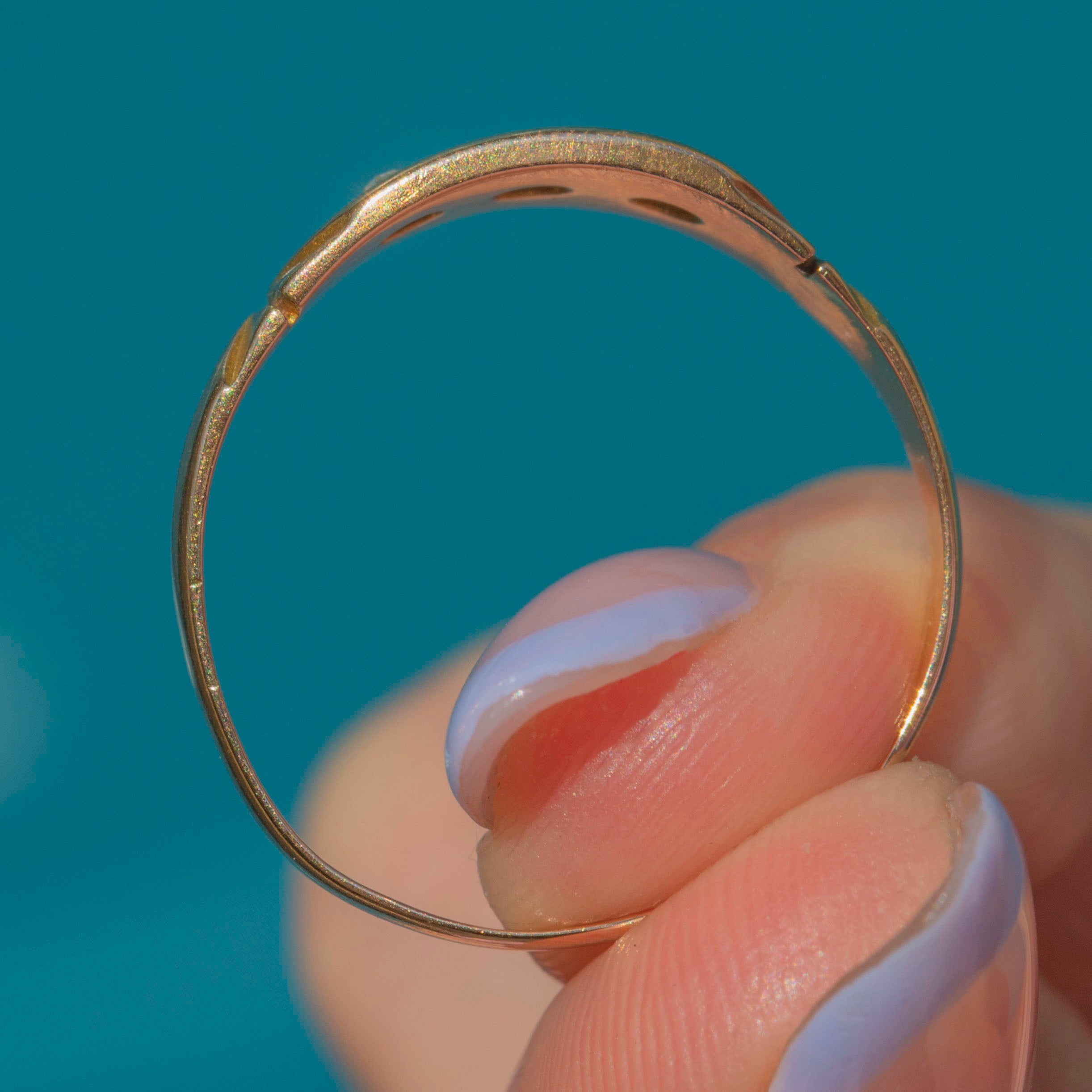 Crafted from buttery 15ct yellow Gold, this Victorian ring features three shimmering Diamonds, each scintillating as they catch the light. Her Diamonds sit within star settings, giving this antique gypsy ring a lovely celestial charm.
