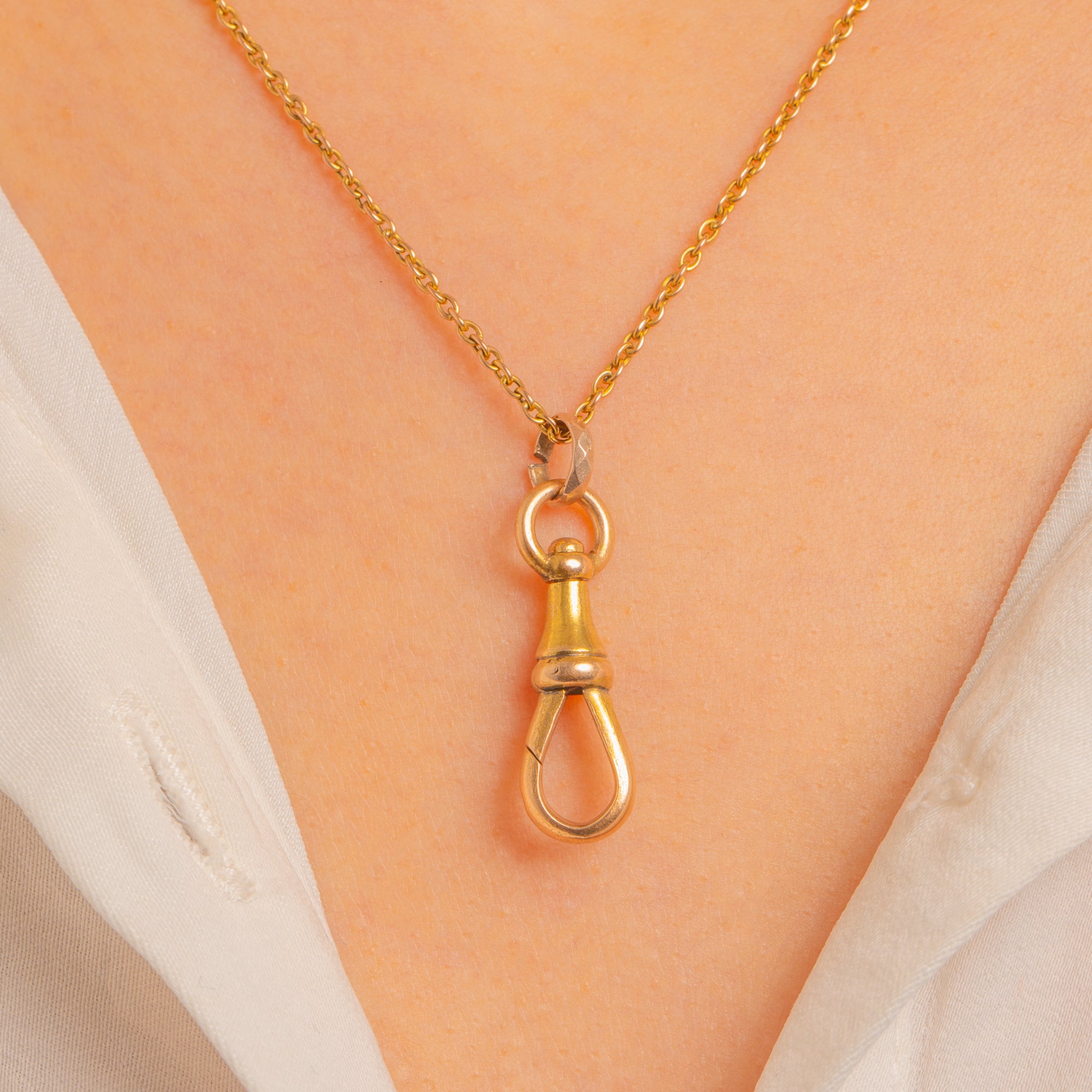 Understated yet undeniably luxurious, this Victorian 15ct Gold dog-clip is a timeless staple for any antique jewellery lover. Crafted in rich, buttery 15ct Gold with a beautifully mellow patina, its clean, utilitarian silhouette feels effortlessly chic—perfect for styling with your favourite charms or pendants. The articulated construction and classic turned profile speak to late 19th-century watch chain fittings, offering both beauty and function in equal measure.