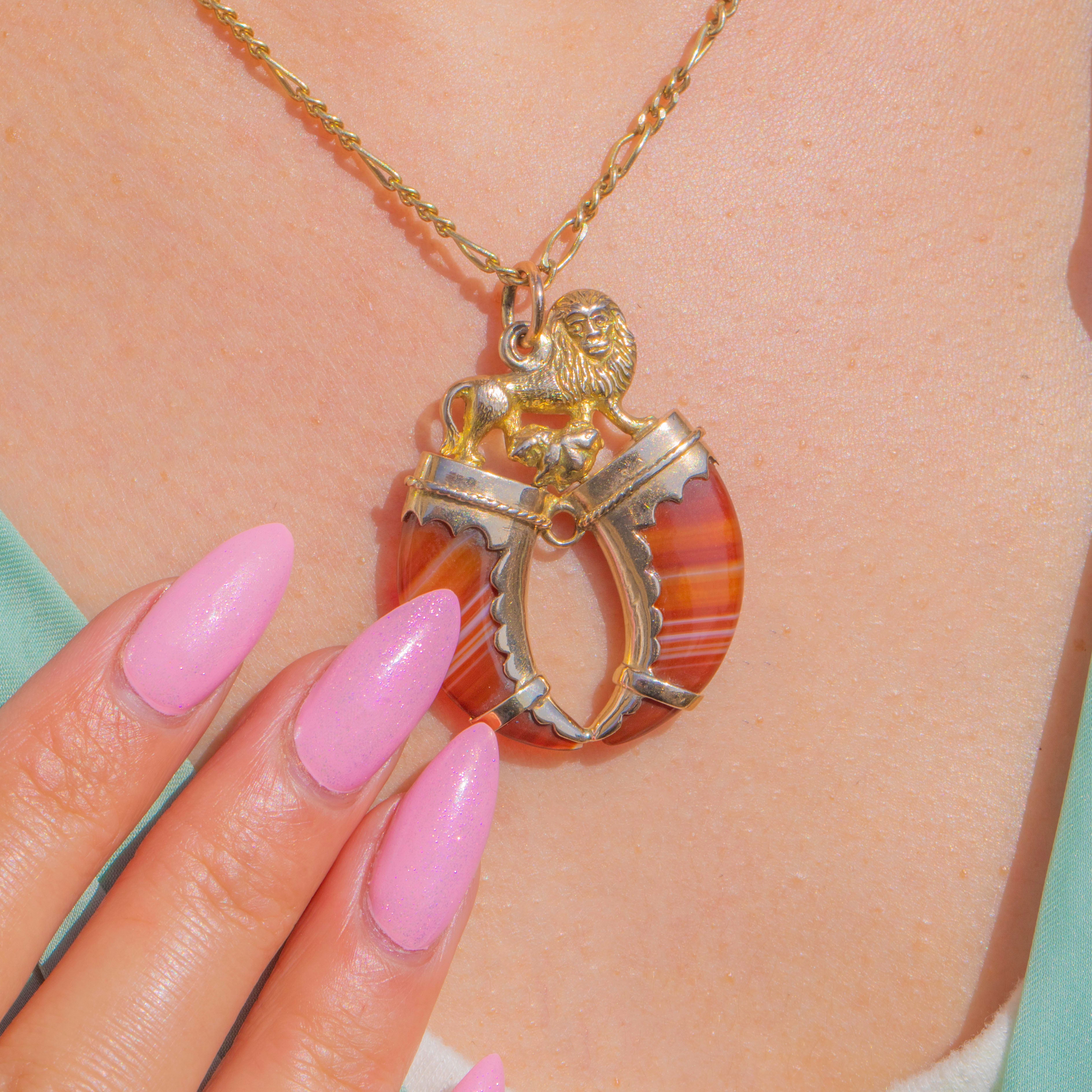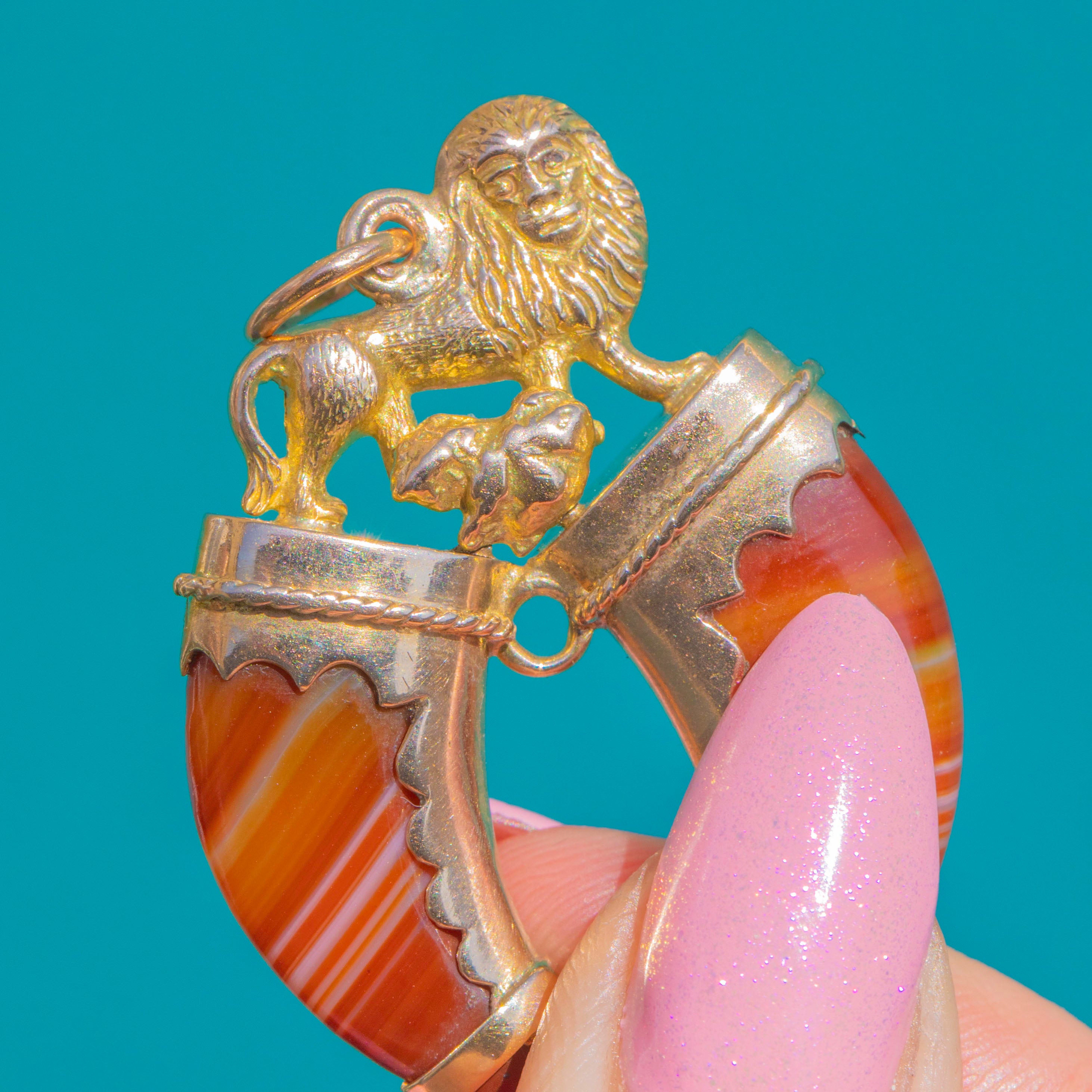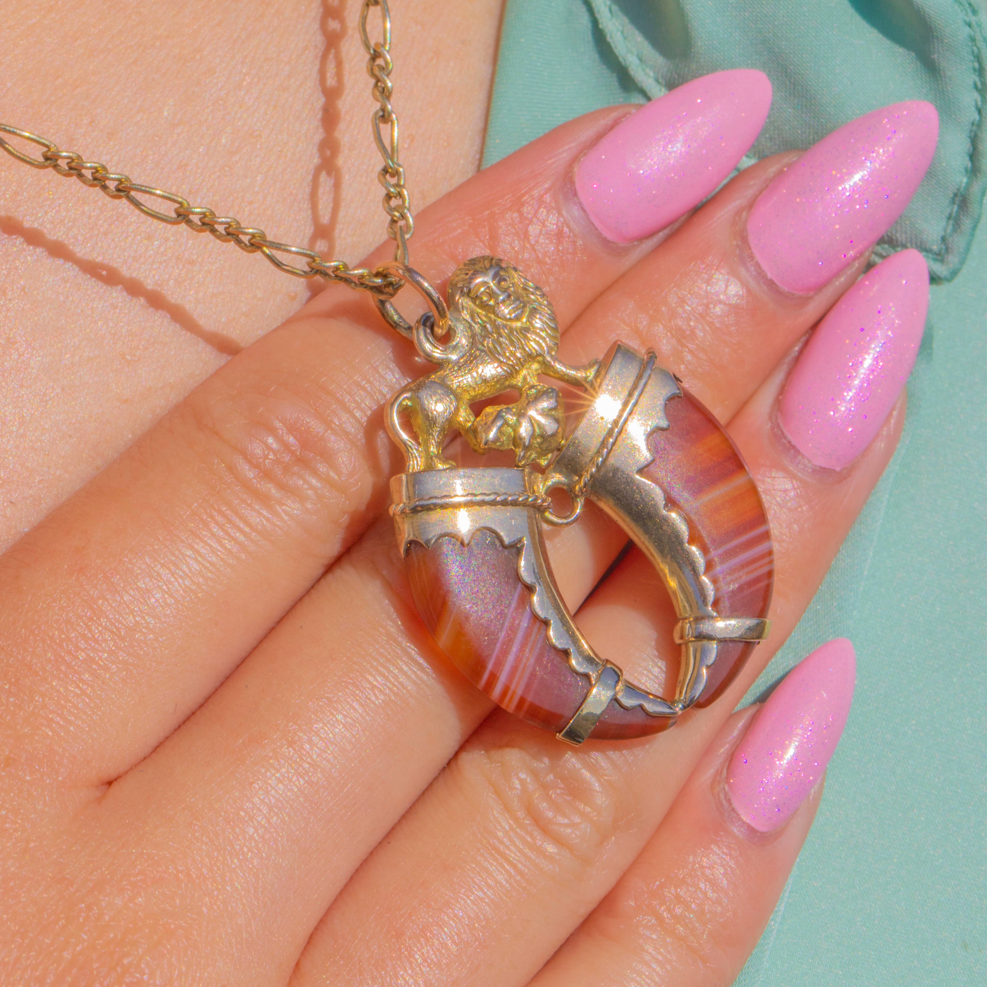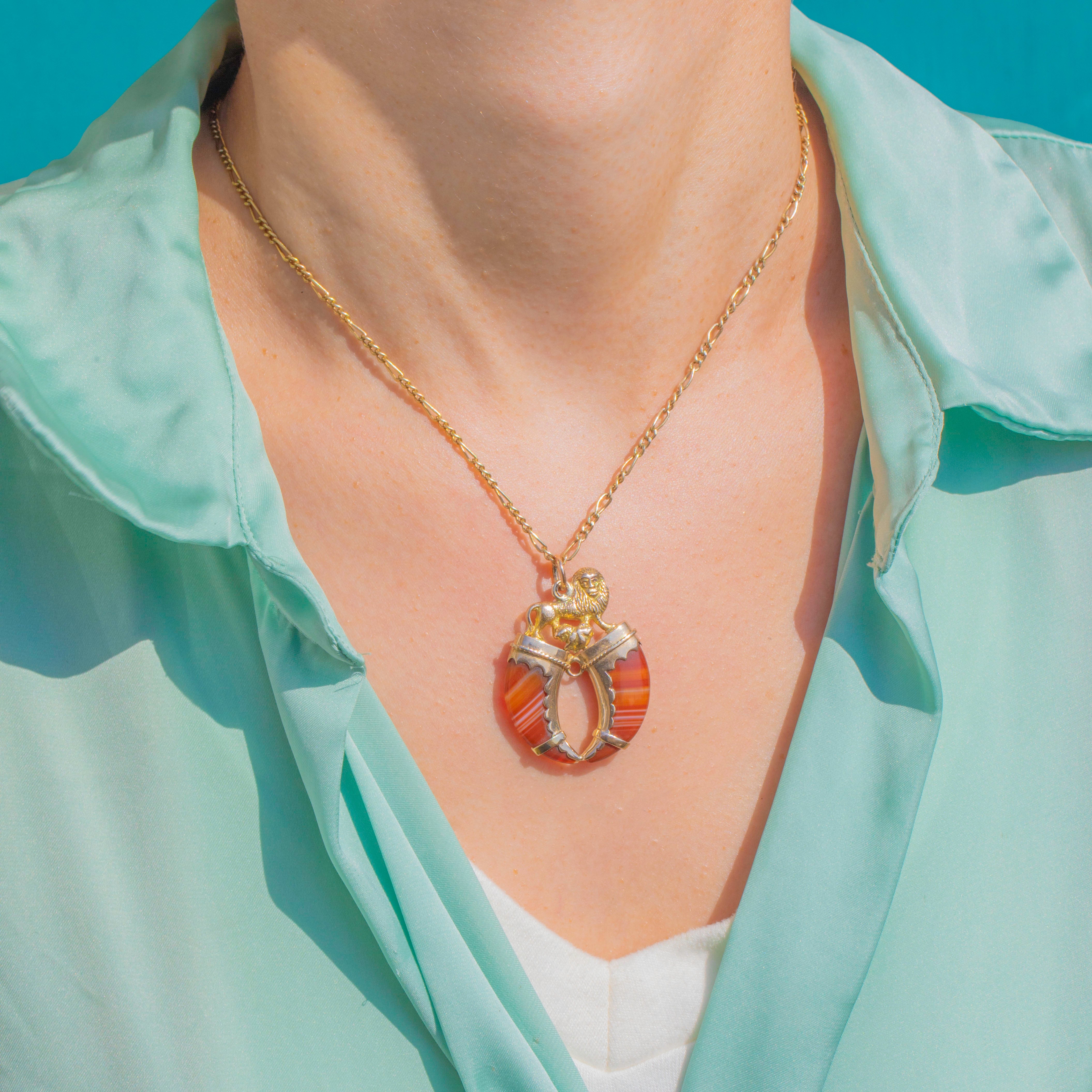 Above, a finely cast heraldic lion with a foliate flourish completes the tableau, creating a bold, romantic emblem with historic charm. Slight articulation between the components brings gentle sway on the neckline, while the jump-ring bail offers easy wear. Ornate yet refined, this is a sumptuous statement of Victorian taste for heraldry and ornament.