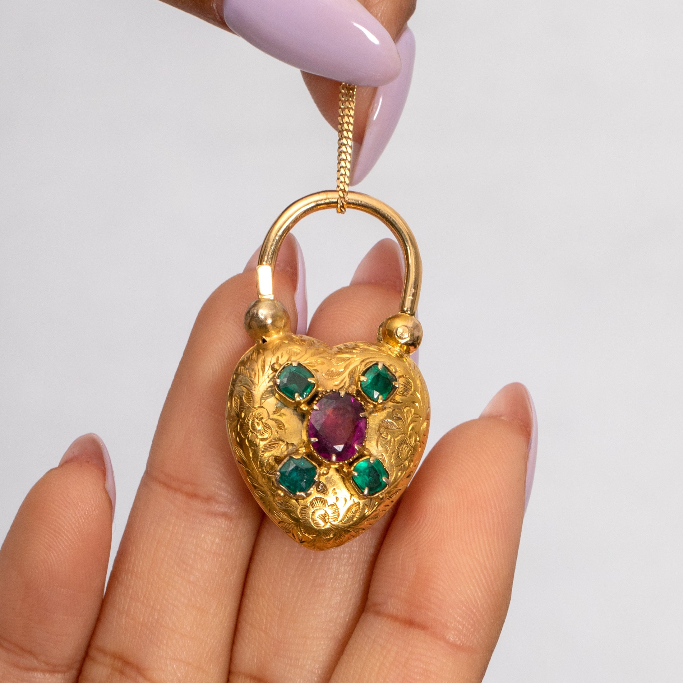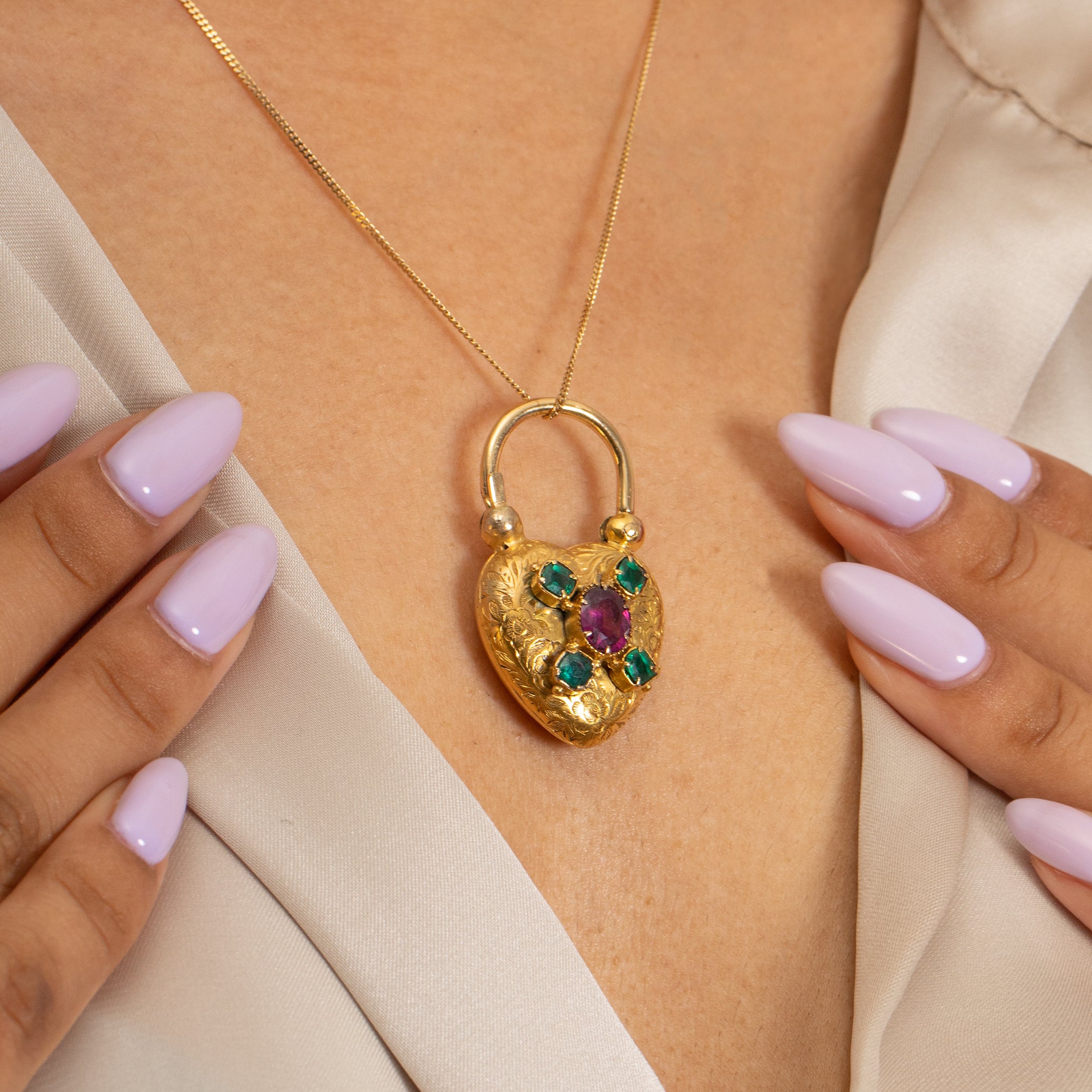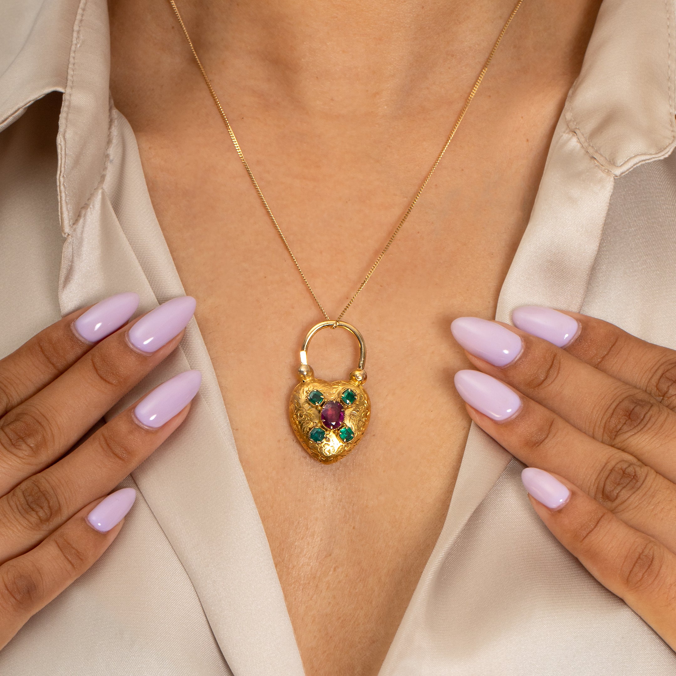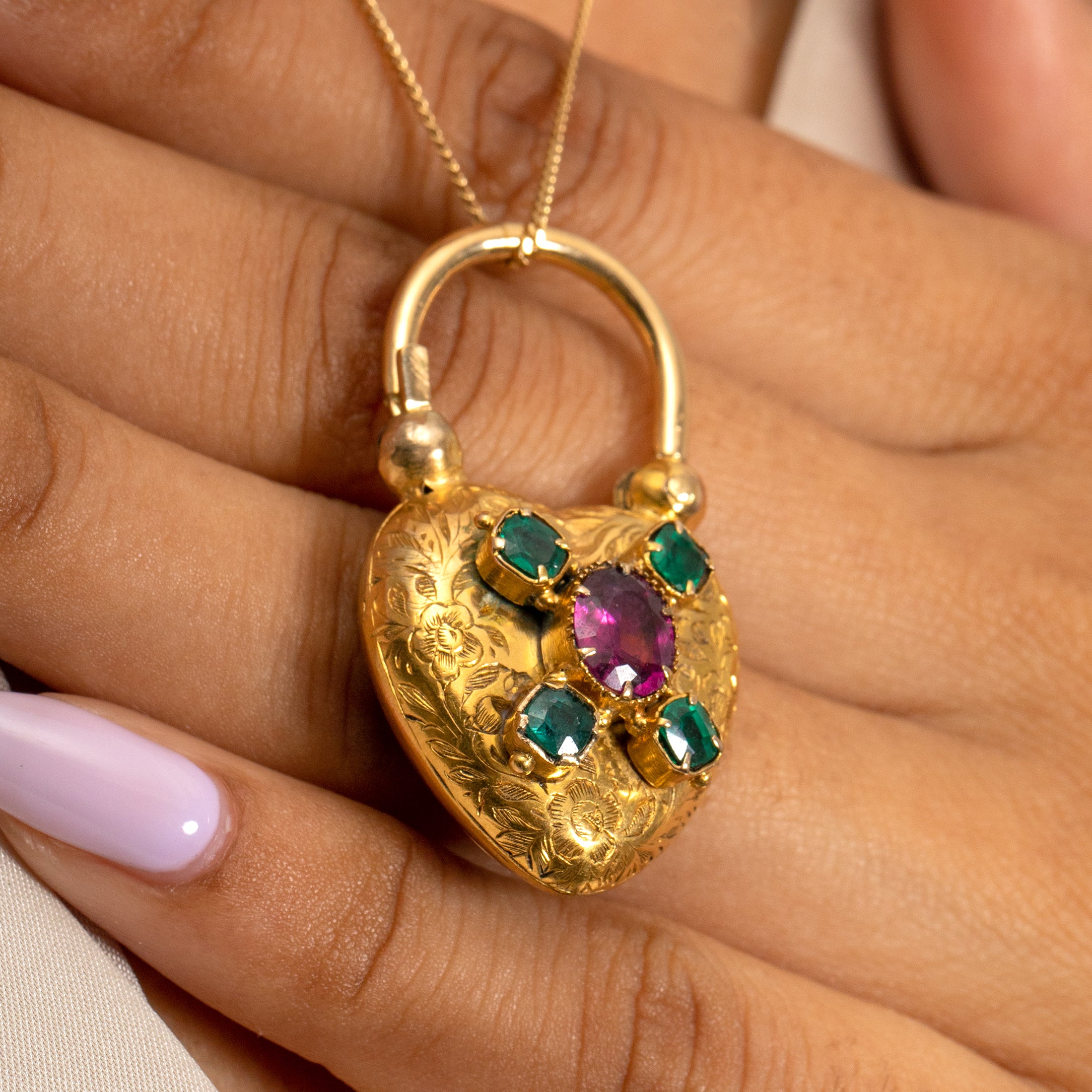 Cadenas en forme de cœur émeraude en or 15 carats antique, pendentif à dos médaillon