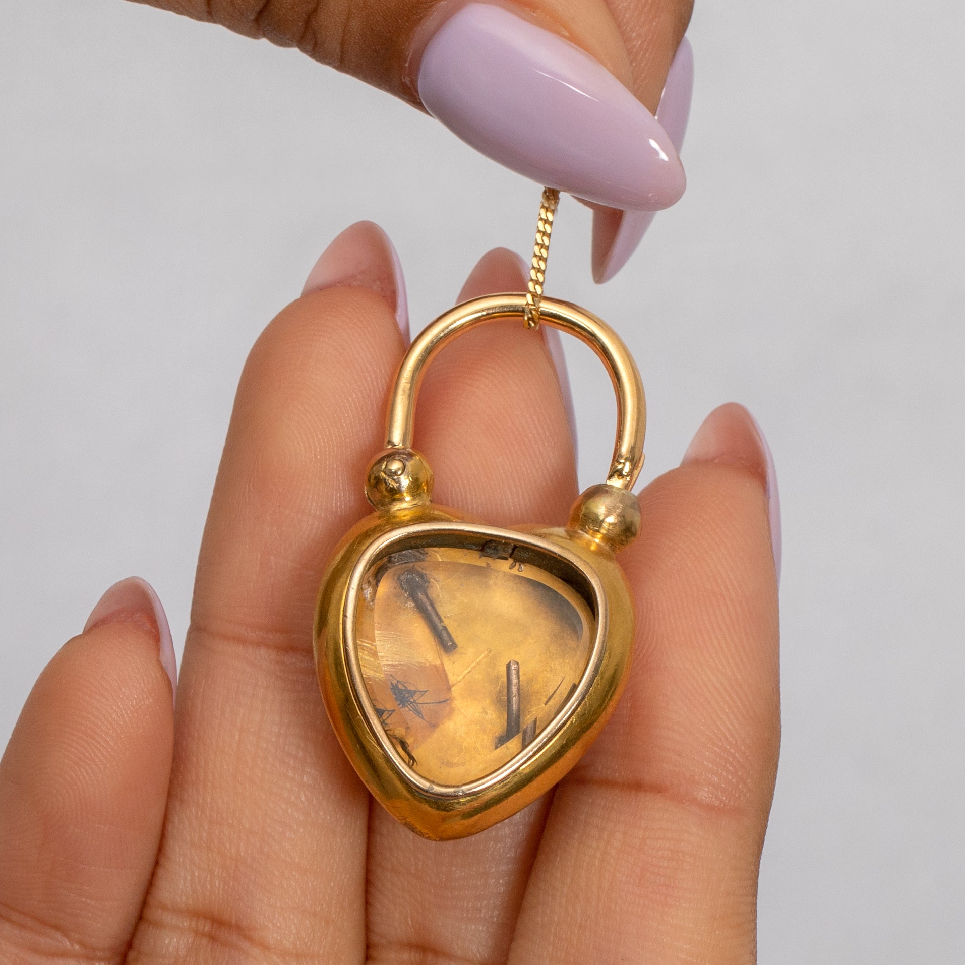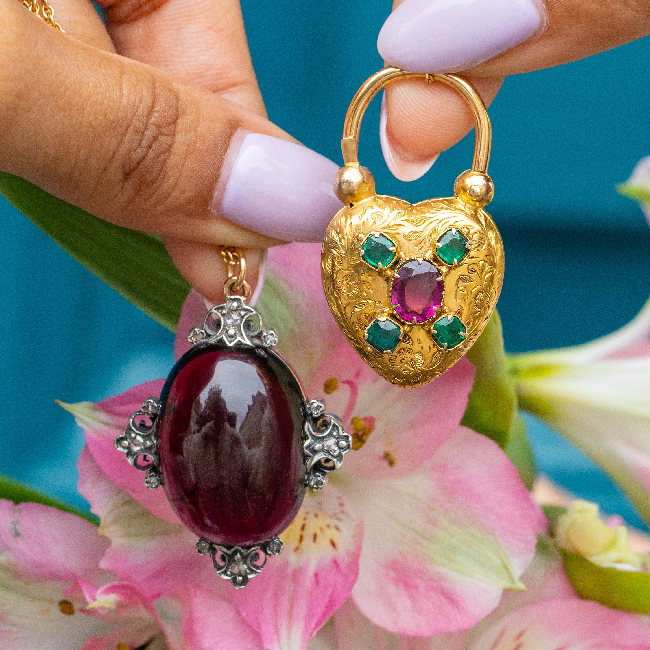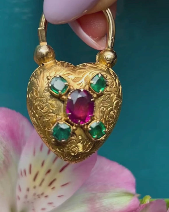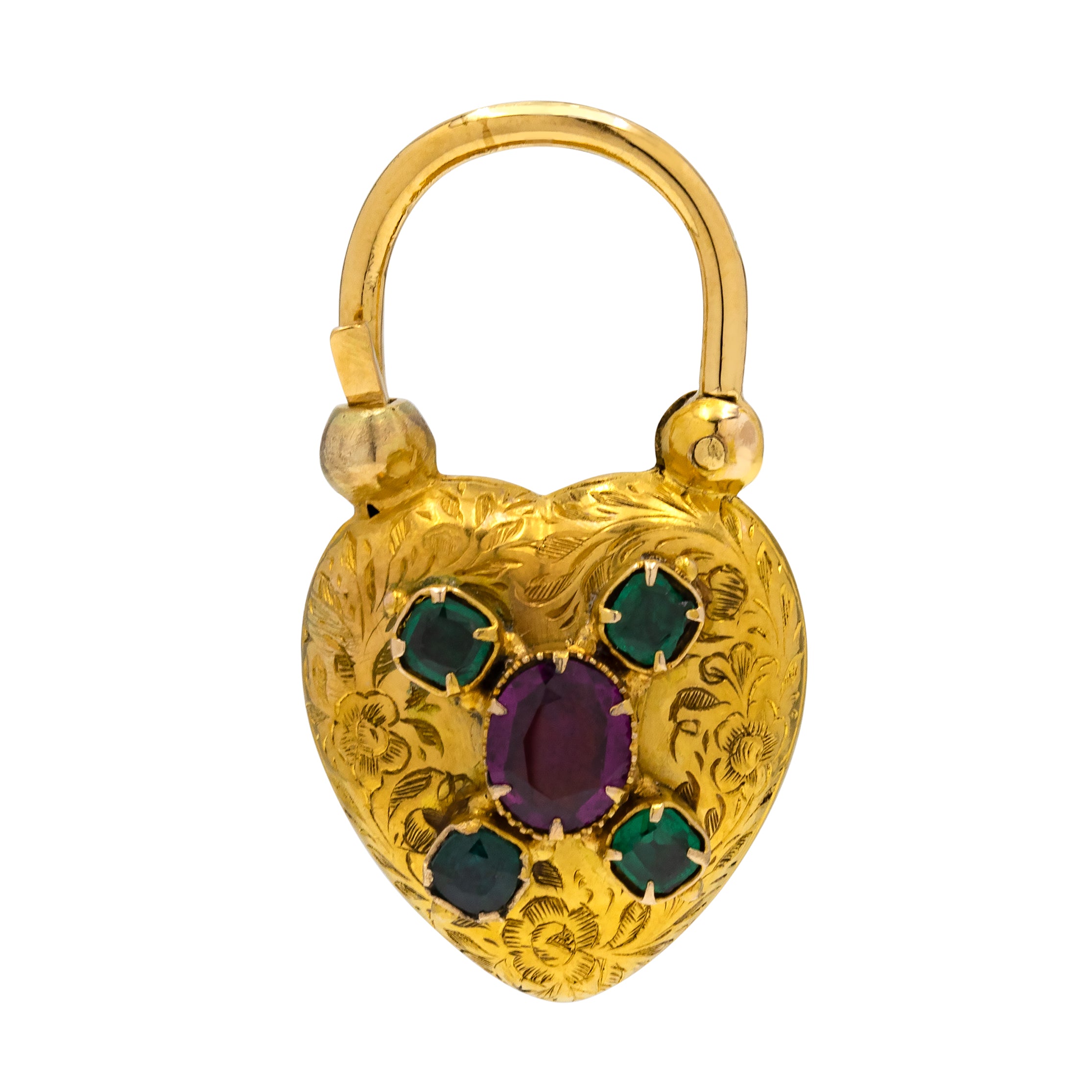 Cadenas en forme de cœur émeraude en or 15 carats antique, pendentif à dos médaillon