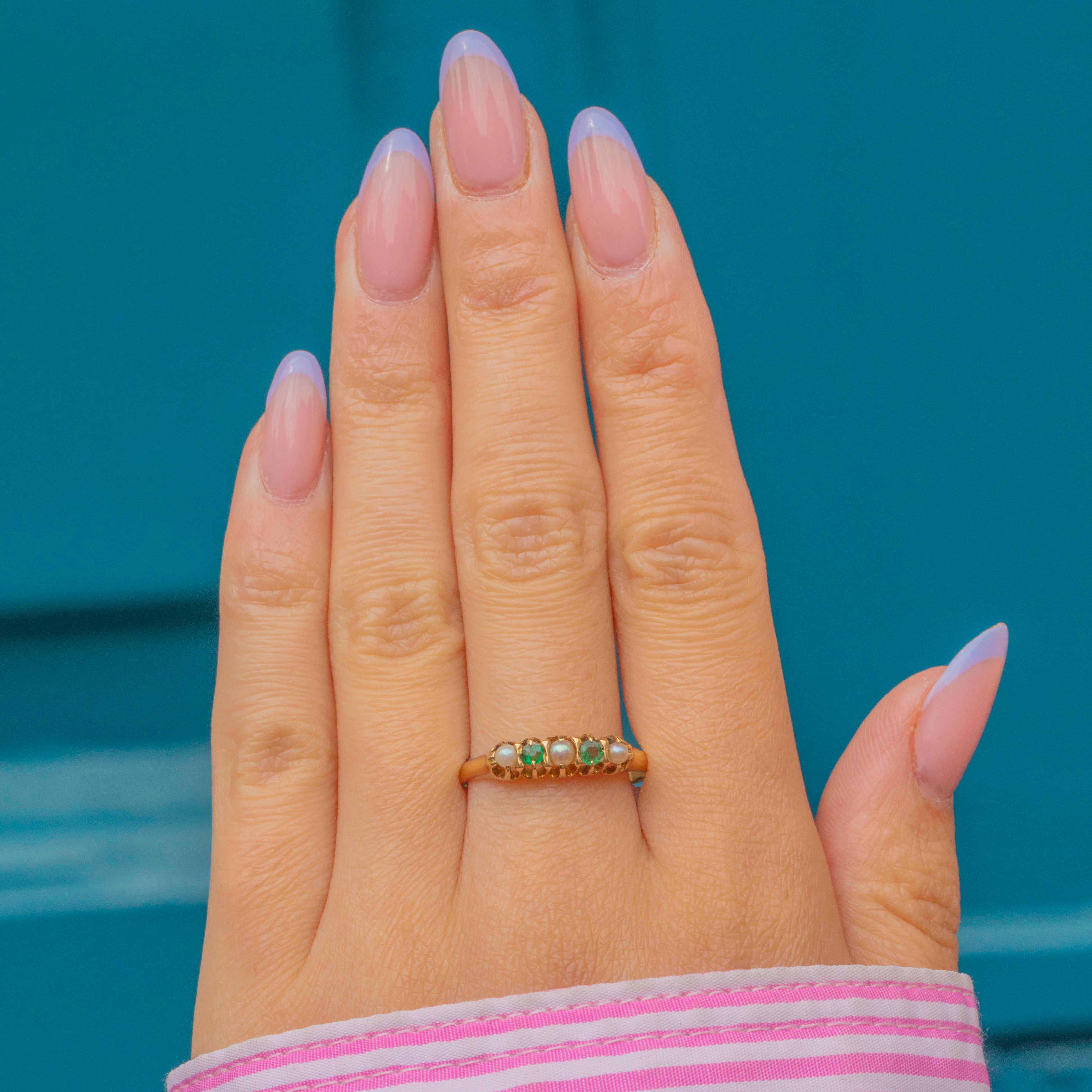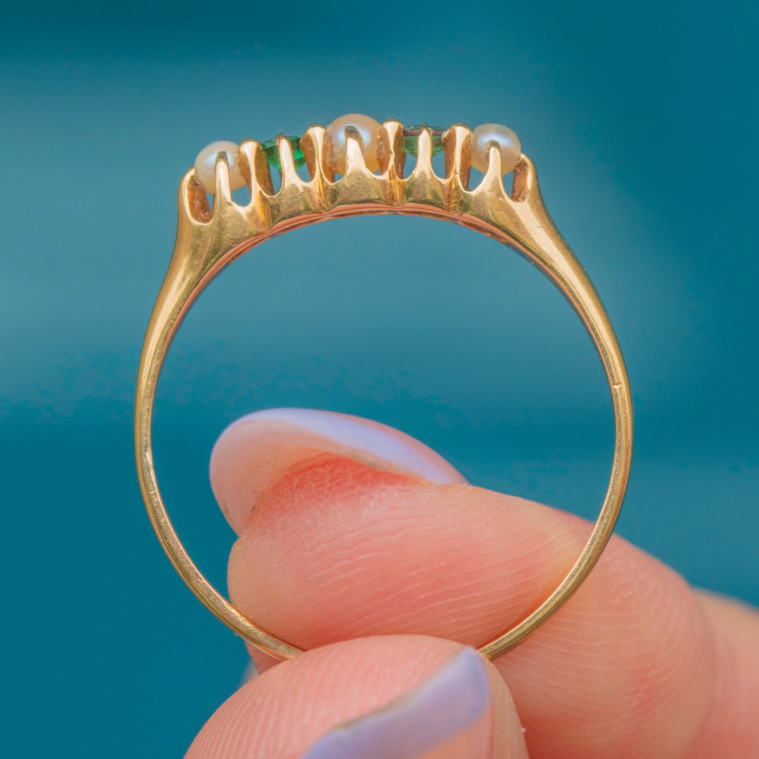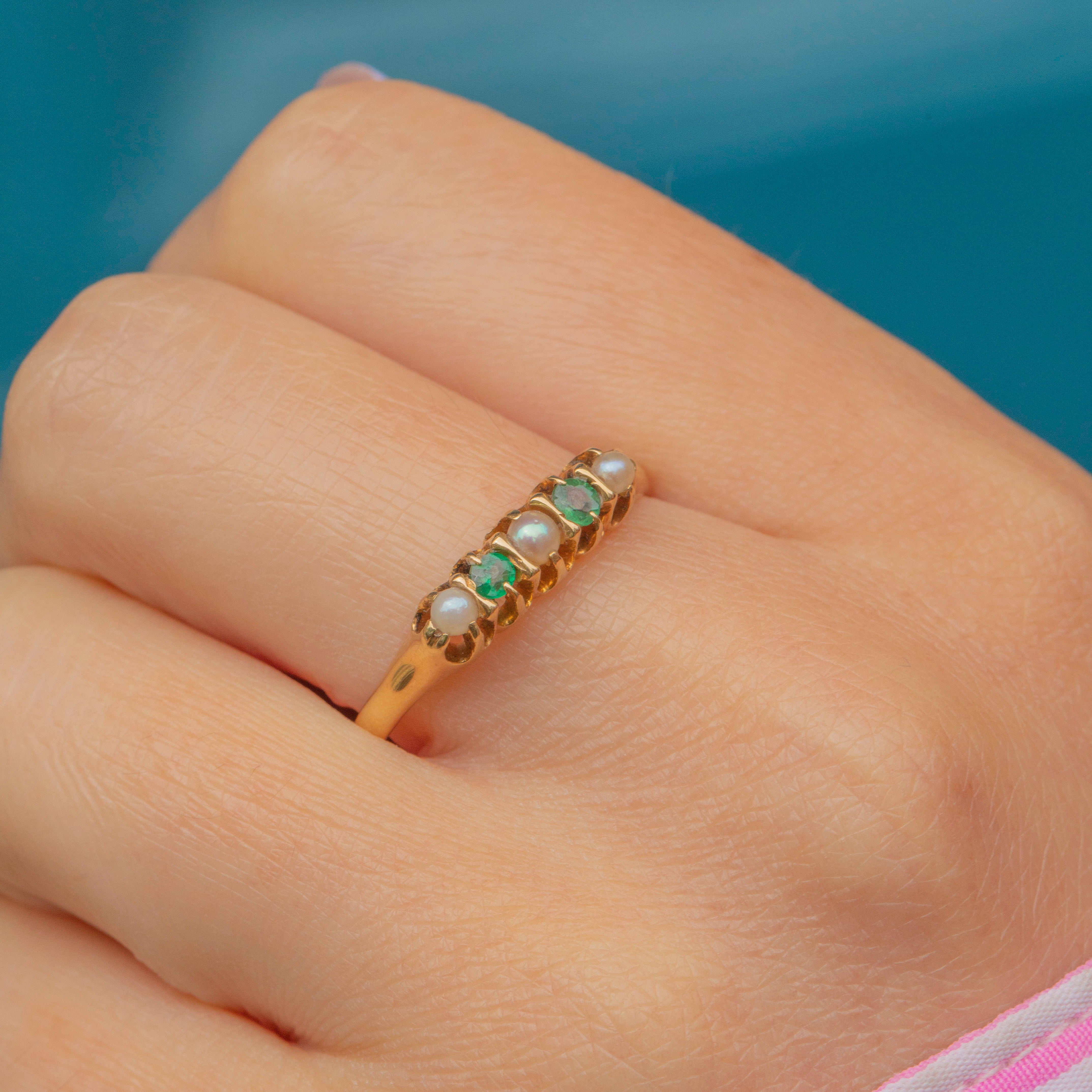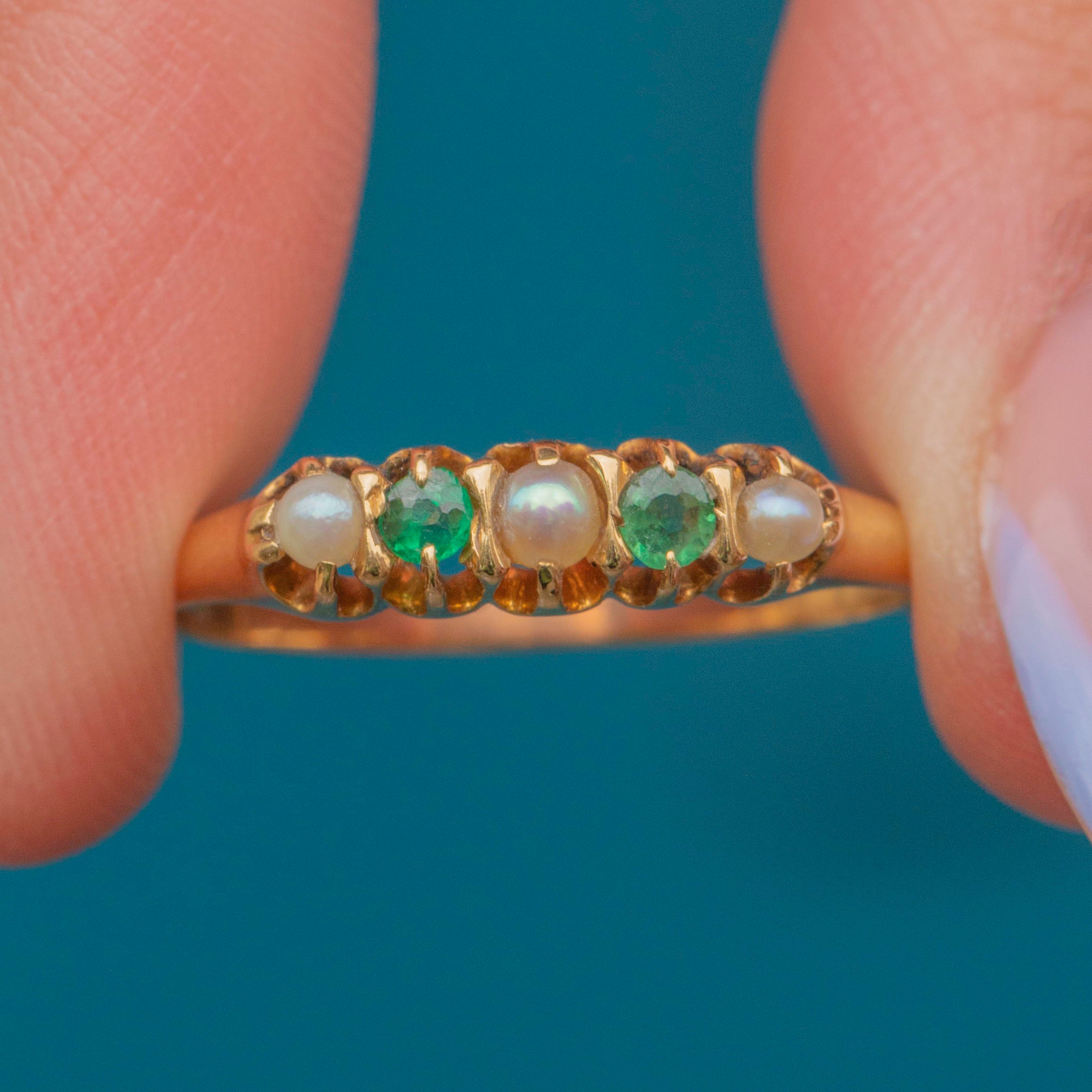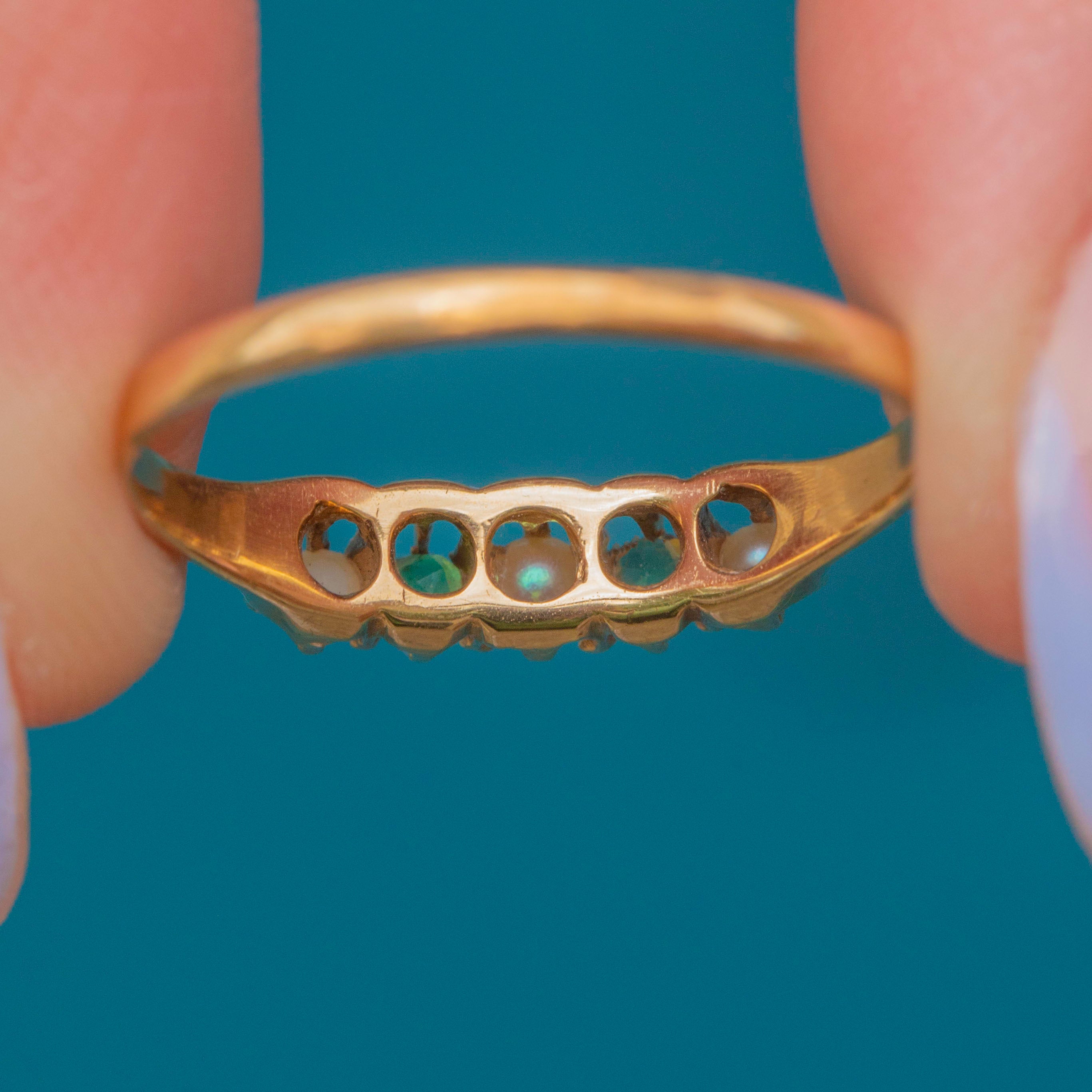 This antique 15ct Gold Emerald Pearl five stone ring is an excellent example of the superb craftsmanship of the era; a true testament to the skilled jeweller who created this piece almost two centuries ago!