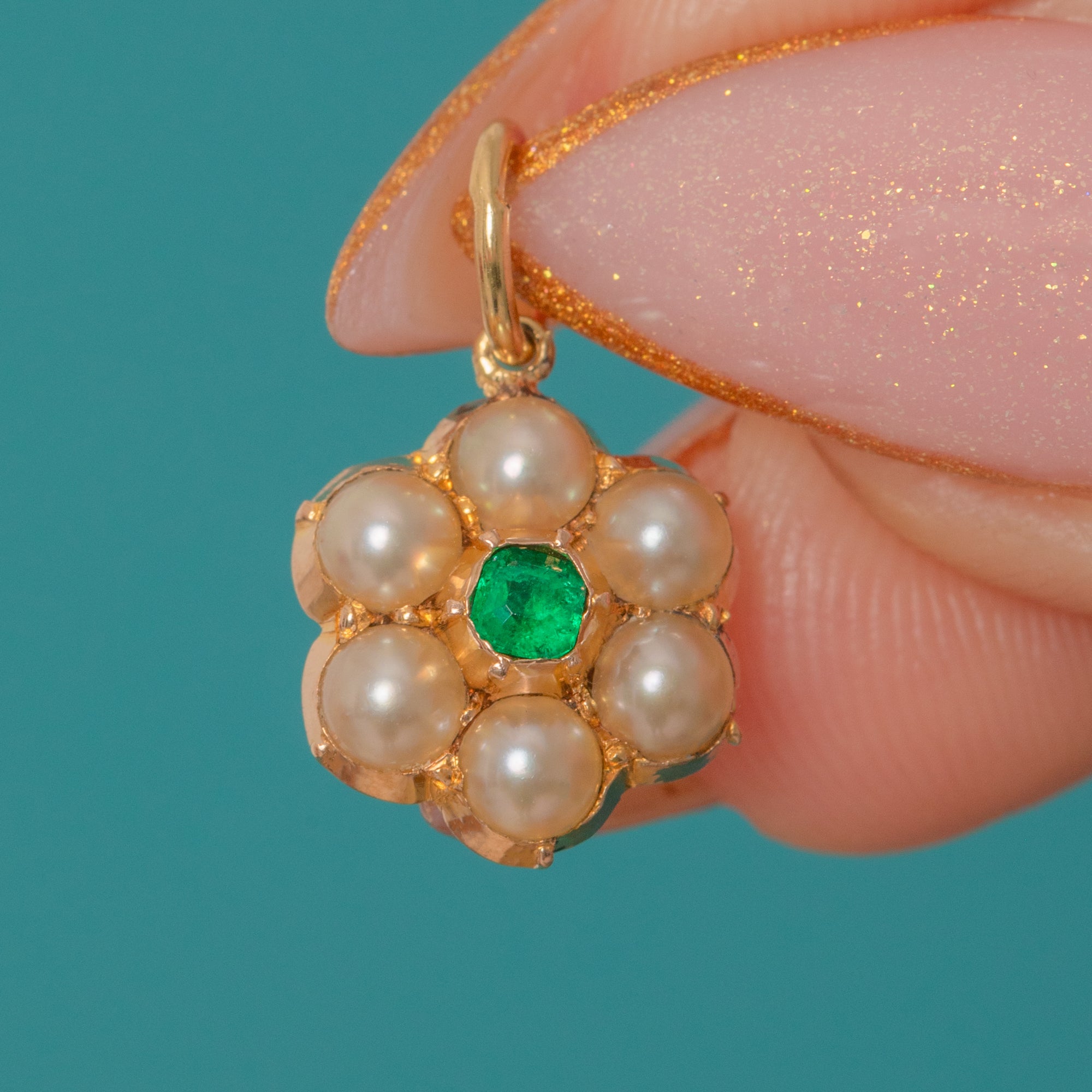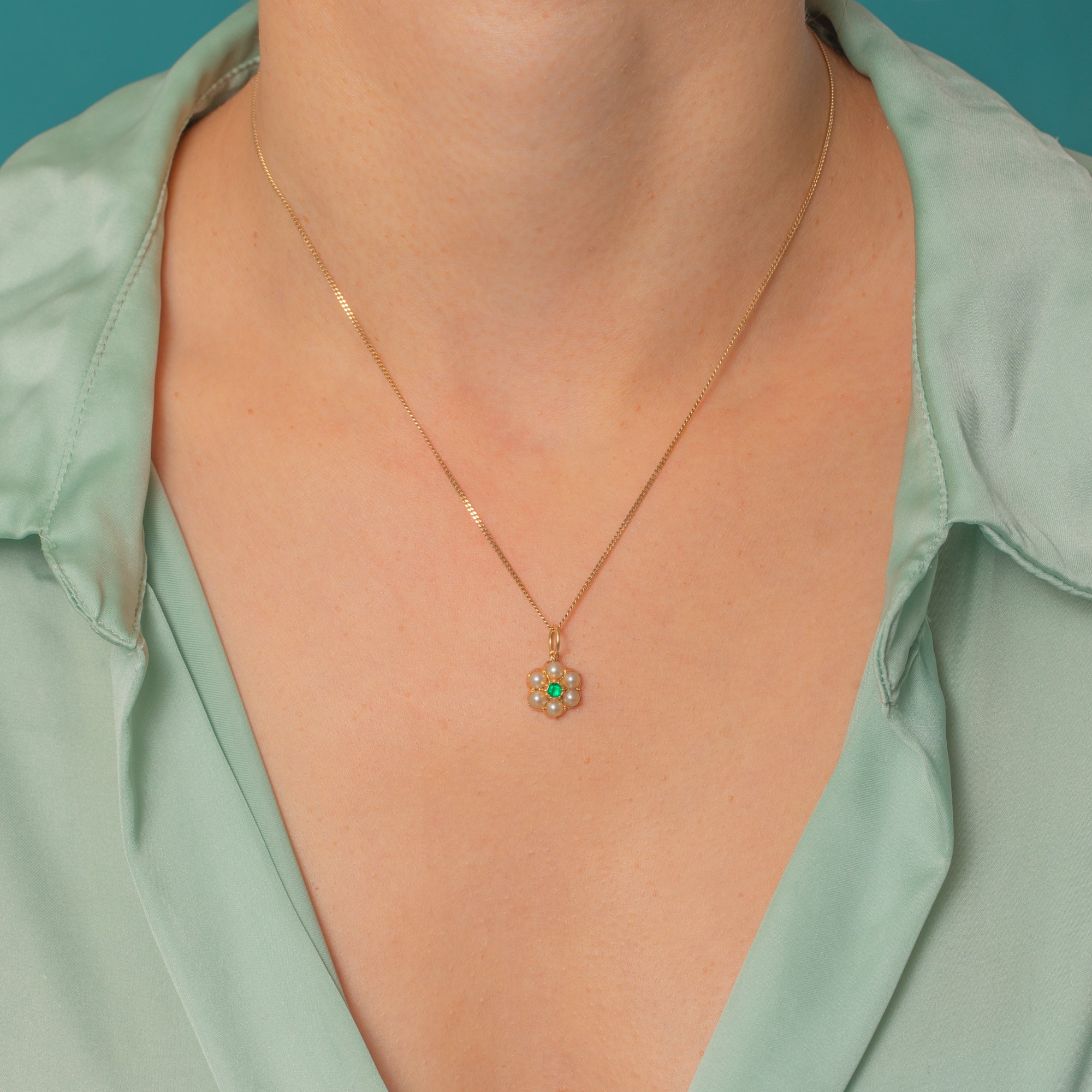 This charming Victorian flower cluster pendant is crafted in warm 15ct Gold and set with a vivid green Emerald surrounded by a halo of lustrous Pearls. The design captures the soft femininity and naturalistic elegance of the era — each gem perfectly balanced within a dainty floral motif.