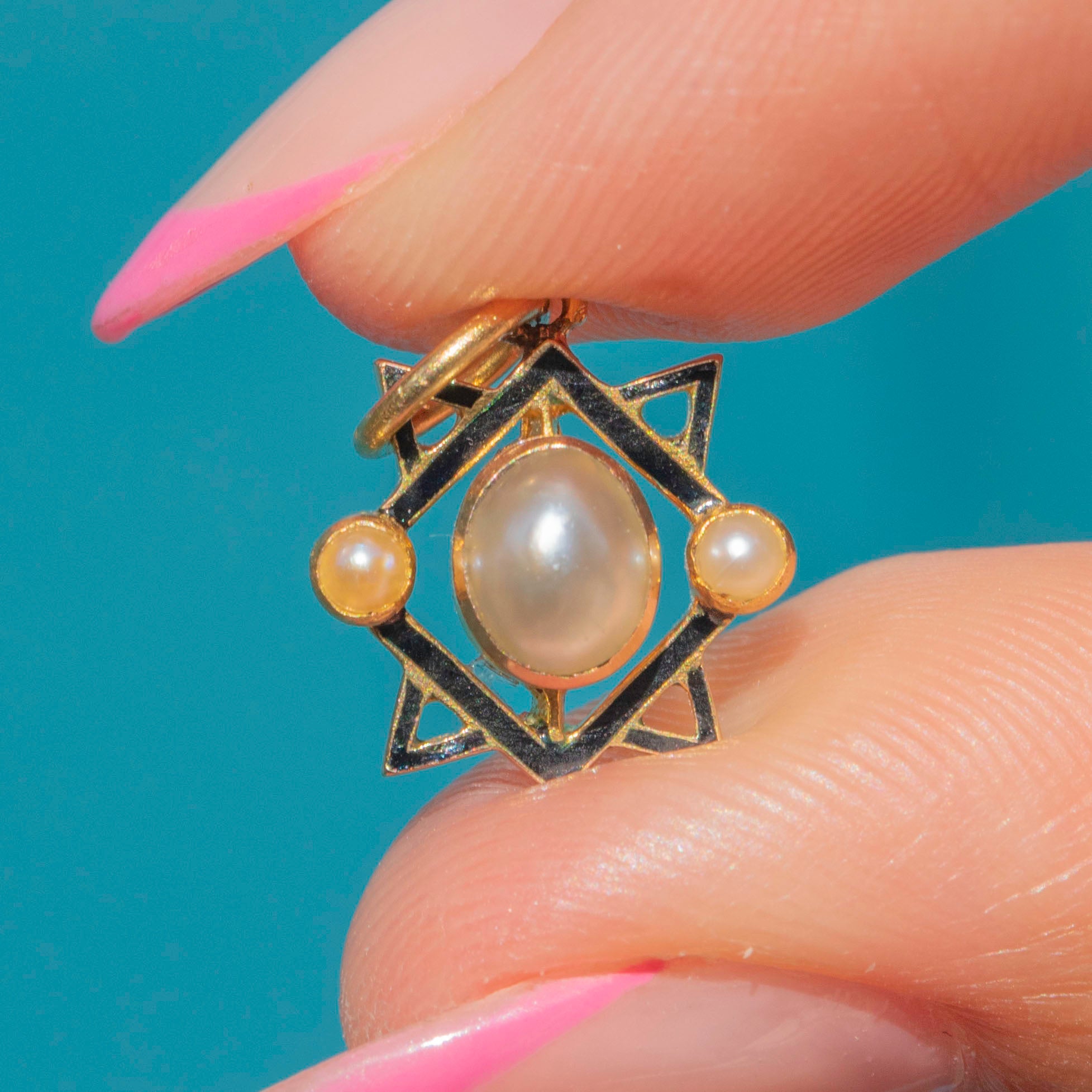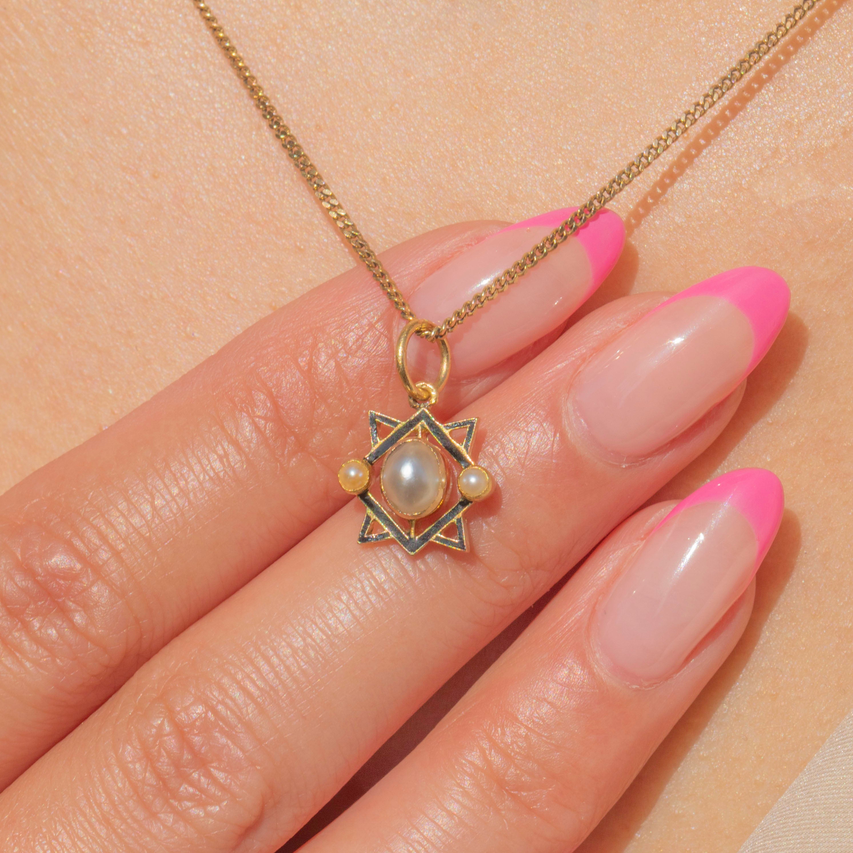 This antique 15ct Gold Enamel Pearl star charm will make a unique addition to your collection! Crafted from rare and saturated 15ct Gold, this Victorian pendant has been formed into a striking star design, its lines highlighted by jet black Enamel, making this pendant pop.