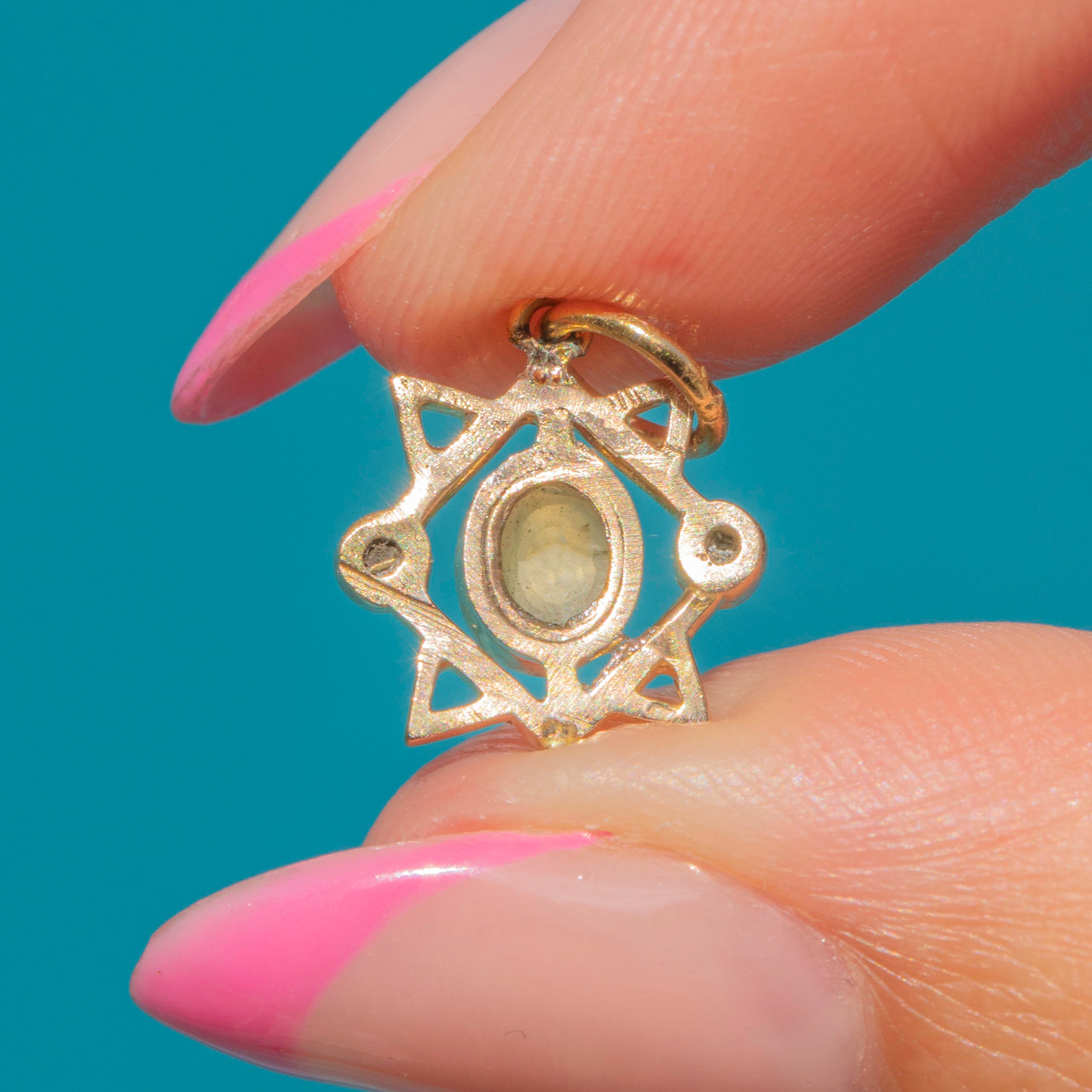 VERY GOOD: This antique 15ct Gold Enamel Pearl star charm is in very good condition. The Pearls are lustrous and securely set, with no visible wear to their nacre. The Enamel has lasted wonderfully, with only mild wear visible under close inspection. The Gold is radiant, and although the back shows wear from a previous conversion, this isn't noticeable from the front. Complete with a large jump ring, you can suspend this Victorian pendant from a chain of your choice with ease!