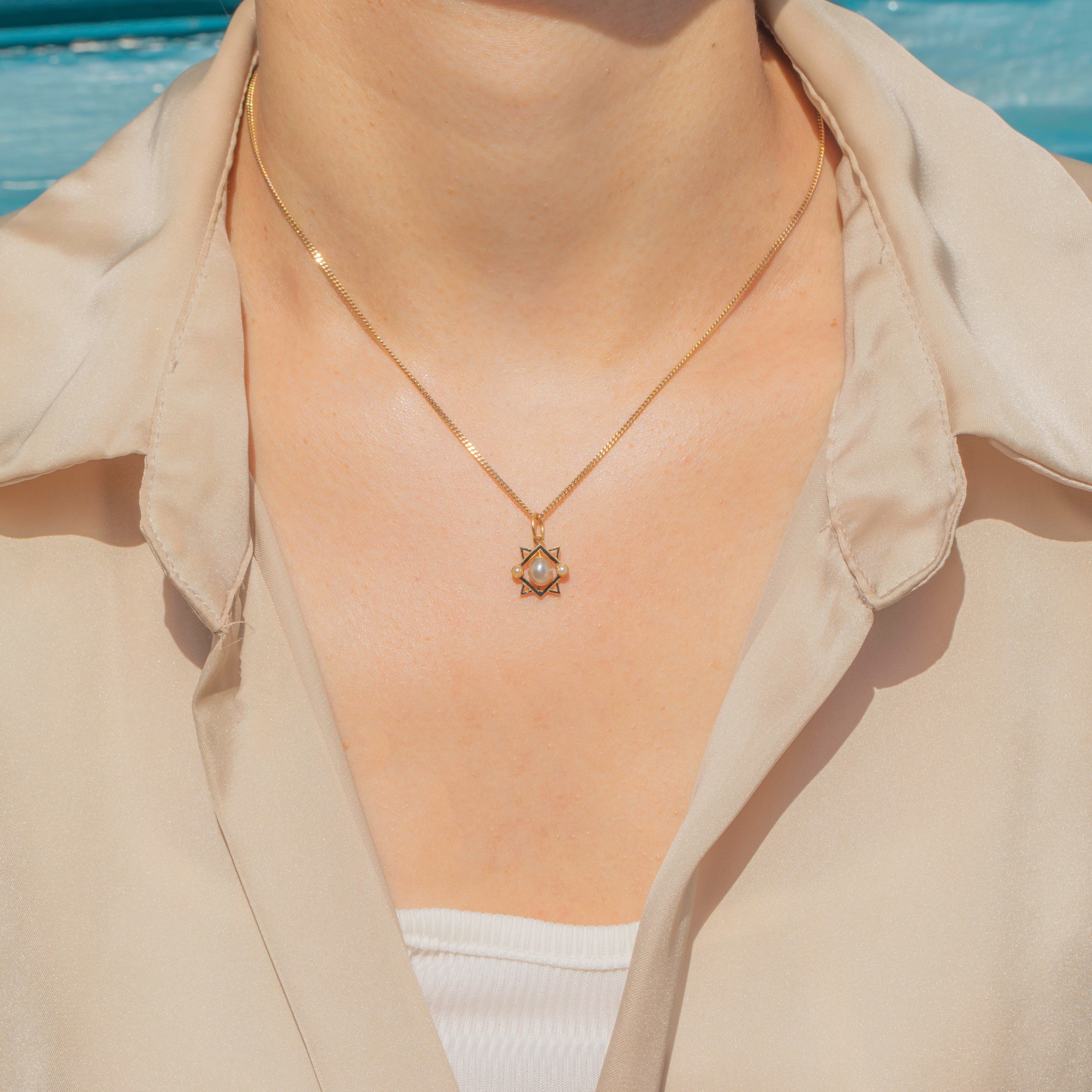 The Pearl trilogy provides the pendant with a glorious shimmering accent, each one displayed within elegant Gold bezels. Whether worn alone or stacked alongside your other favourite charms, this antique Enamel pendant will glide effortlessly into your repertoire!