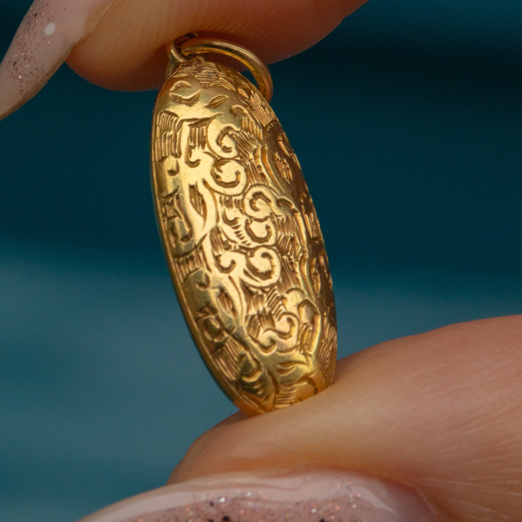 VERY GOOD-EXCELLENT. This antique 15ct Gold engraved lozenge pendant is in wonderful condition. Her engravings are crisp and her lozenge form has stood the test of time. The Gold is saturated and although there is some differentiation of colour on the back and the stamps are slightly obscured, this cannot be seen when worn. With a soldered jump-ring, this antique Gold pendant can be worn with confidence!