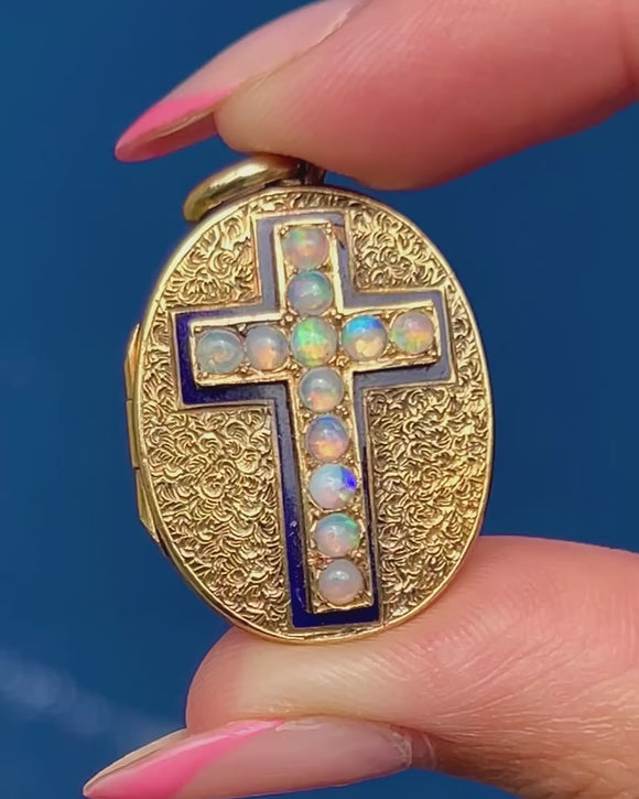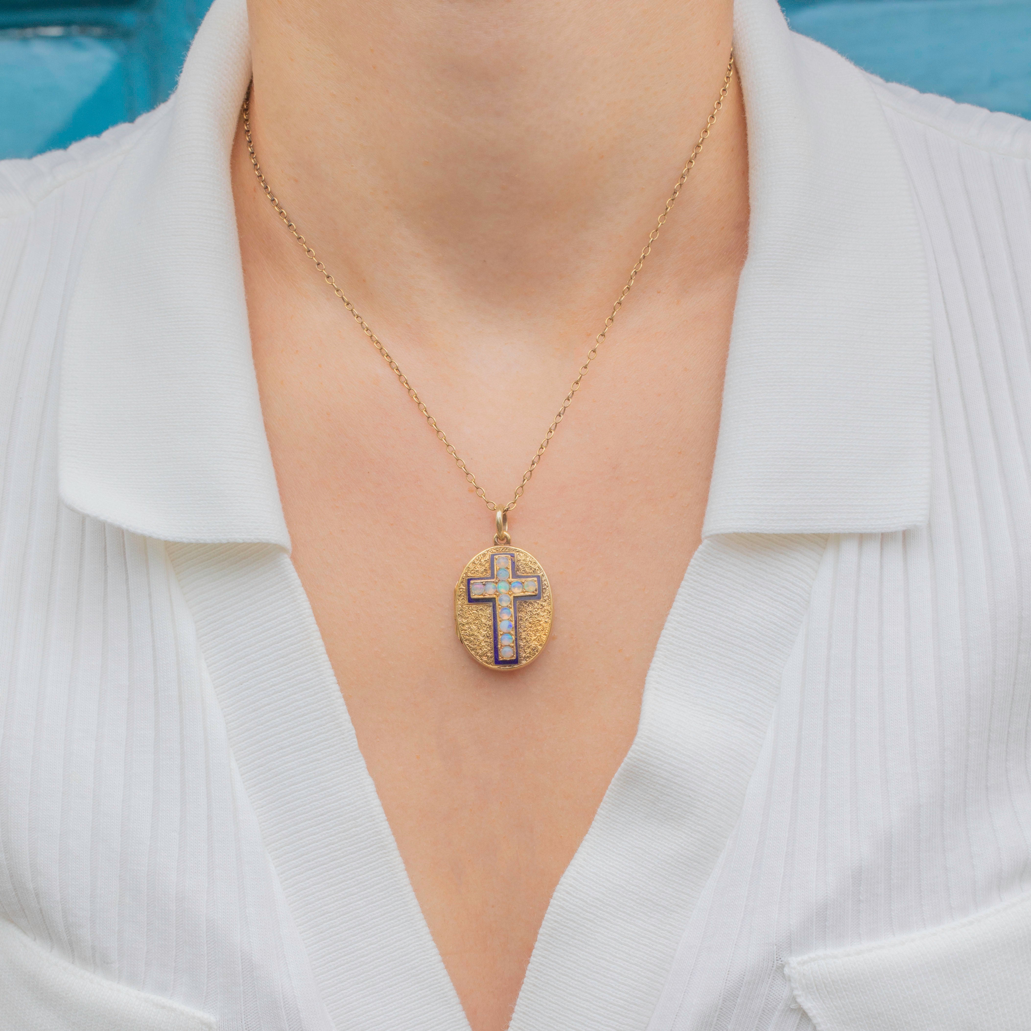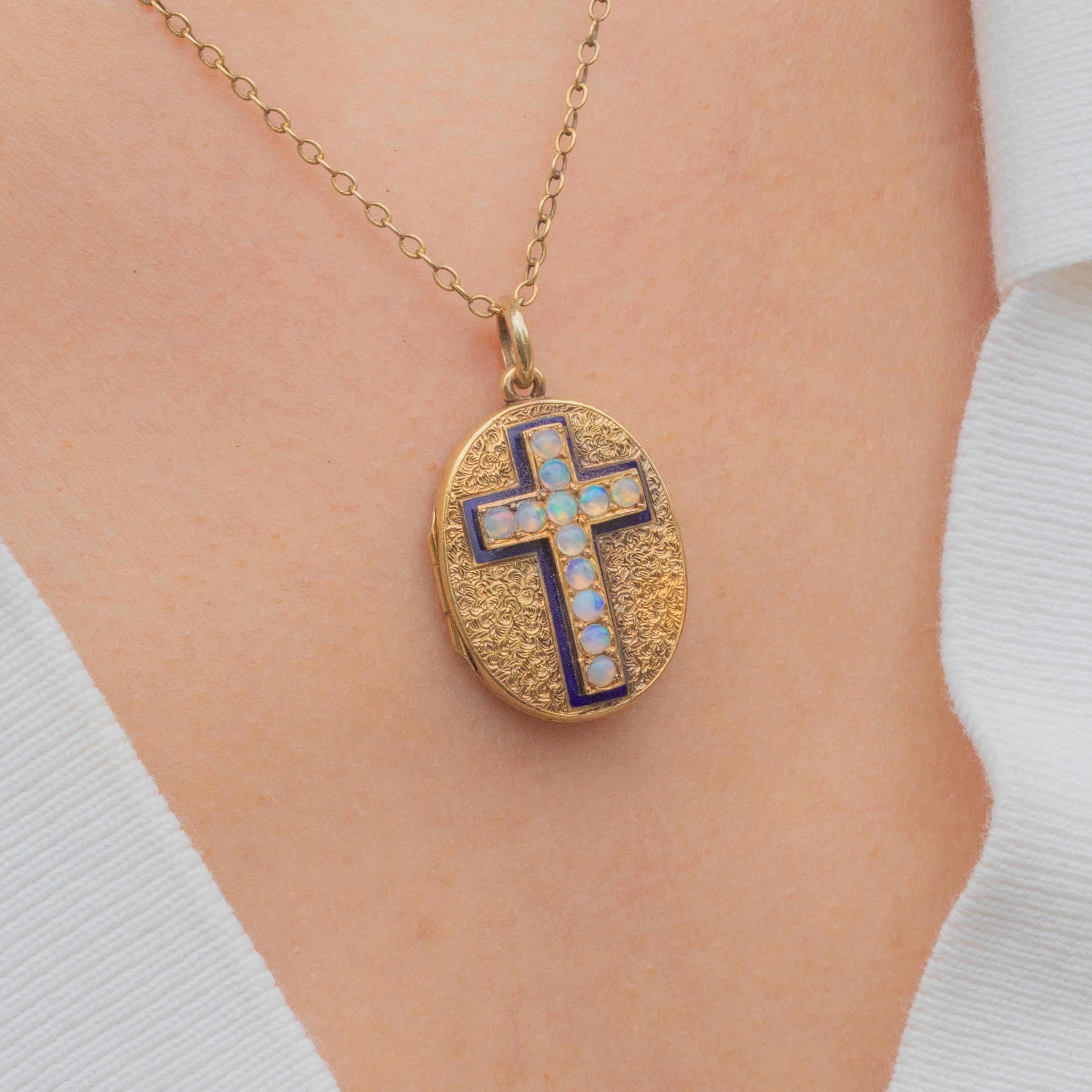 The locket is crafted from solid 15ct Gold and boasts intricately engraved details that span across both sides. The impressive cross, formed of lively Opals, makes a striking focal point for the front of the locket, their ethereal, shimmering hues enhanced by a bold line of royal blue Enamel.