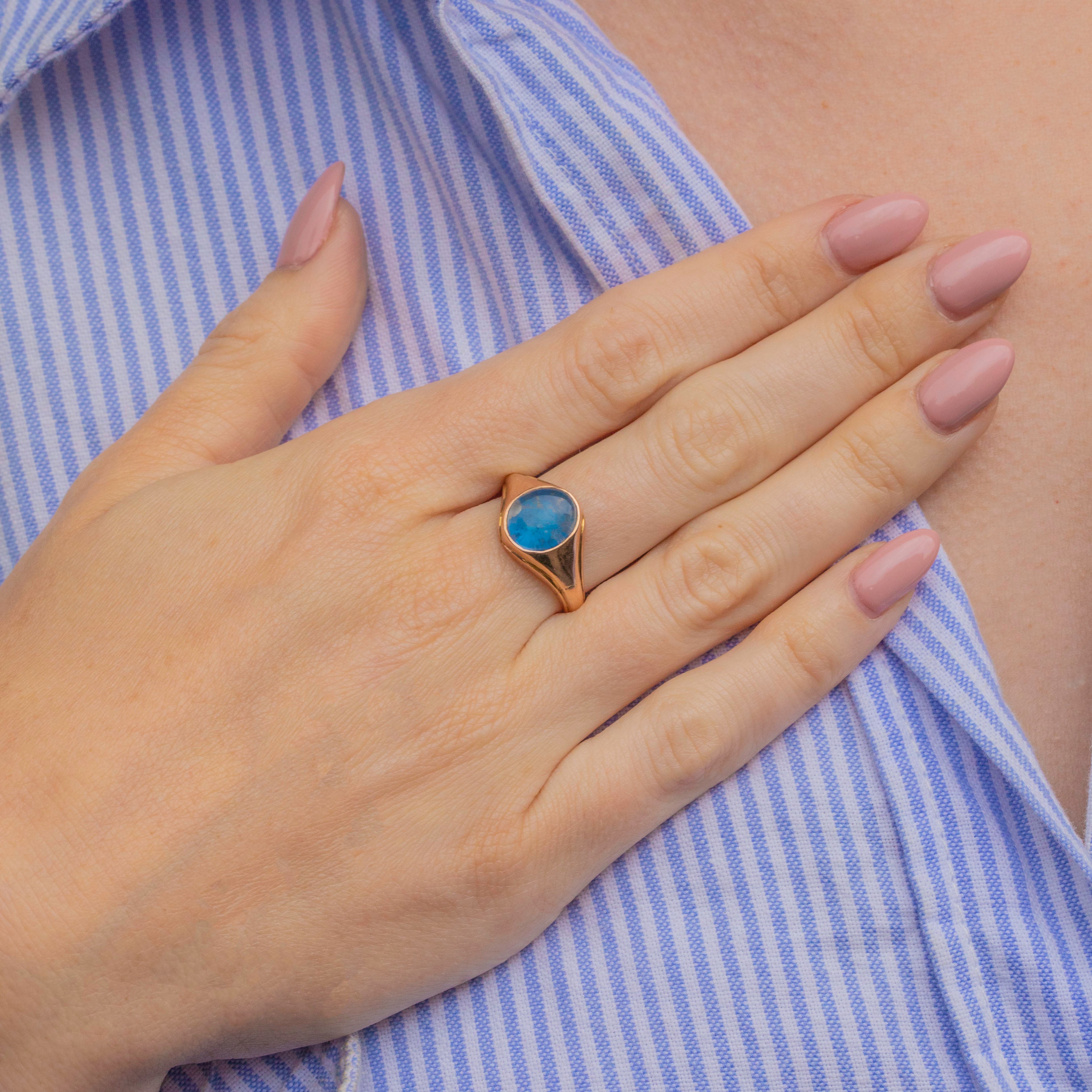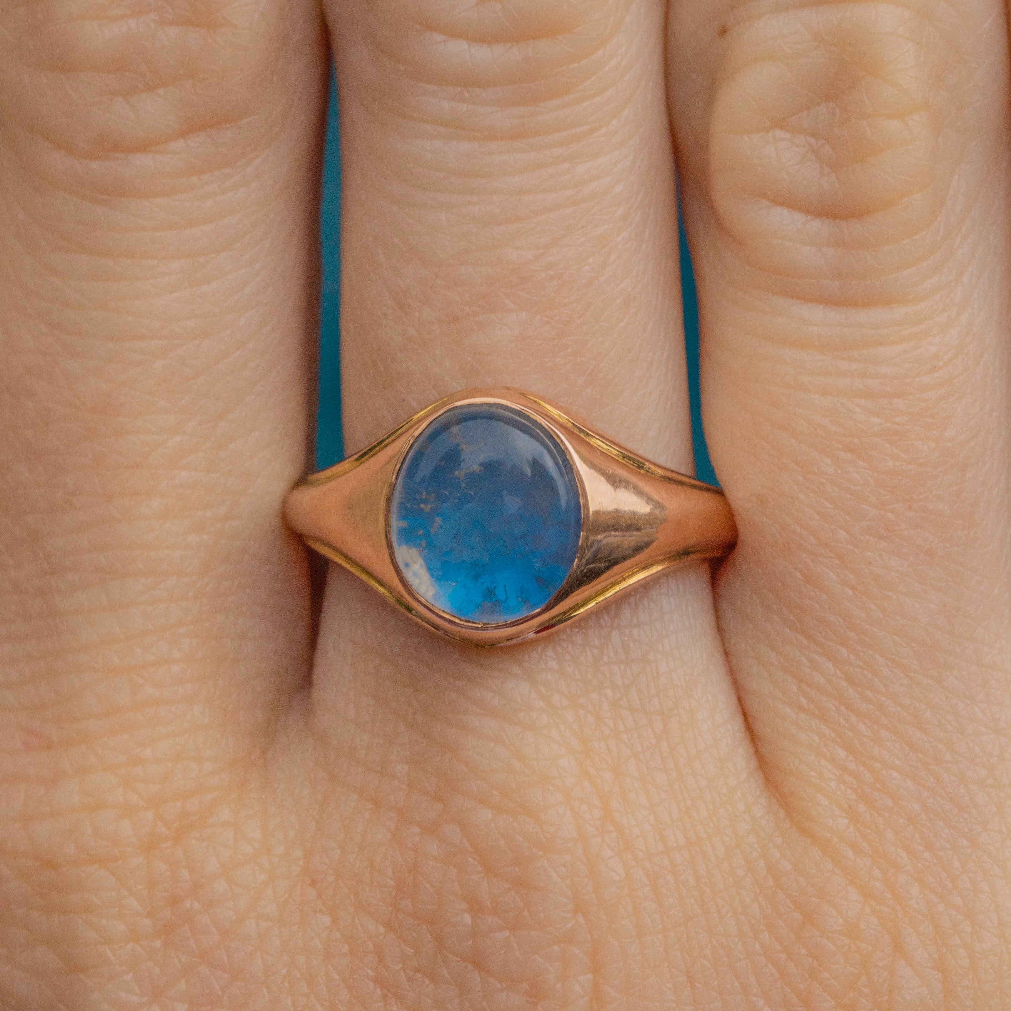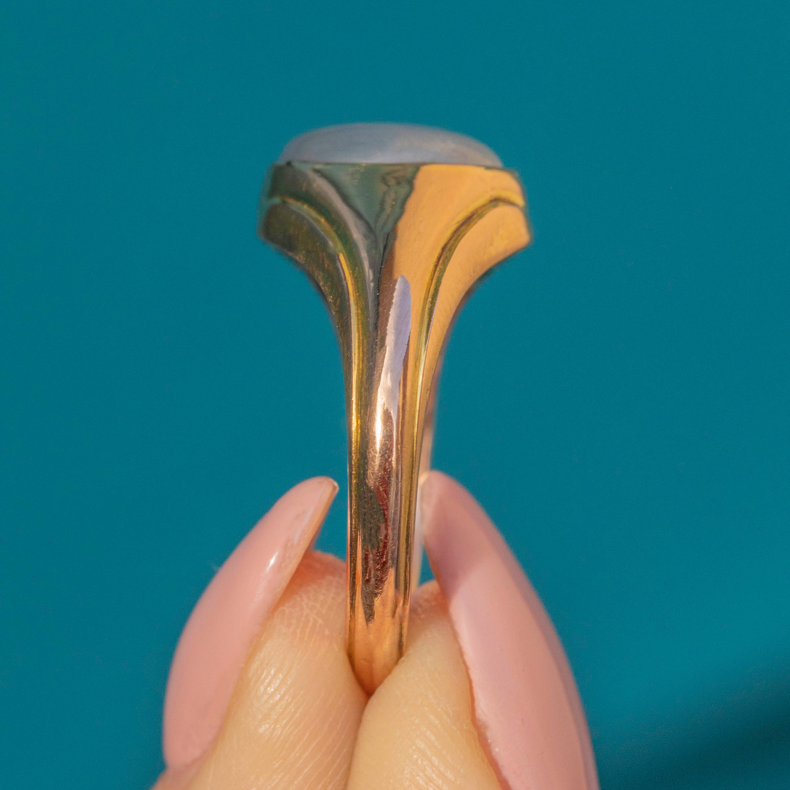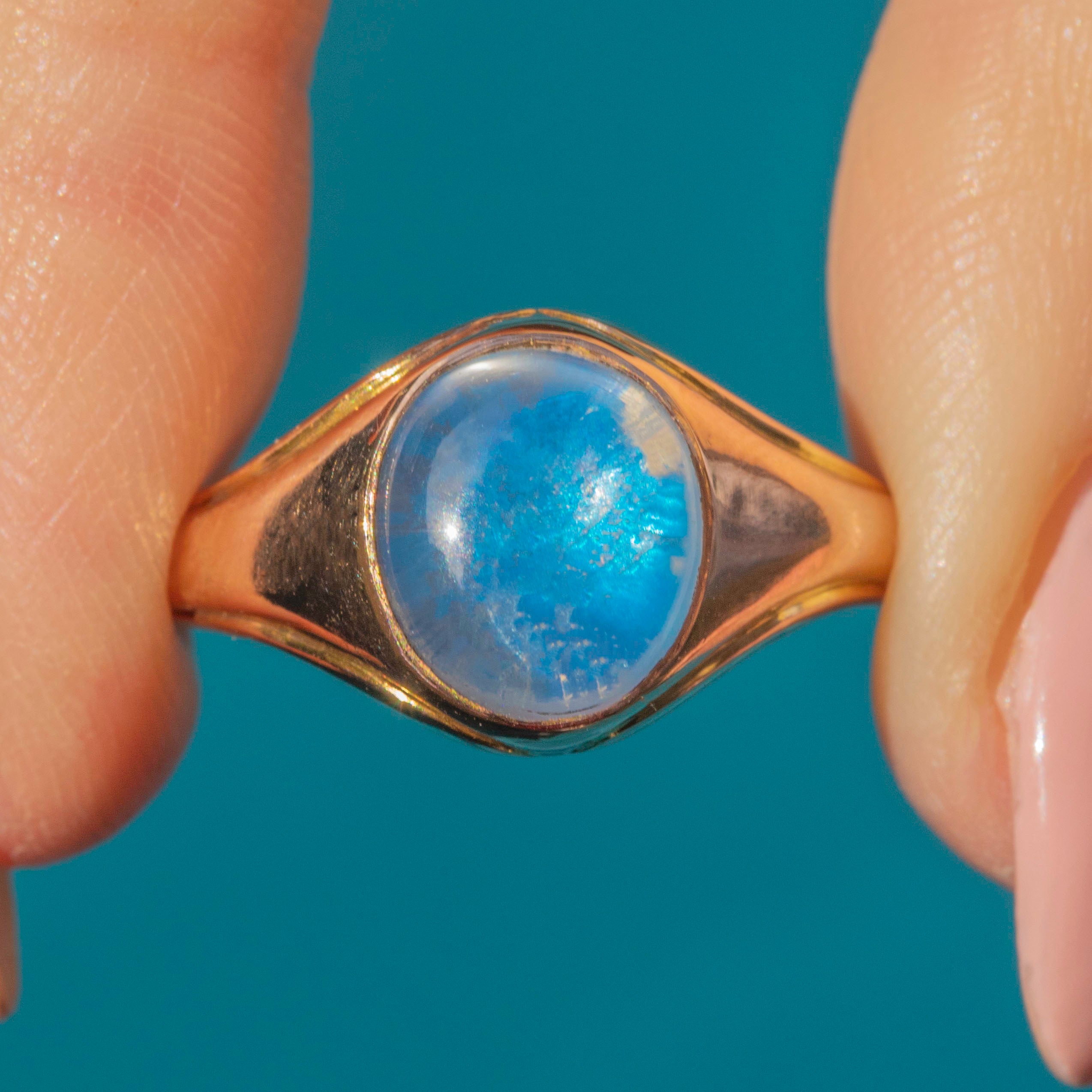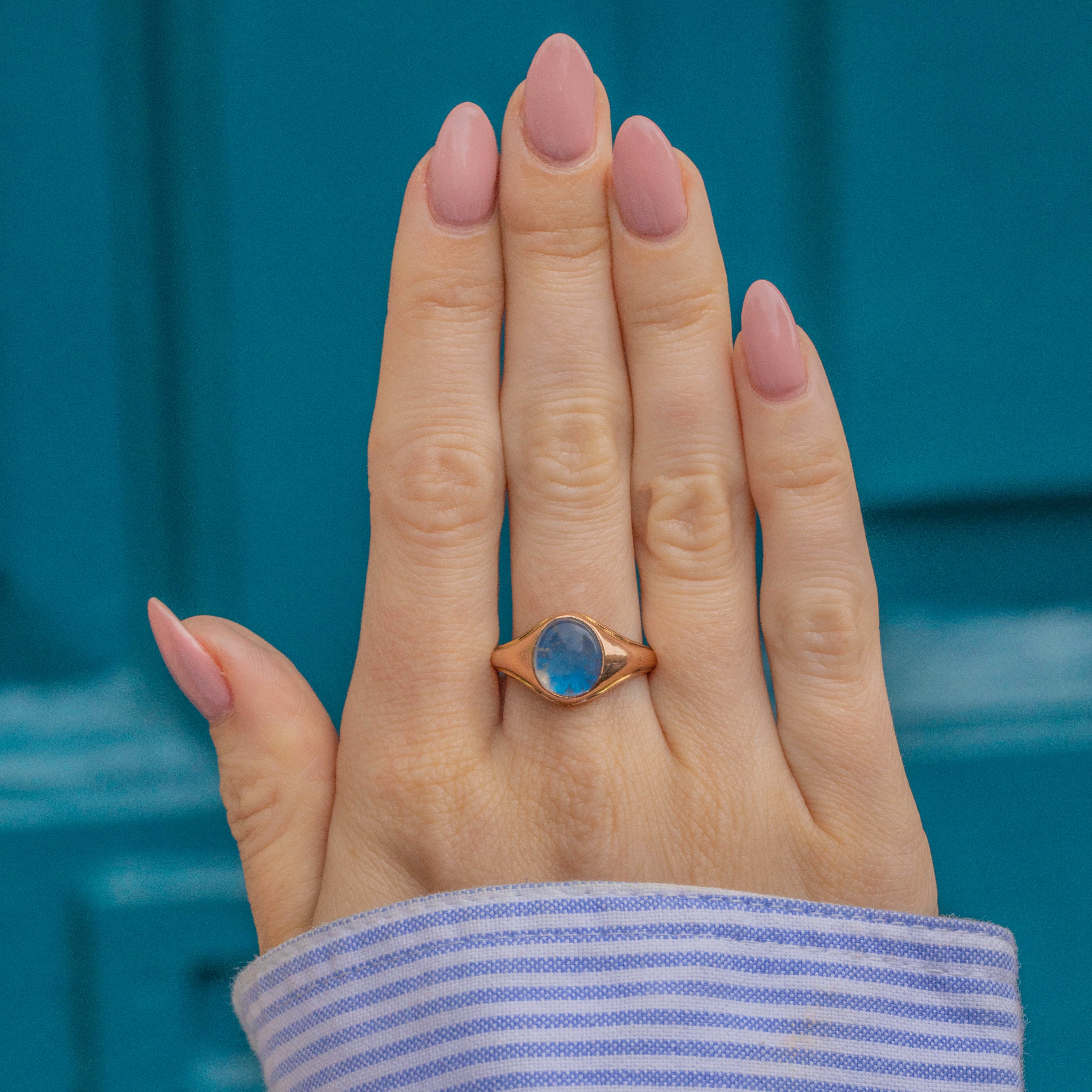 Bring statement into your every day with this antique 15ct Gold foiled Moonstone signet ring! With an impressive foiled back, her 1.75ct Moonstone emanates a deep sea glow with cerulean flashes, embraced by solid, sun-kissed 15ct Gold for a striking contrast.