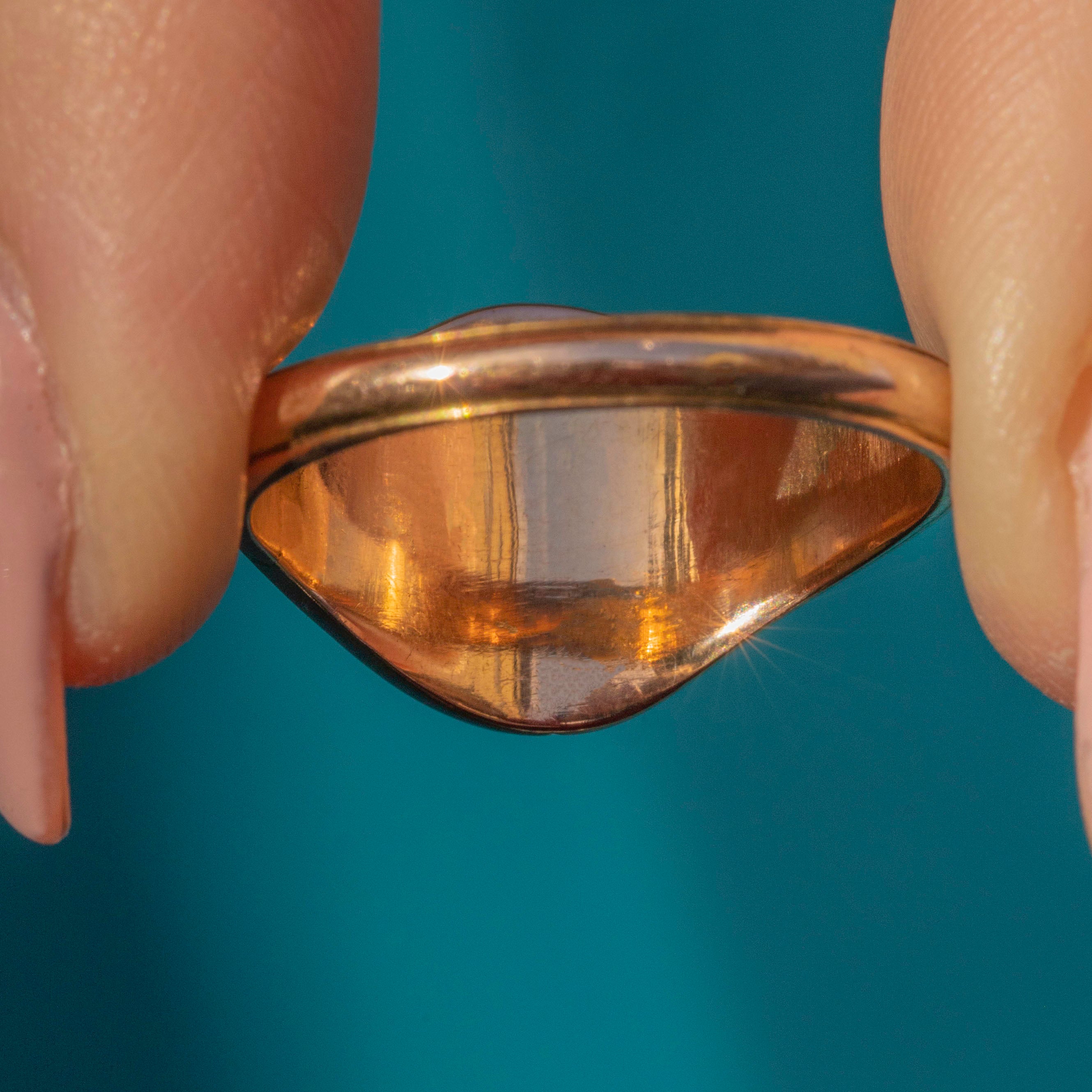 VERY GOOD. This antique 15ct Gold foiled Moonstone signet ring is in very good condition! The Moonstone sits securely within its bezel setting, free from any damage to note with the foiled back remaining intact. The 15ct Gold has a rich, rosy satuation throughout and being solid throughout, makes for a sturdy ring choice. There is a solder join mark on one of the shoulders and on the back of the band, but rest assured this cannot be seen when worn. We will be sad to see this mystical Moonstone ring go!