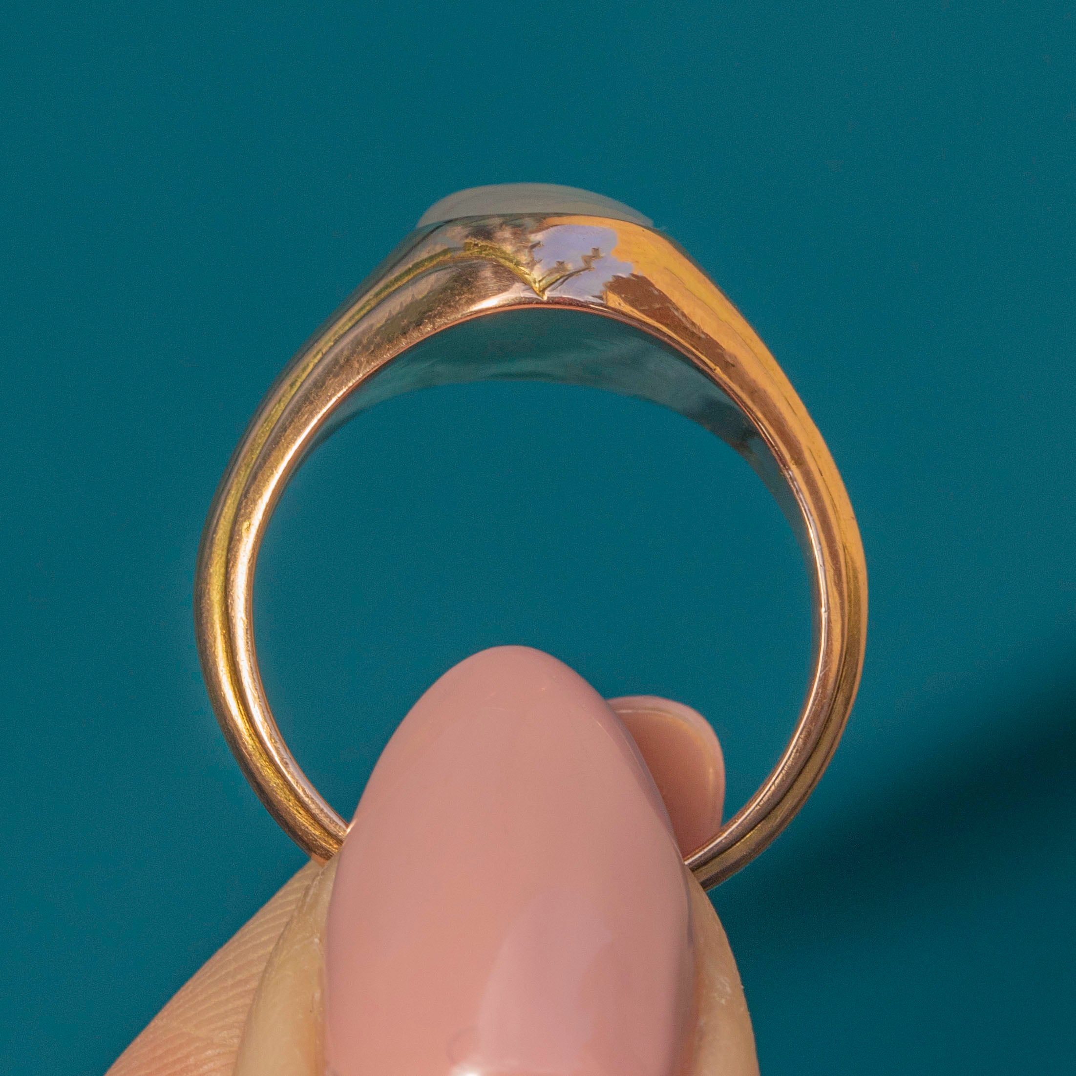 The Moonstone sits into the 15ct Gold so the curve of her cabochon is perfectly met by her shoulders, creating a smooth surface as you run your fingers across; a more functional design for those who would want to wear this Victorian Moonstone ring regularly.
