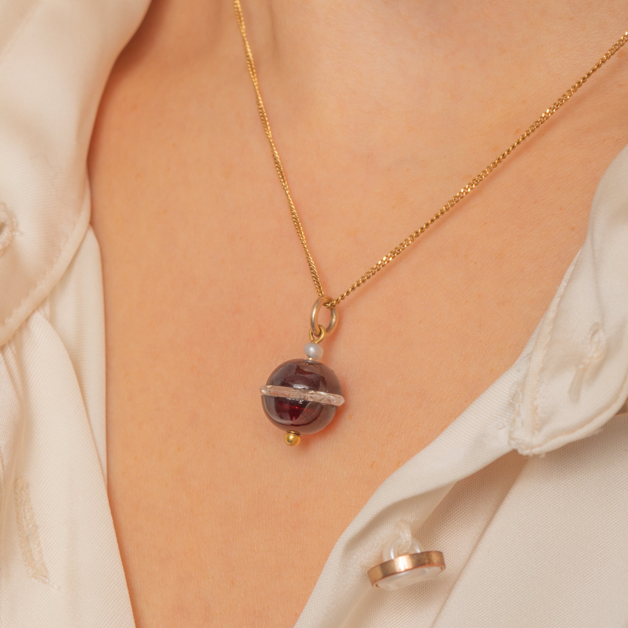 A charming Victorian “Saturn” orb pendant, this petite treasure marries a deep wine-red Garnet sphere with a twinkling band of Rock Crystal. Suspended on a 15ct Gold jump ring with a delicate Gold finial, the orb is capped by a tiny white Pearl spacer, lending a refined, antique poise.