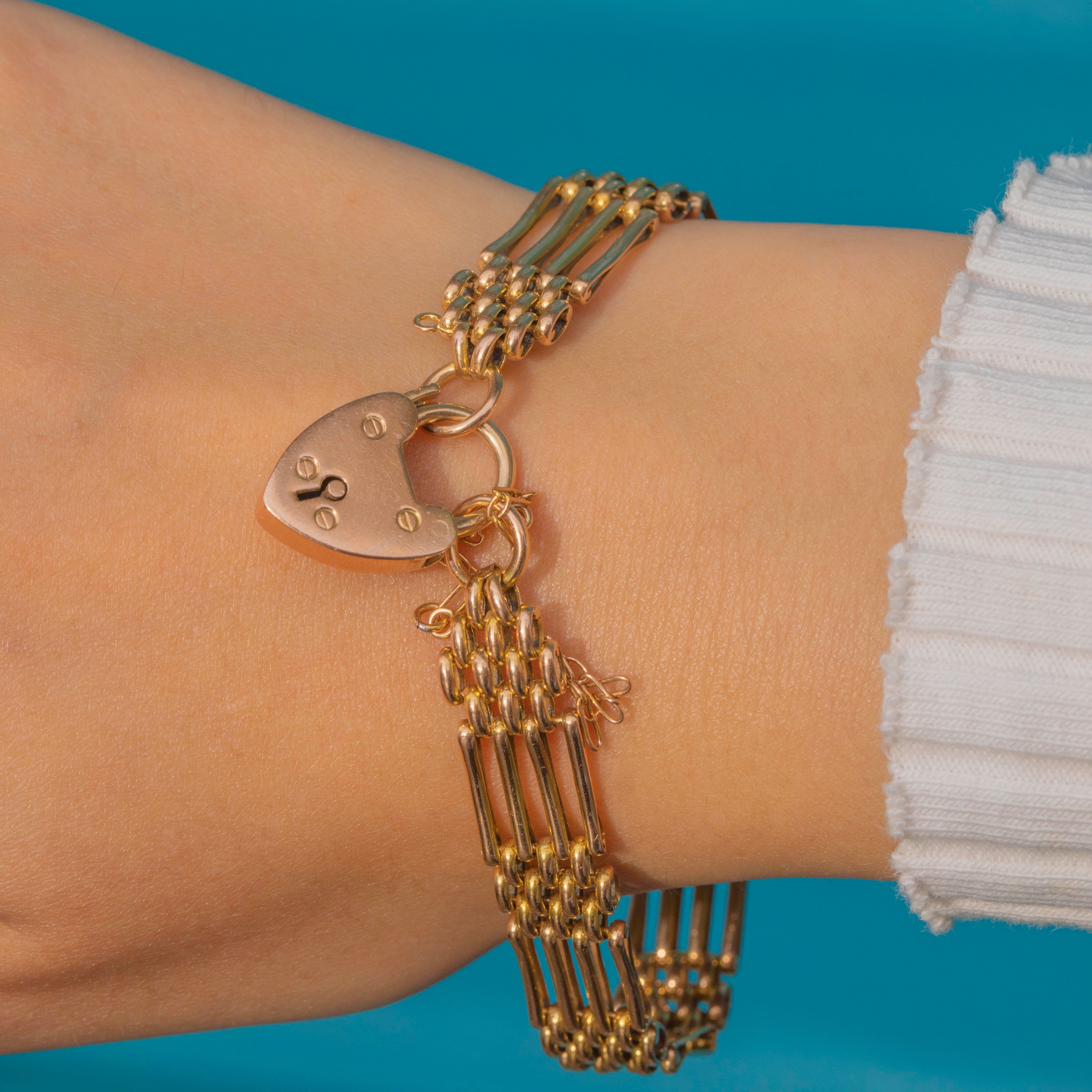 A superb Antique Victorian gate bracelet crafted in solid 15ct Gold, finished with a romantic heart padlock clasp. The classic multi-bar gate design offers both strength and elegance, with beautifully interlinked sections that drape fluidly around the wrist. A traditional symbol of love and commitment, the heart padlock clasp adds a sentimental touch and is fully functional.