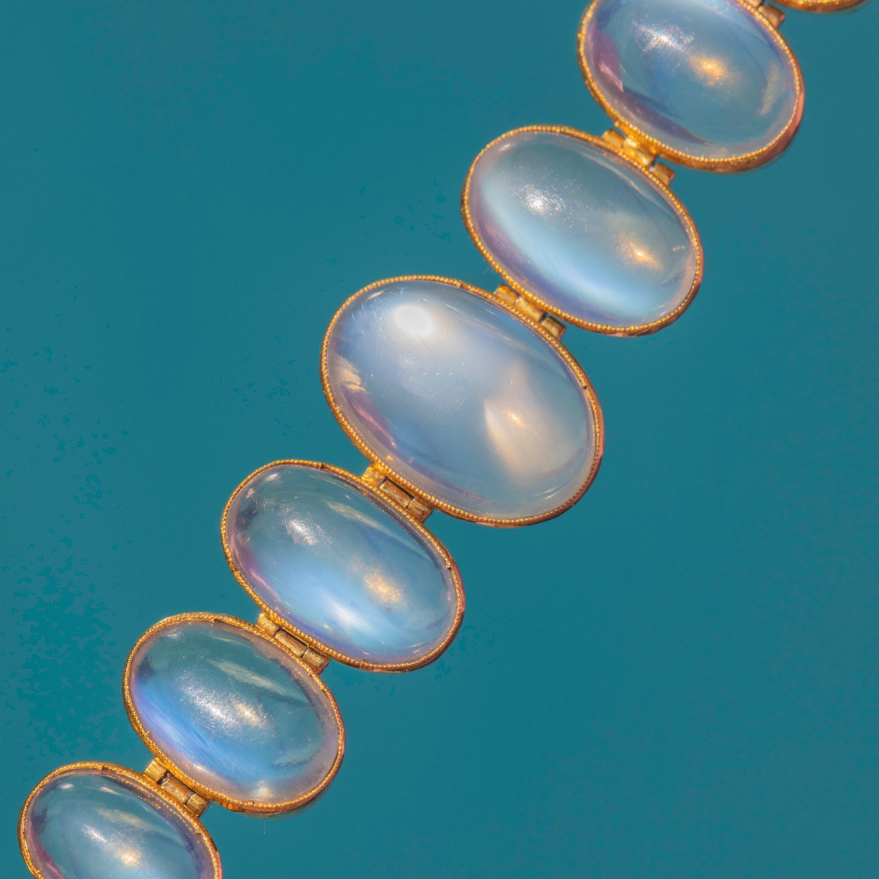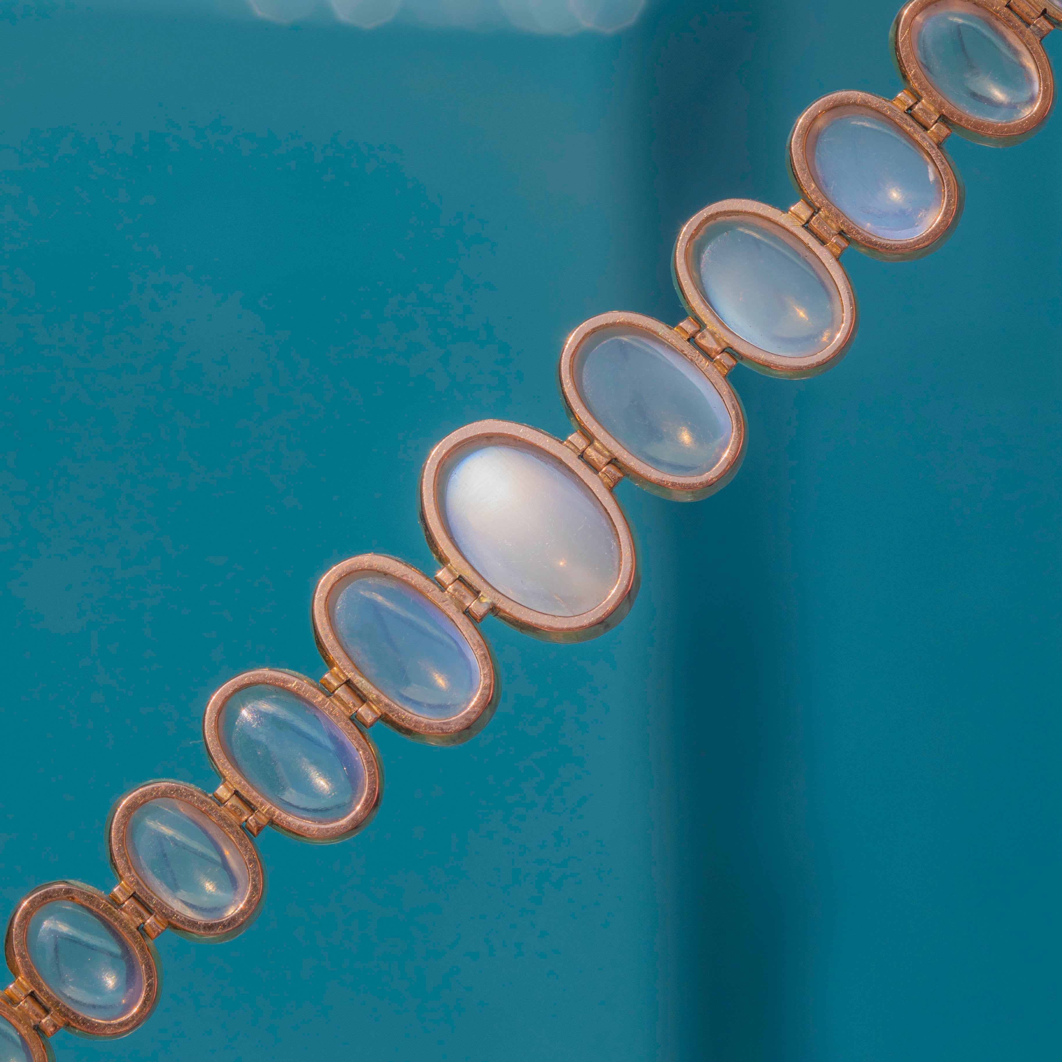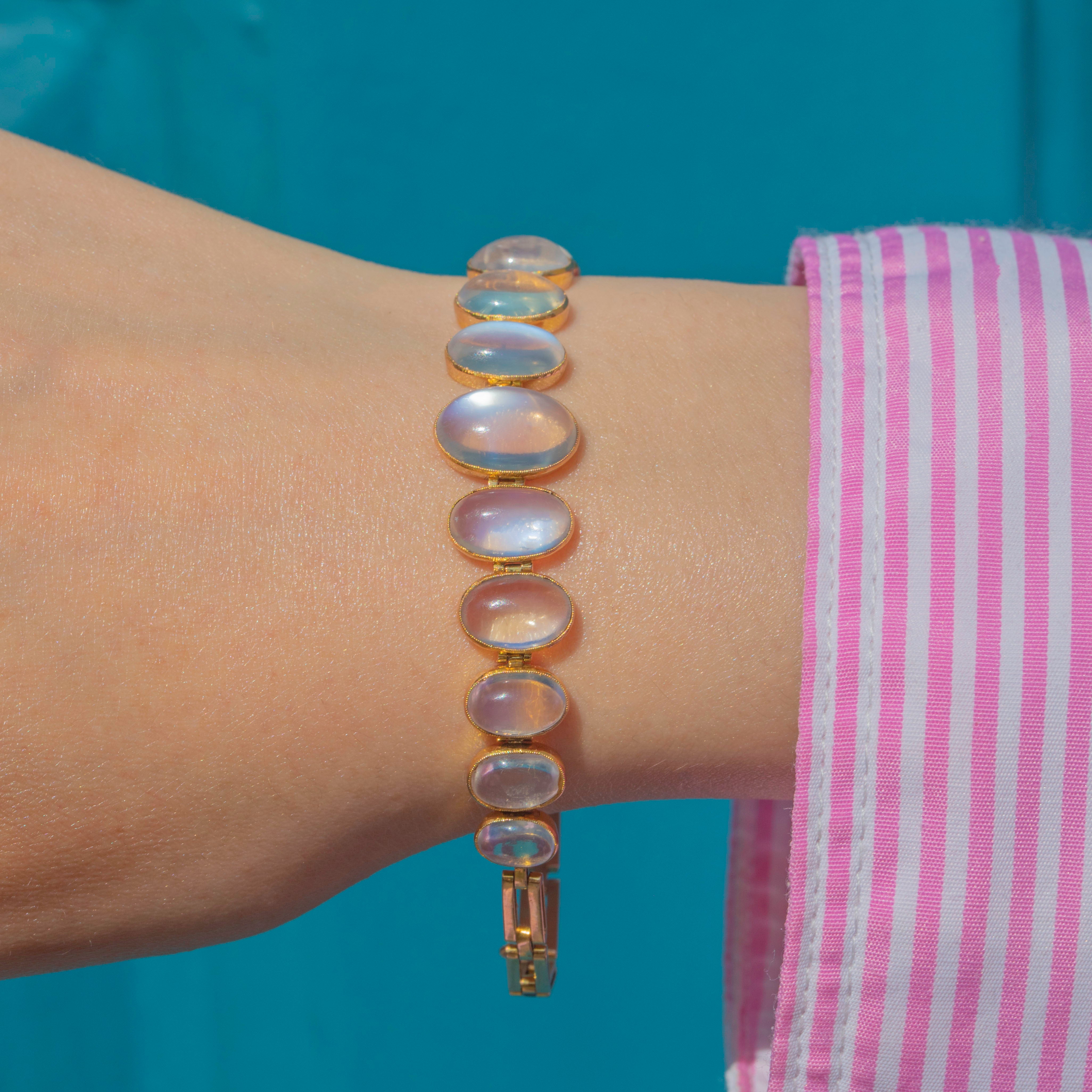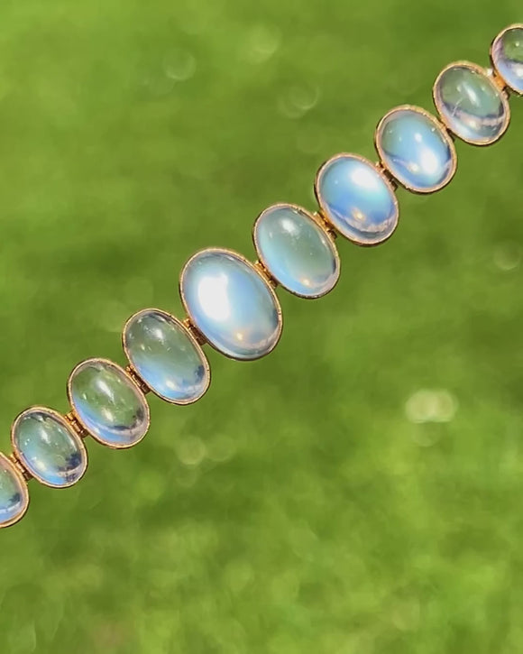 Behold the sheer beauty of this antique 15ct Gold graduating Moonstone bracelet! Boasting eleven graduating Moonstones, with a combined carat weight of 8.30ct, each celestial stone possess a soft blue schiller billowing across their smooth cabochon cut.