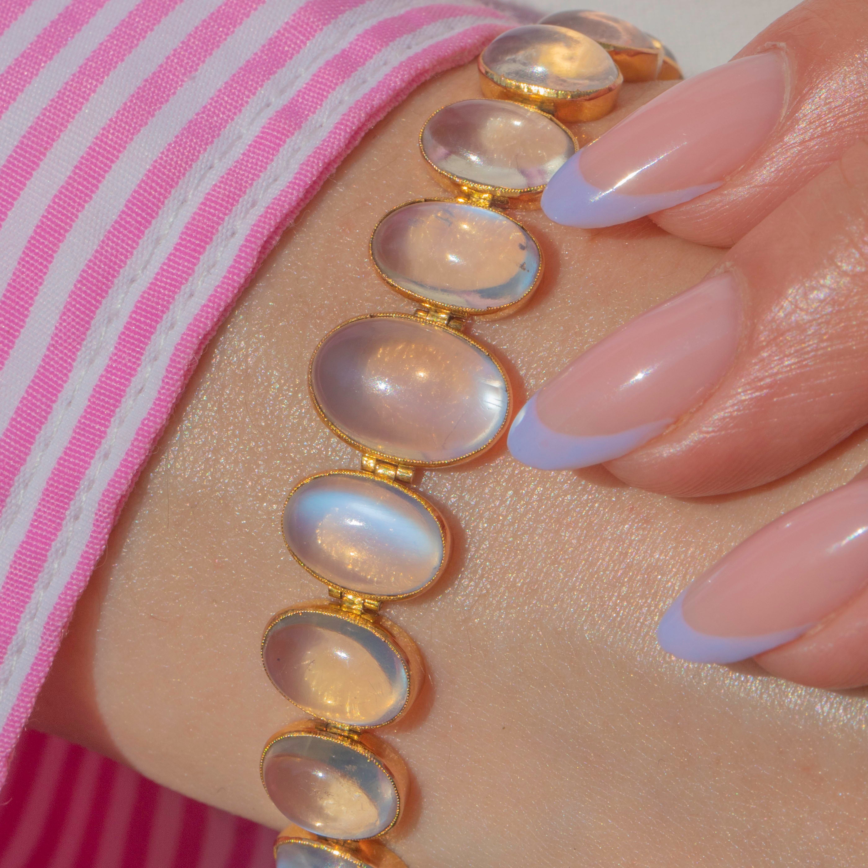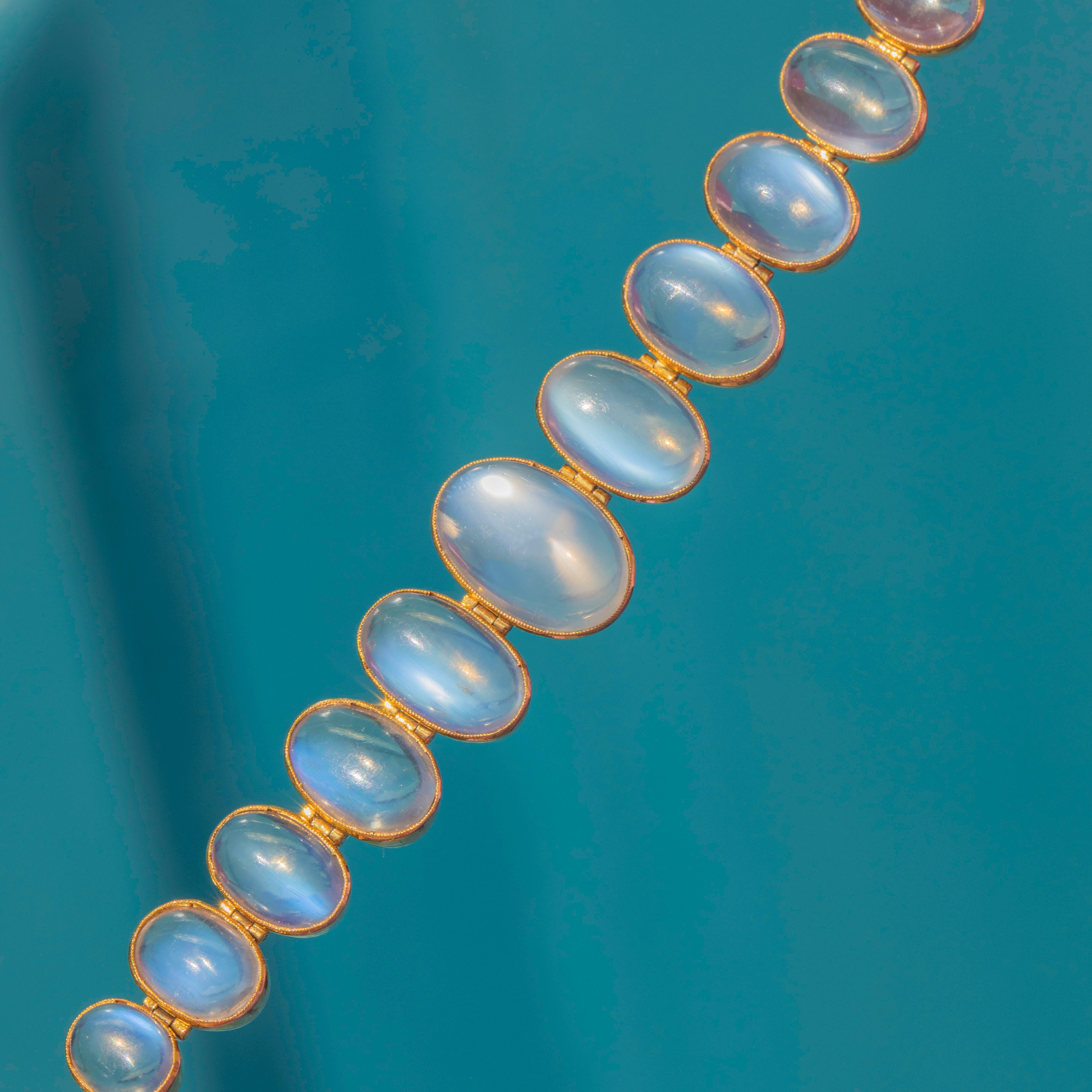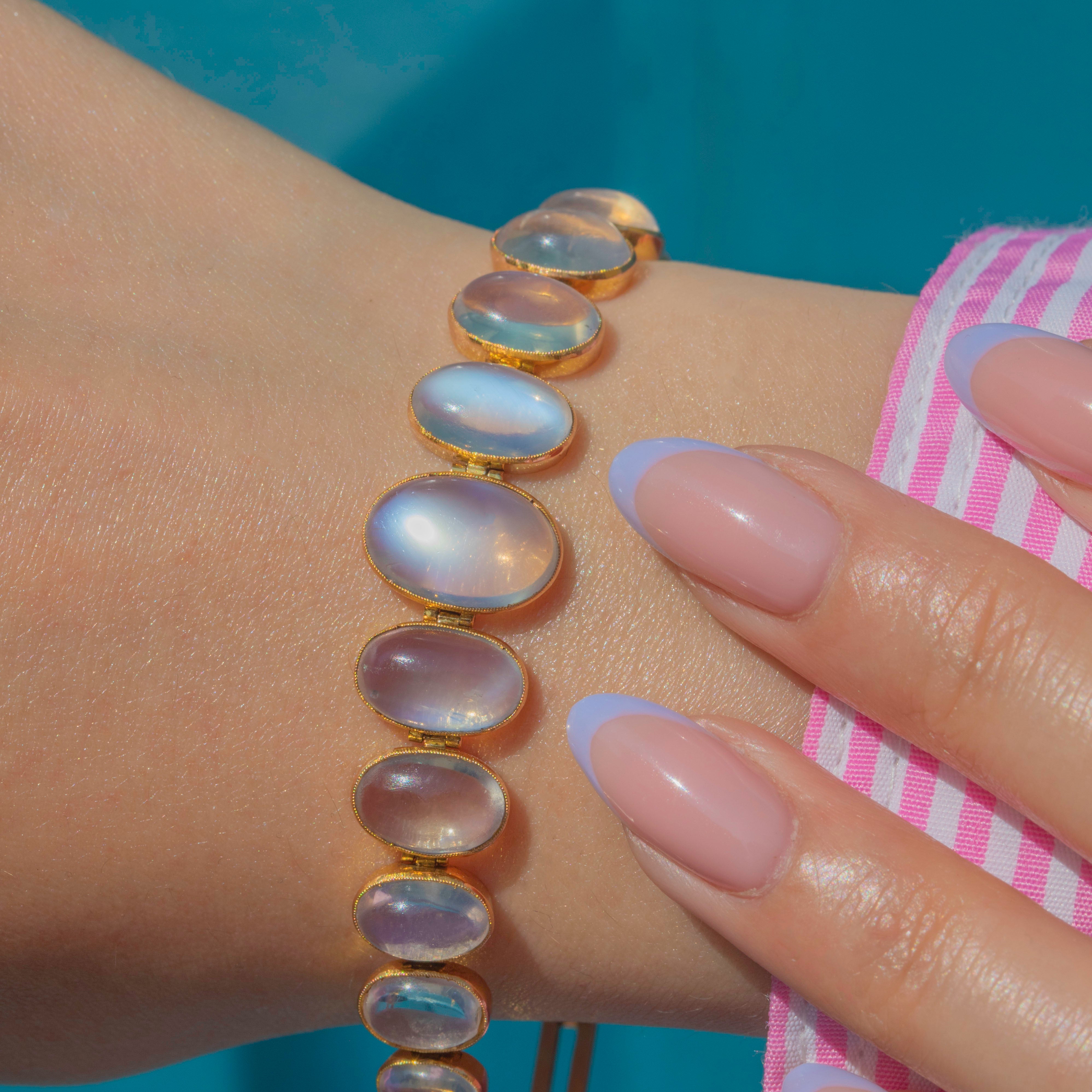 Behold the sheer beauty of this antique 15ct Gold graduating Moonstone bracelet! Boasting eleven graduating Moonstones, with a combined carat weight of 8.30ct, each celestial stone possess a soft blue schiller billowing across their smooth cabochon cut.