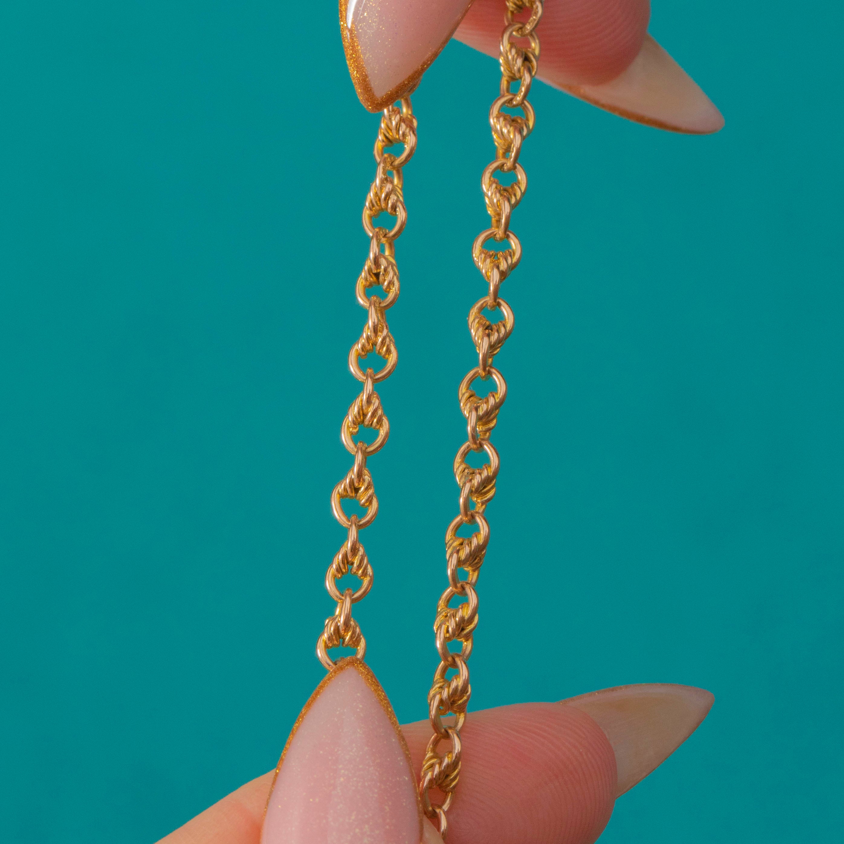 A stunning antique 15ct Gold lover’s knot chain from the Victorian era. This elegant piece features intricate interlocking links, each beautifully formed and finished with a rich golden hue.